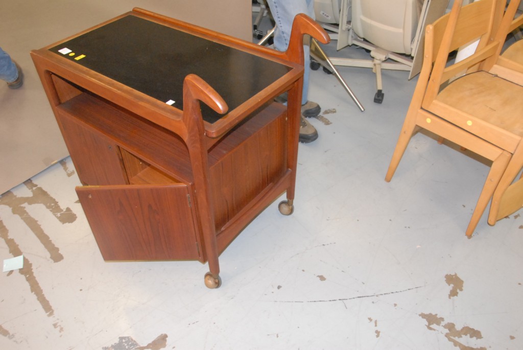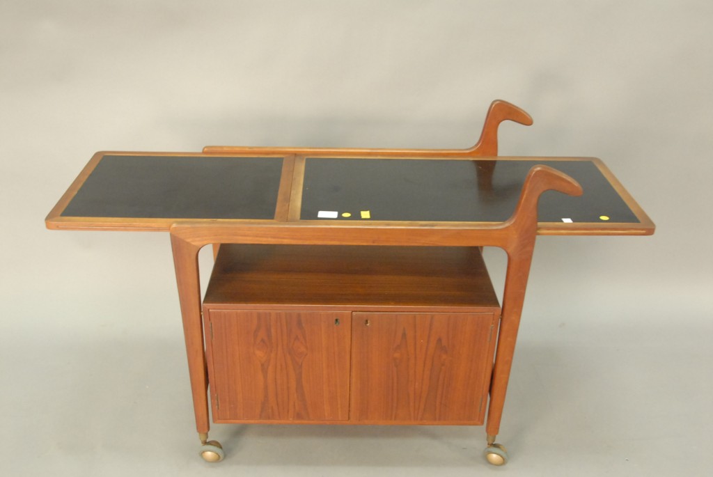 Lot 224: Teak Danish modern teacart with inserts, ht. 35, lg. 37 plus drop leaf.