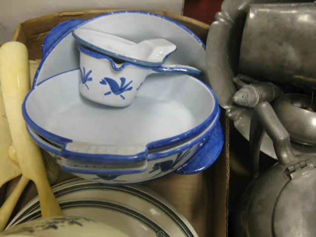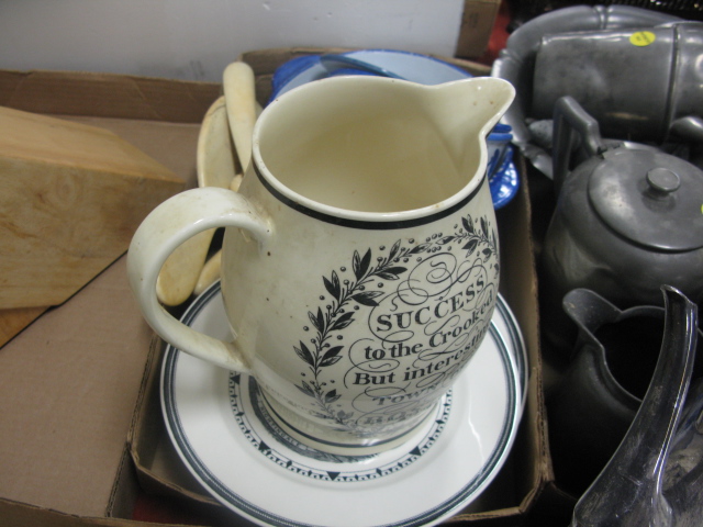 Three box lots to include Cauldon china, two stems, small grouping of sterling silver salts, ivory dresser parts, set of wedgwood plates, iron cookware and a pitcher