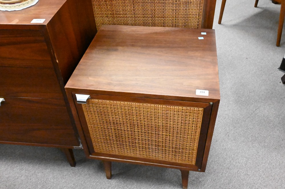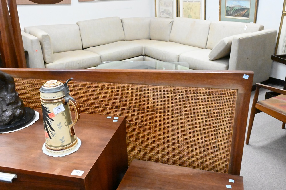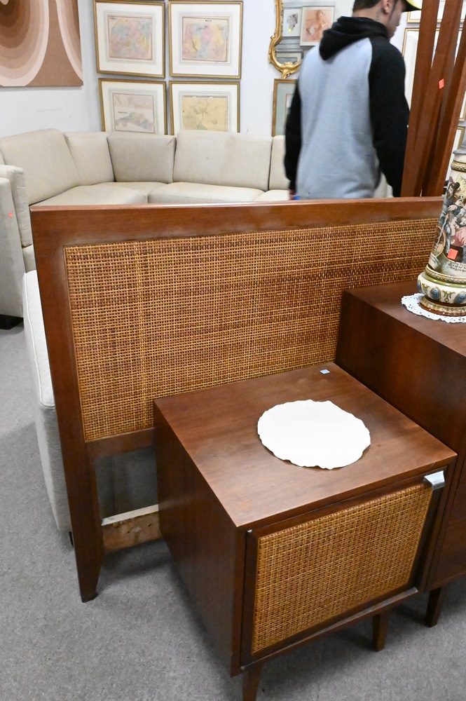 Lot 224: Three Piece Bedroom Set, to include caned bed stands in Jen Risom style, height 24 inches, length 20 inches, width 18 inches; along with matching king sized shaped headboard.