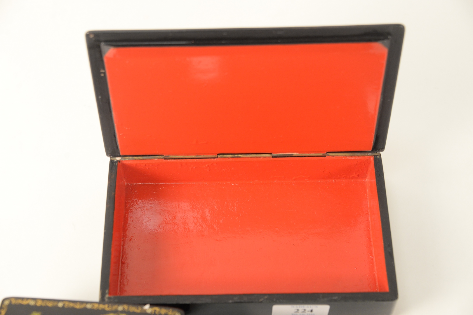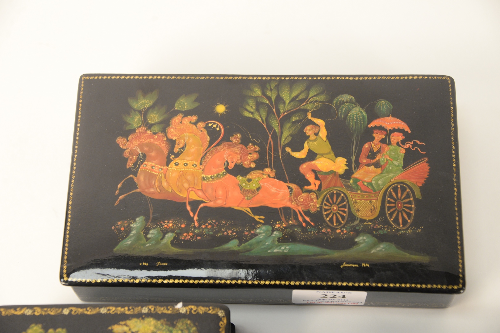 Lot 224: Three Russian Lacquer Boxes, having legends and fairy tale motif, manner of Palekh School, one with horses and carriage, marked 1874, one having galloping horse with two figures (prince and princess), marked 1953, signed illegibly; along with a rectangle having three horses, marked Komek, signed illegibly, height 1 1/4 inches, largest 4 3/4″ x 8″. Provenance: The Estate of Alina Roisen, Park Avenue, New York.