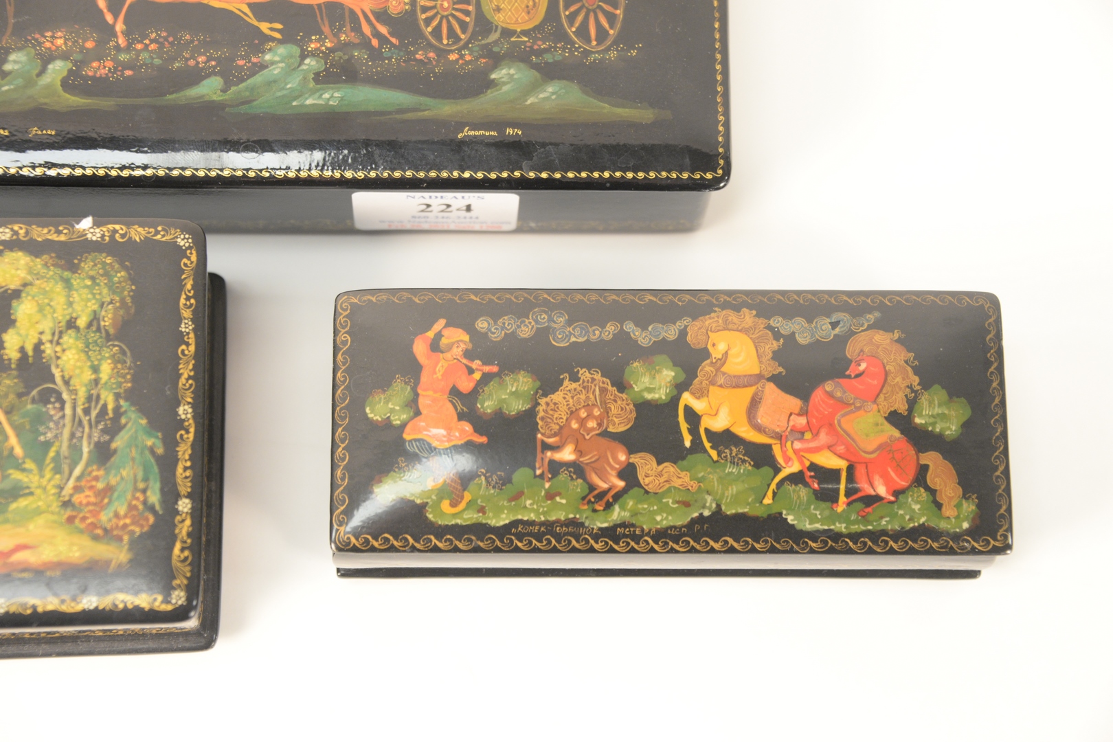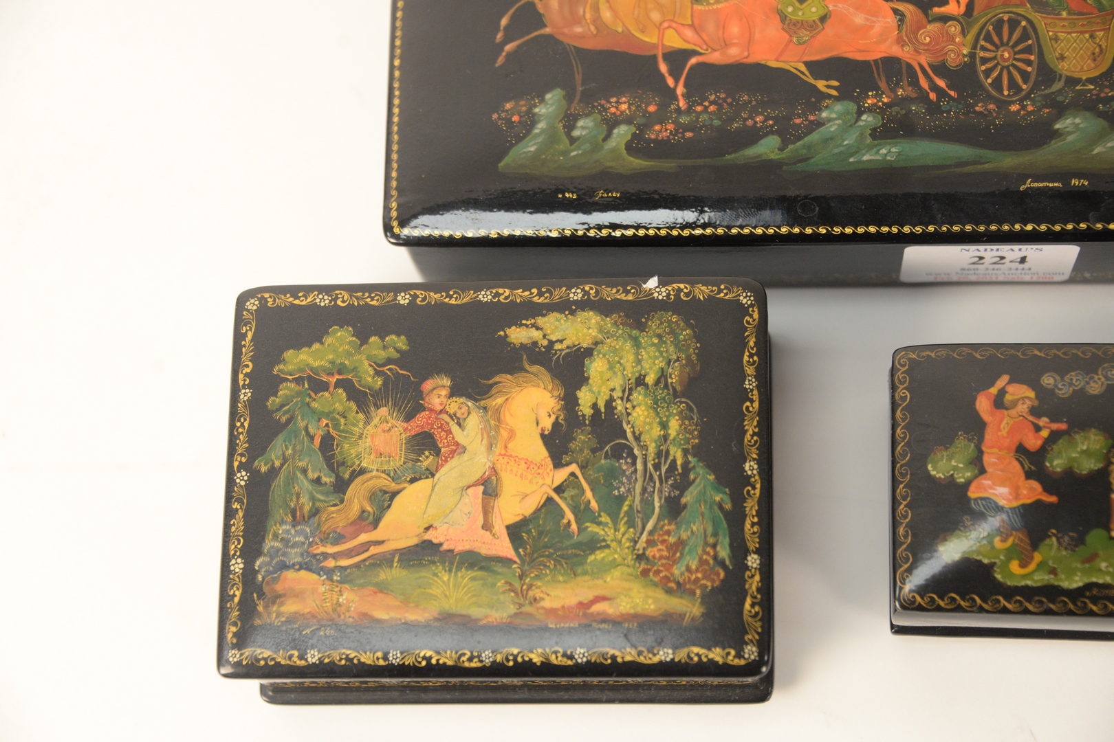 Three Russian Lacquer Boxes, having legends and fairy tale motif, manner of Palekh School, one with horses and carriage, marked 1874, one having galloping horse with two figures (prince and princess), marked 1953, signed illegibly; along with a rectangle having three horses, marked Komek, signed illegibly, height 1 1/4 inches, largest 4 3/4″ x 8″. Provenance: The Estate of Alina Roisen, Park Avenue, New York.