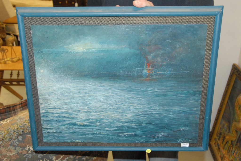 Two oil on board paintings of Airplanes, one going into water, both signed Peter Prange.