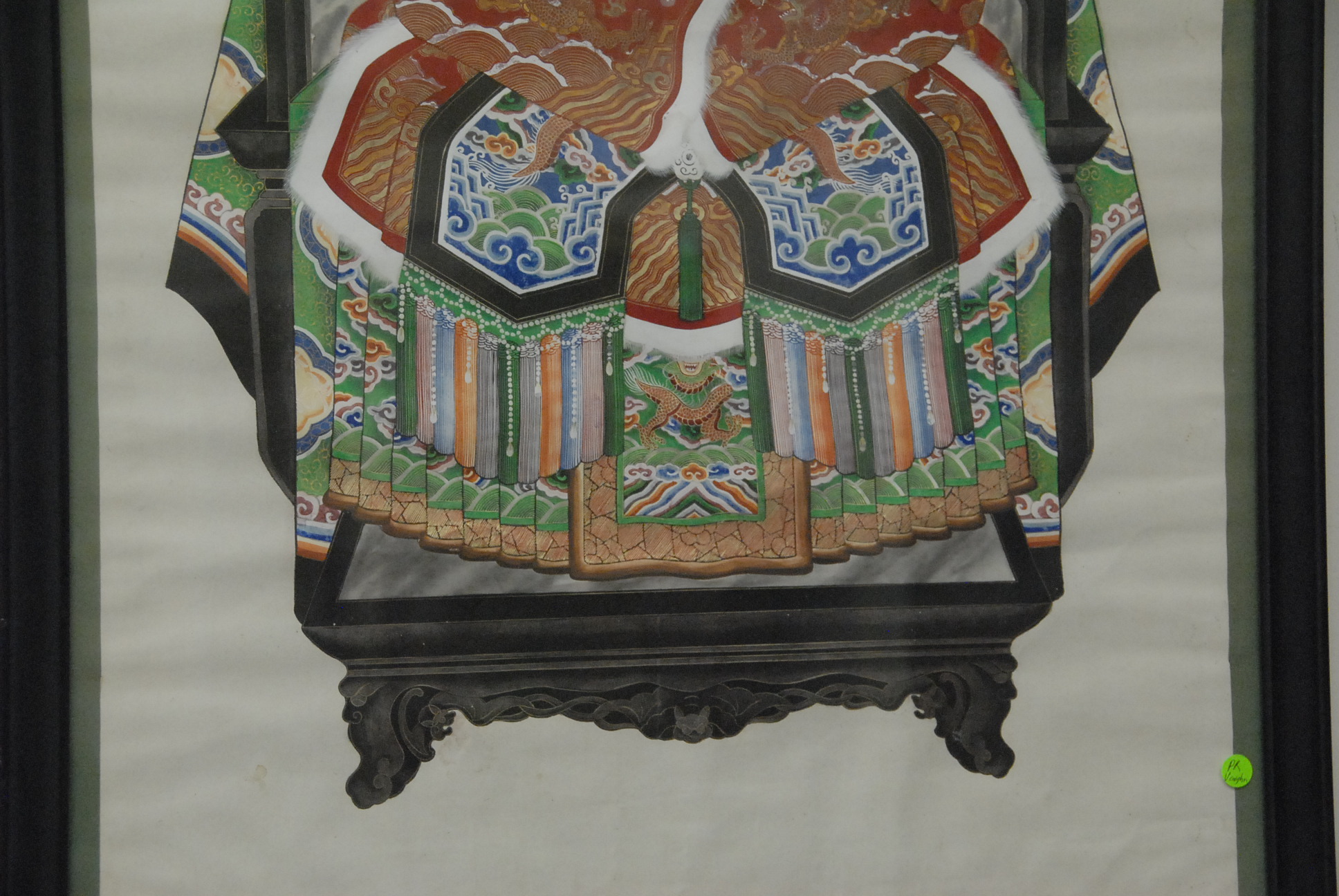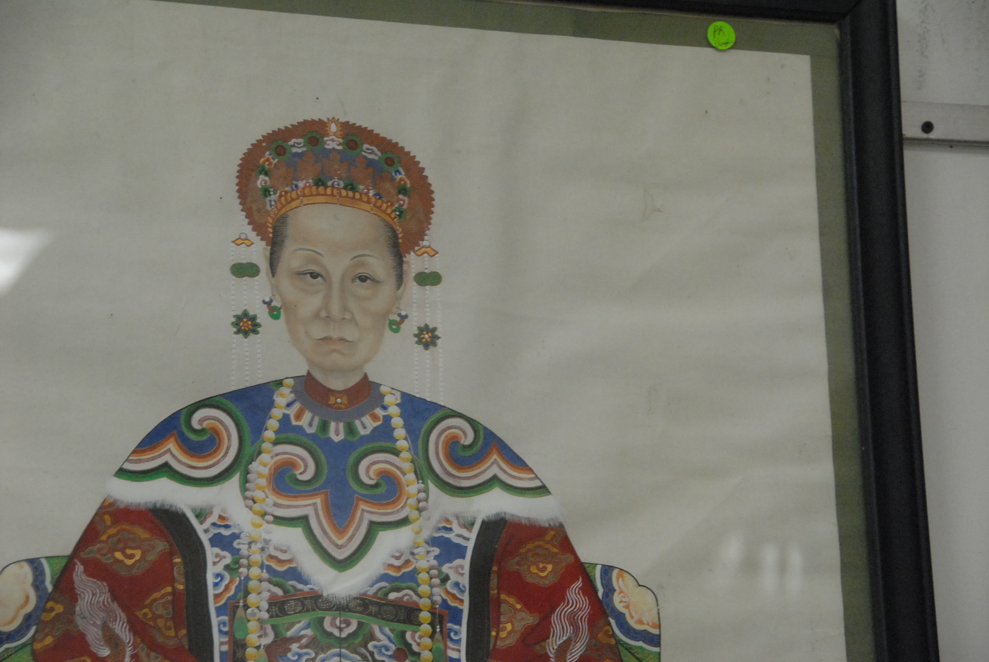 Three framed Oriental pieces to include a framed water color of an empress, watercolor of fruit and leaves, and a silk needlework.