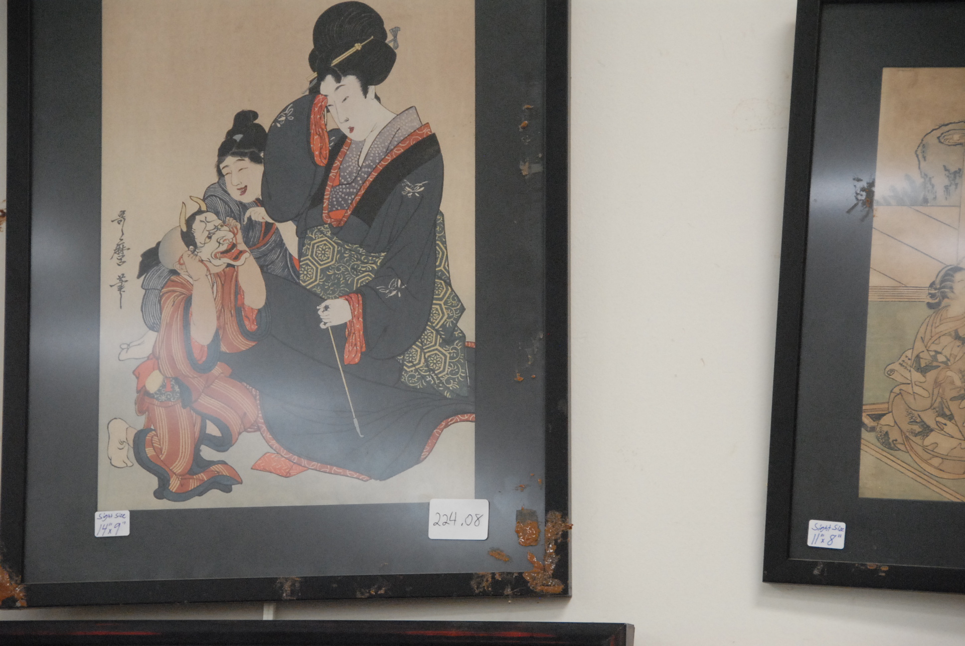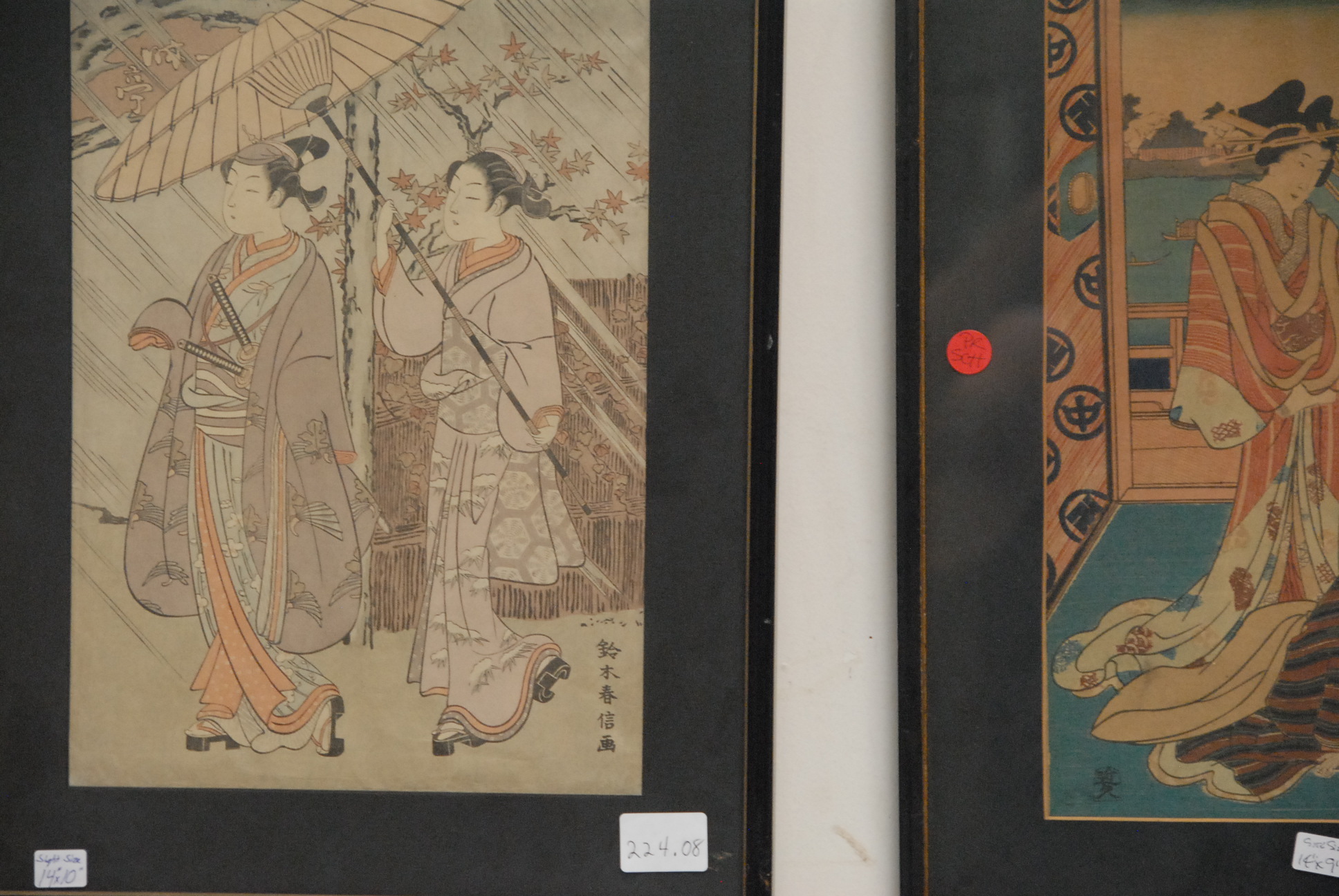 Group of six Japanese wood blocks: pair of lovers, tryptich, puppeteer manipulating a Bunraki puppet, servent walking behind Samurai holding umbrella, Chushingura, and Kokei No Sancho: Taa Yuamming signed Utamaro Hitso.