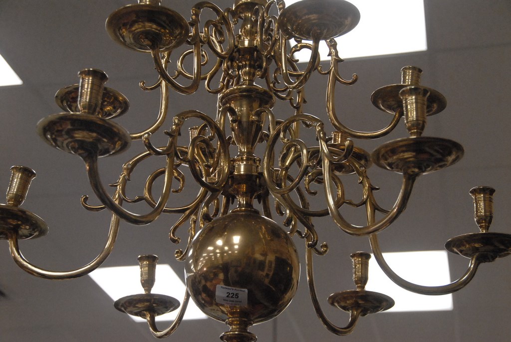 Lot 225: Continental brass hanging light with two tiers of six each candle holders, 19th century. ht. 27in. wd. 27in.