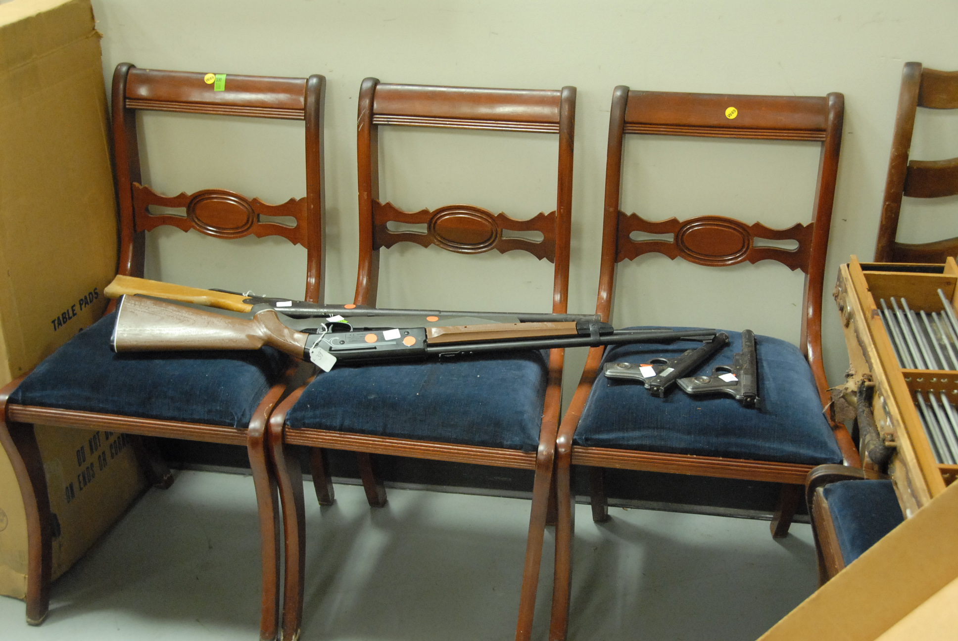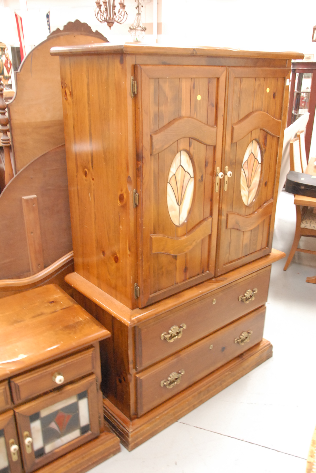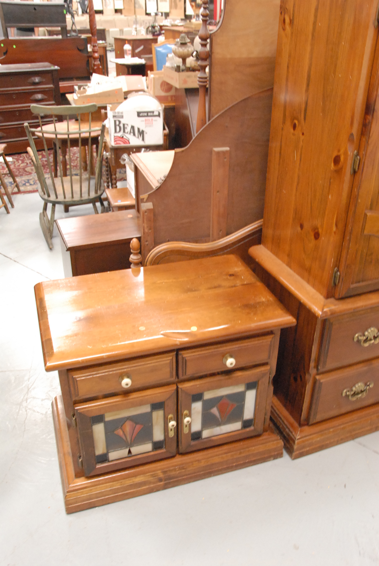Eleven piece lot of furniture to include a pine tall chest, dresser, mirror, two stands, a bed, a pine night stand, and five side chairs.