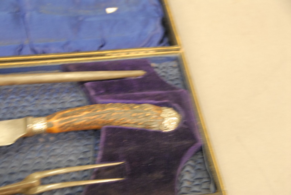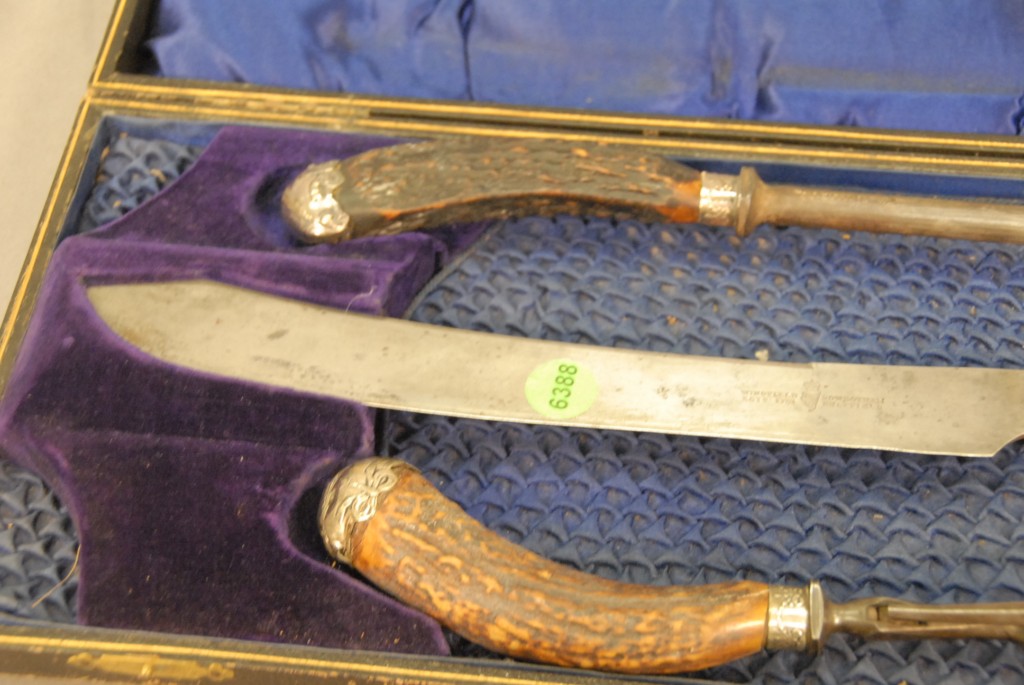 English cutlery set in fitted box with stag handles mounted with sterling in original box.