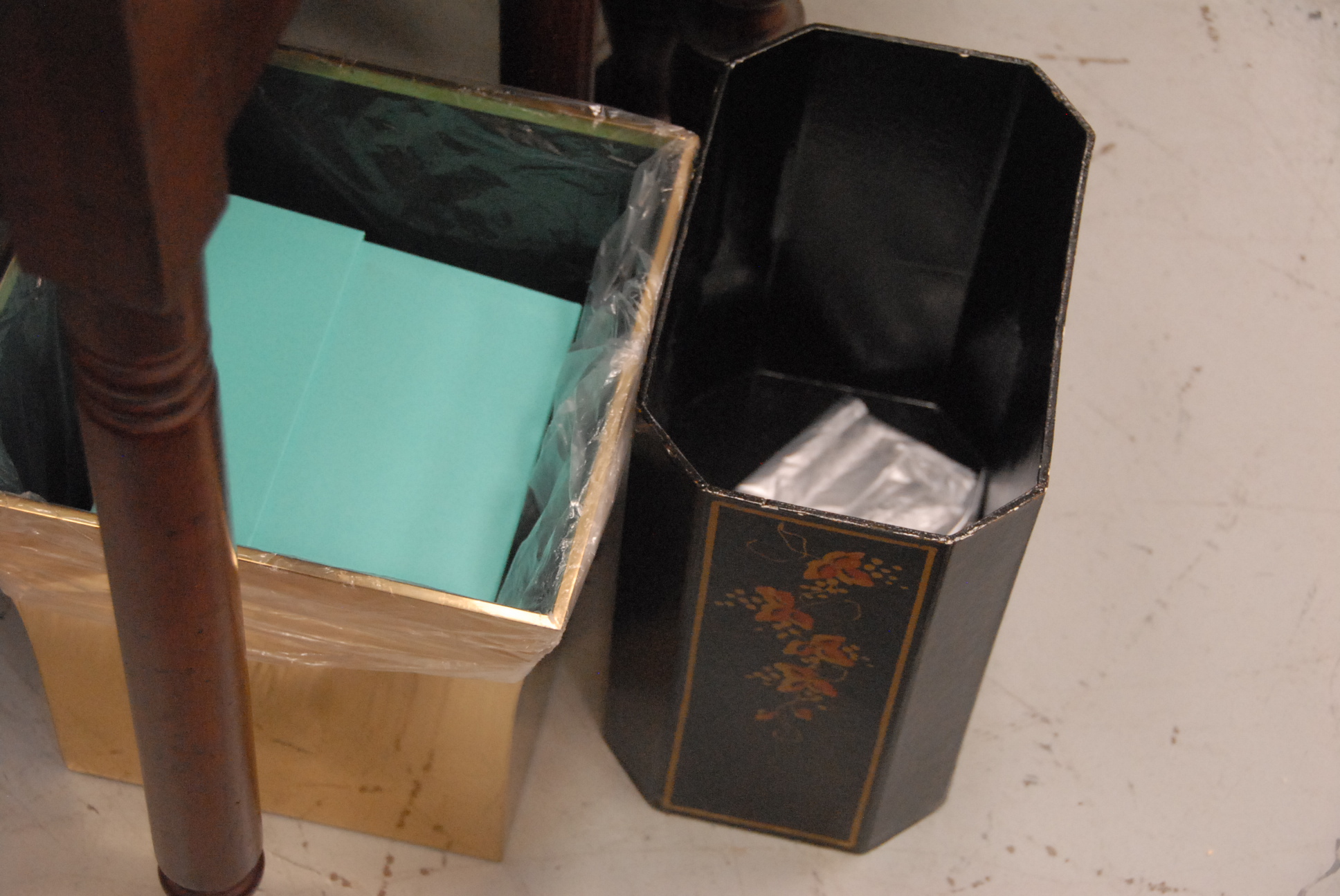 Group of bathroom fixtures to include two mirrors, three wastepaper baskets, tissue box, ashtrays, and group of brass knobs.