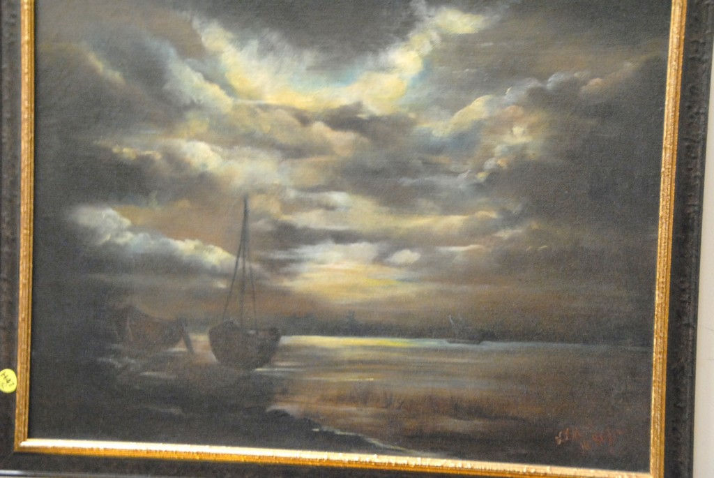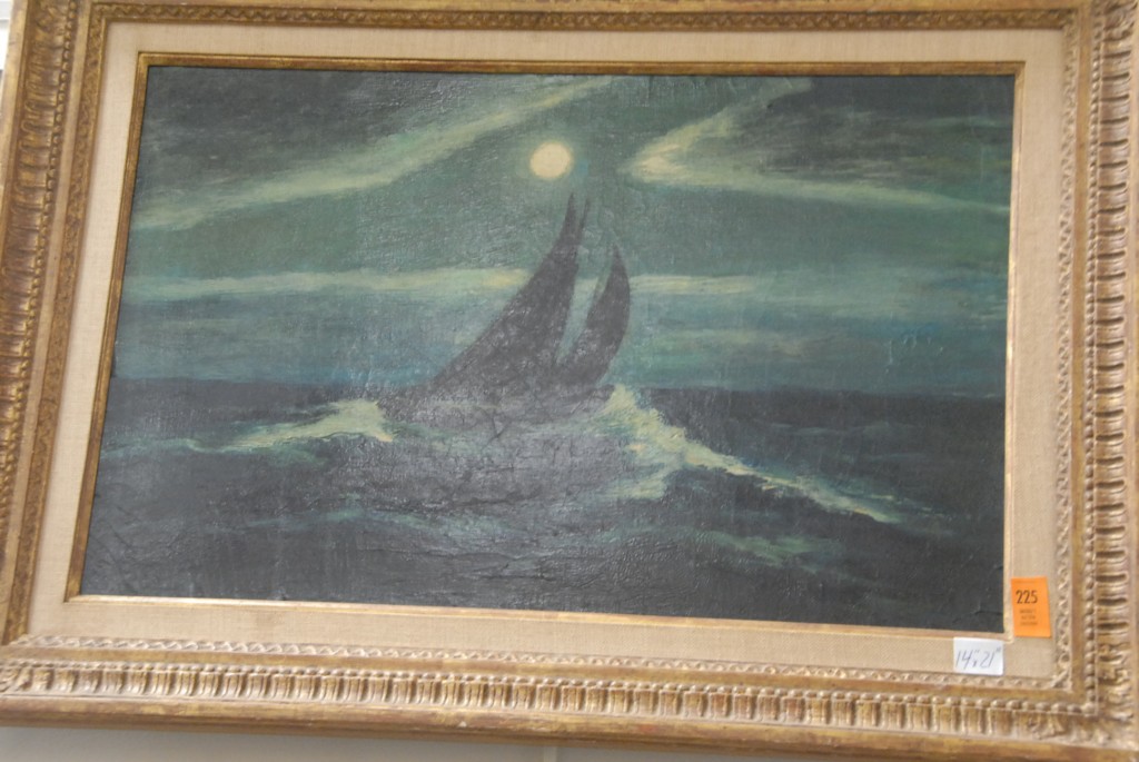 Group of three oil paintings one signed Ryder oil on canvas Night Sailing 14 x 21, oil on canvas Night Time Waters Edge signed indistinctly 16 x 29, and P. Mills Bulls 1 head 10 x 12 signed.