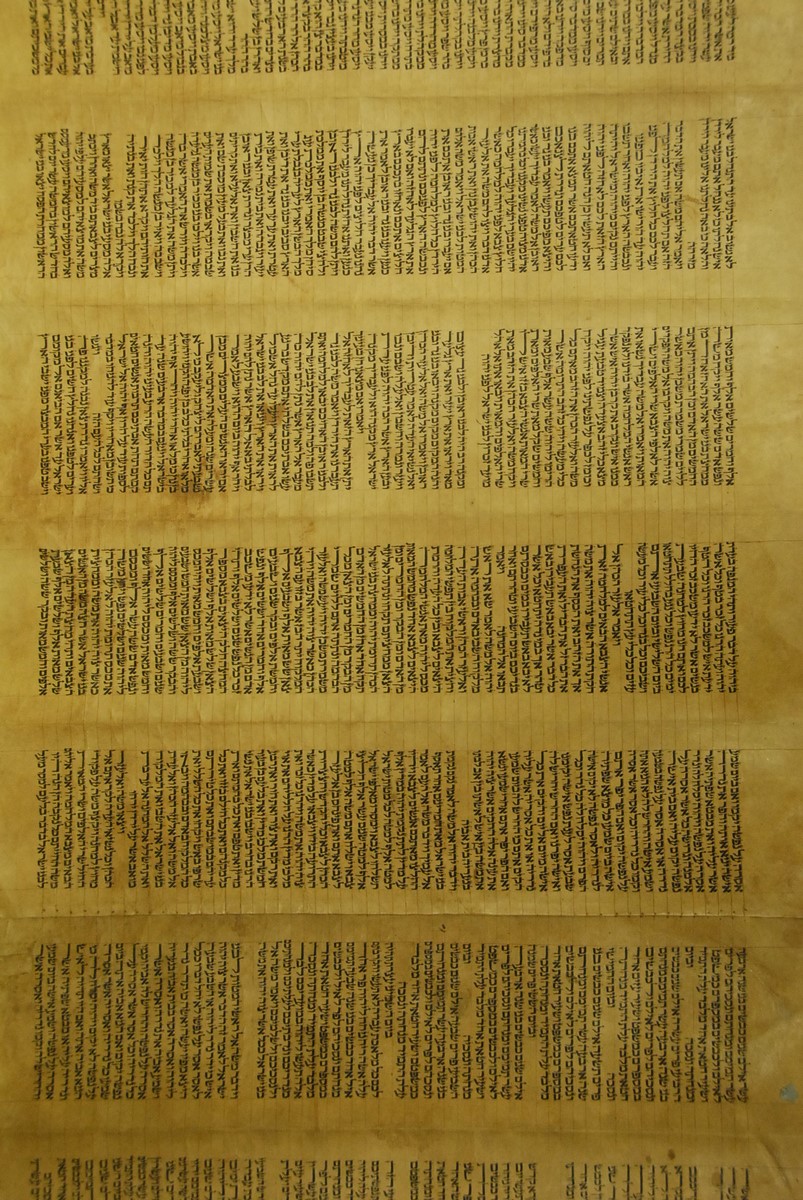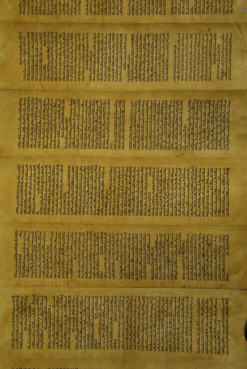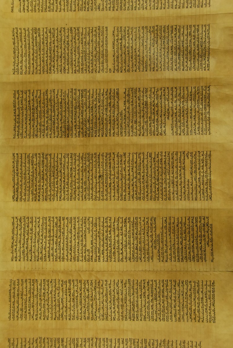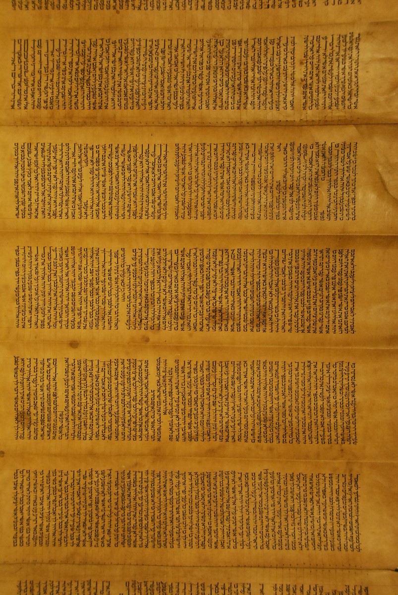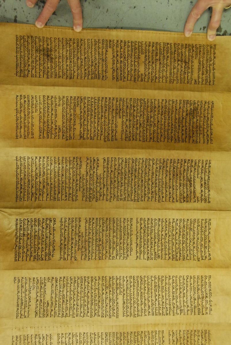 Hebrew Manuscript Partion of Pentateuch on hyde in custom leather covered tube, probably 17th/18th century. lg. 29 ft.