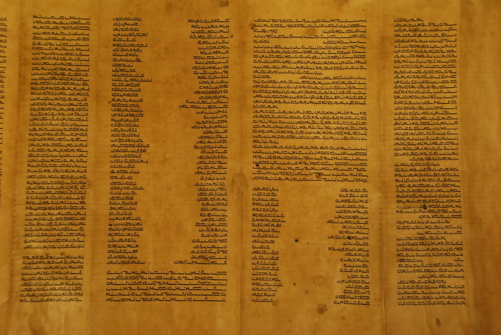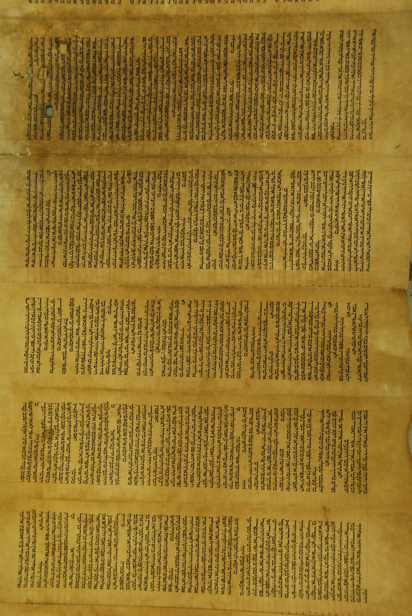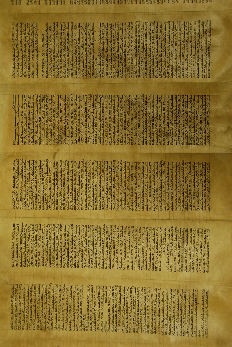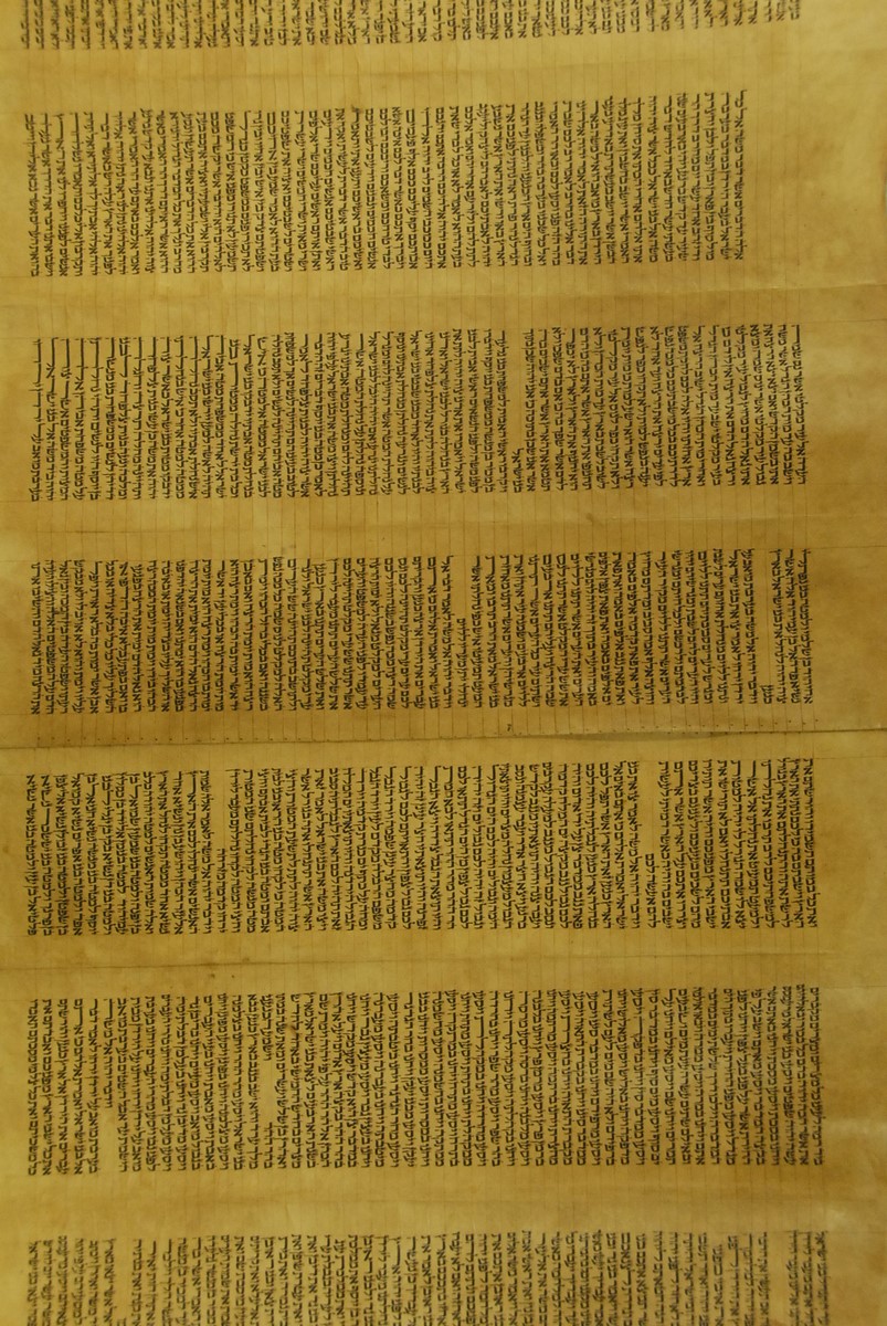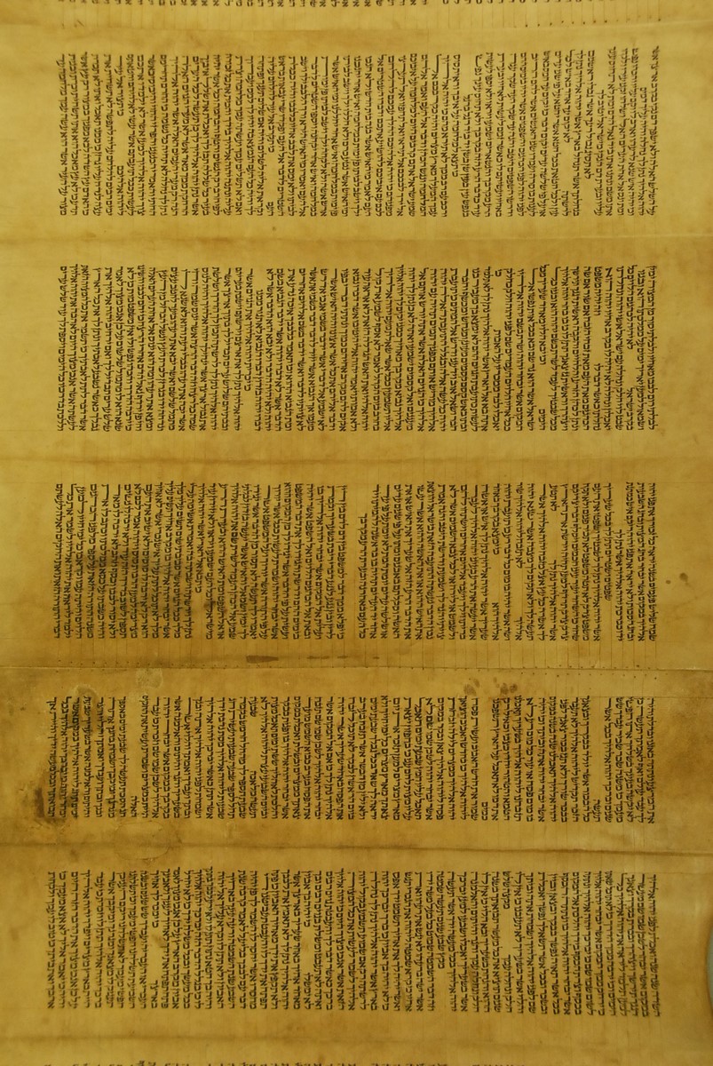 Hebrew Manuscript Partion of Pentateuch on hyde in custom leather covered tube, probably 17th/18th century. lg. 29 ft.