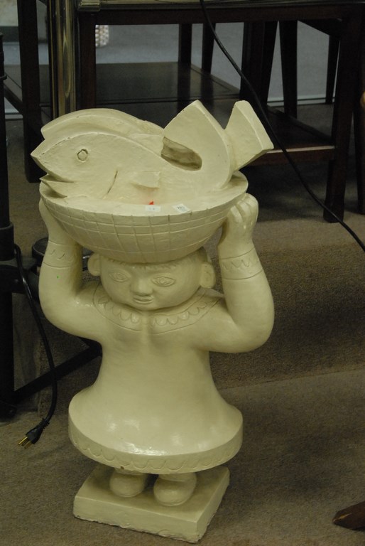 Lot 225: Large and whimsical wood sculpture of a round faced person in peasant costume attributed to Danish artist Bjorn Wiinblad 1918-2006.