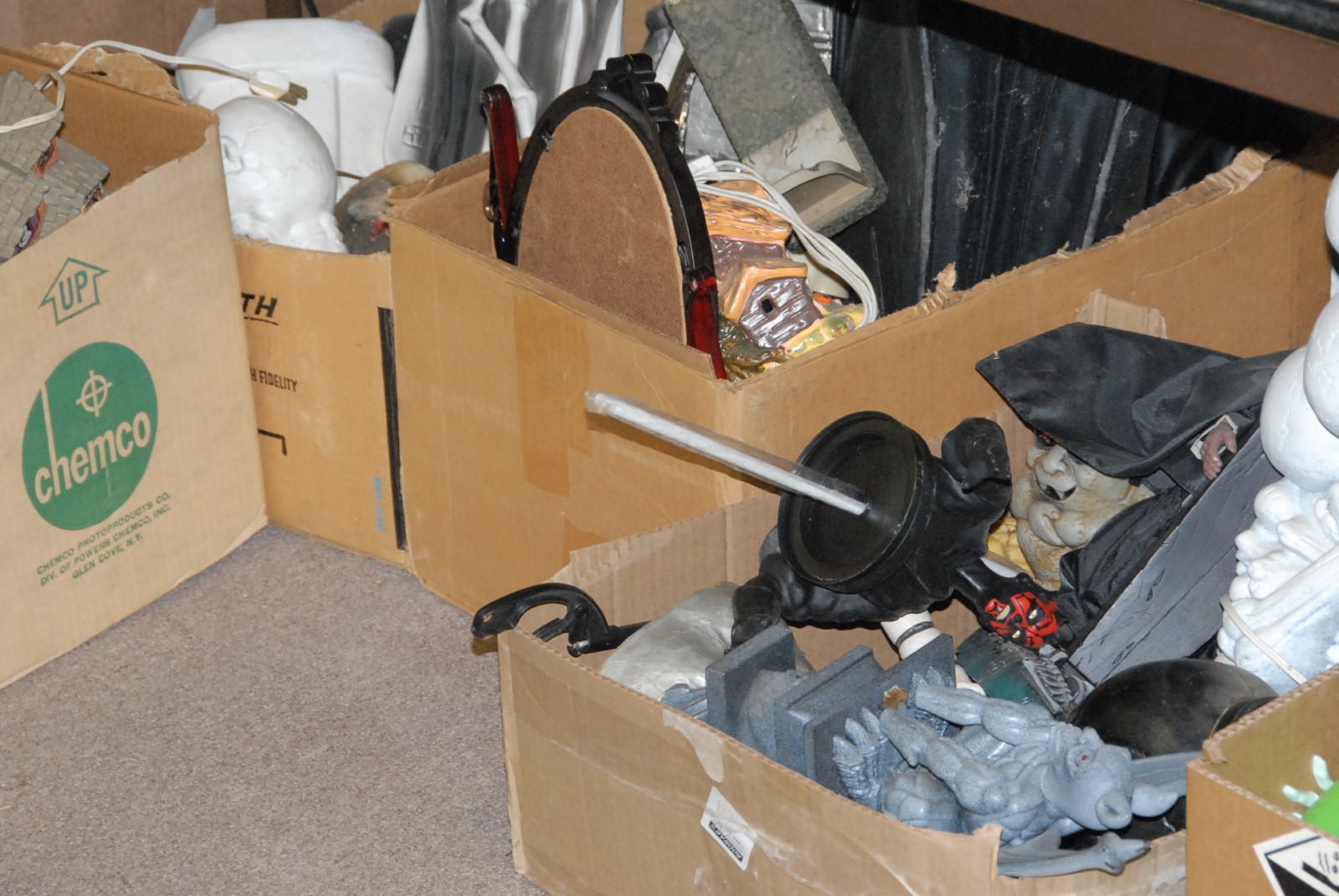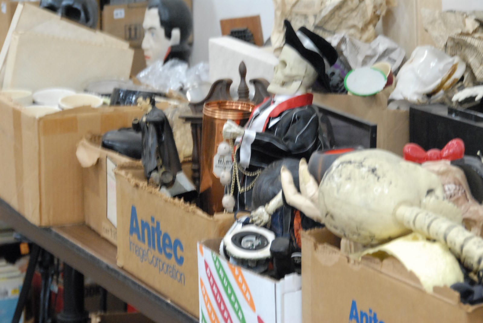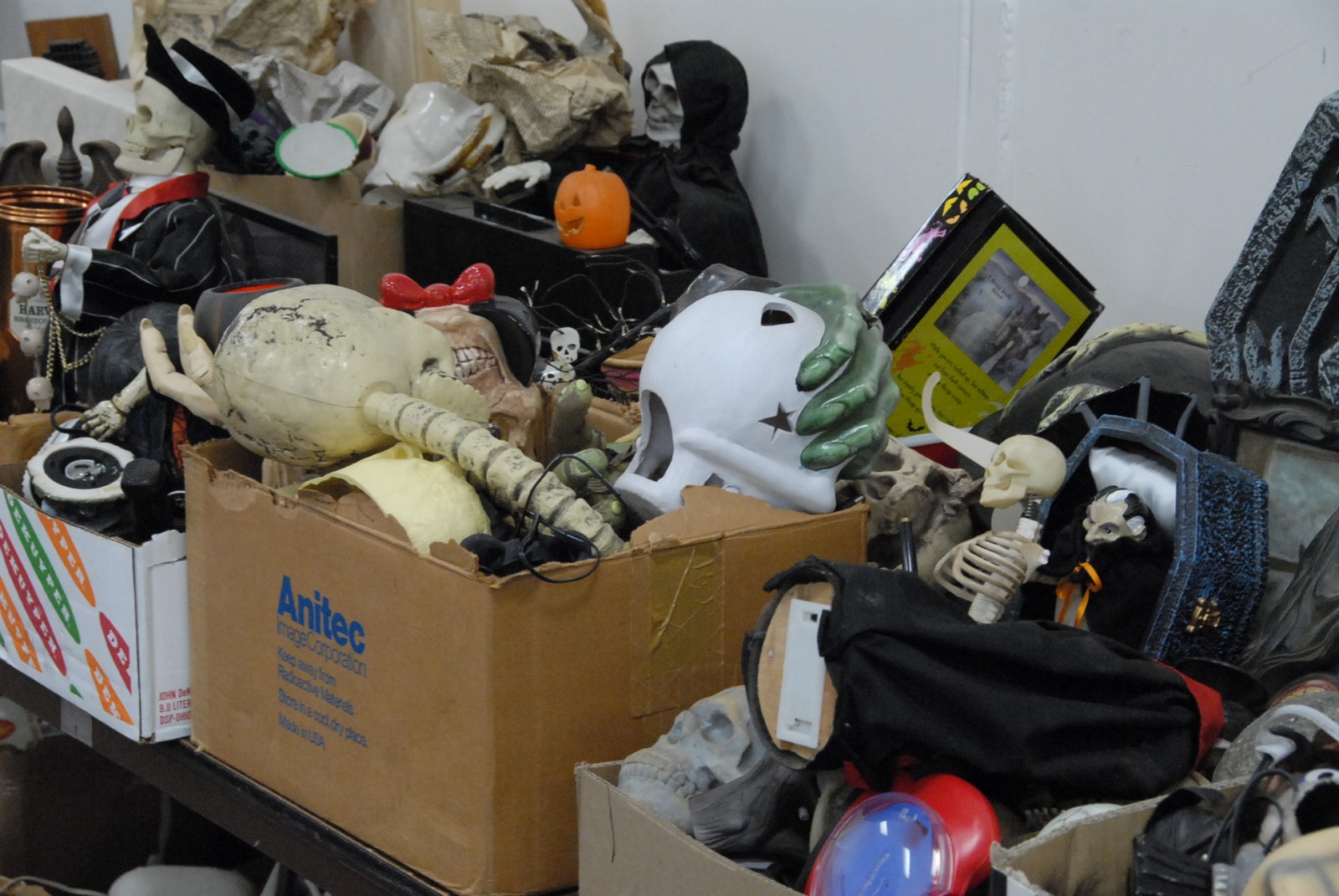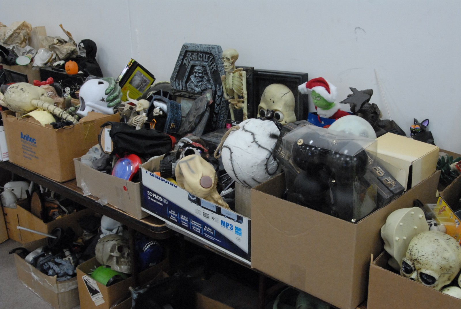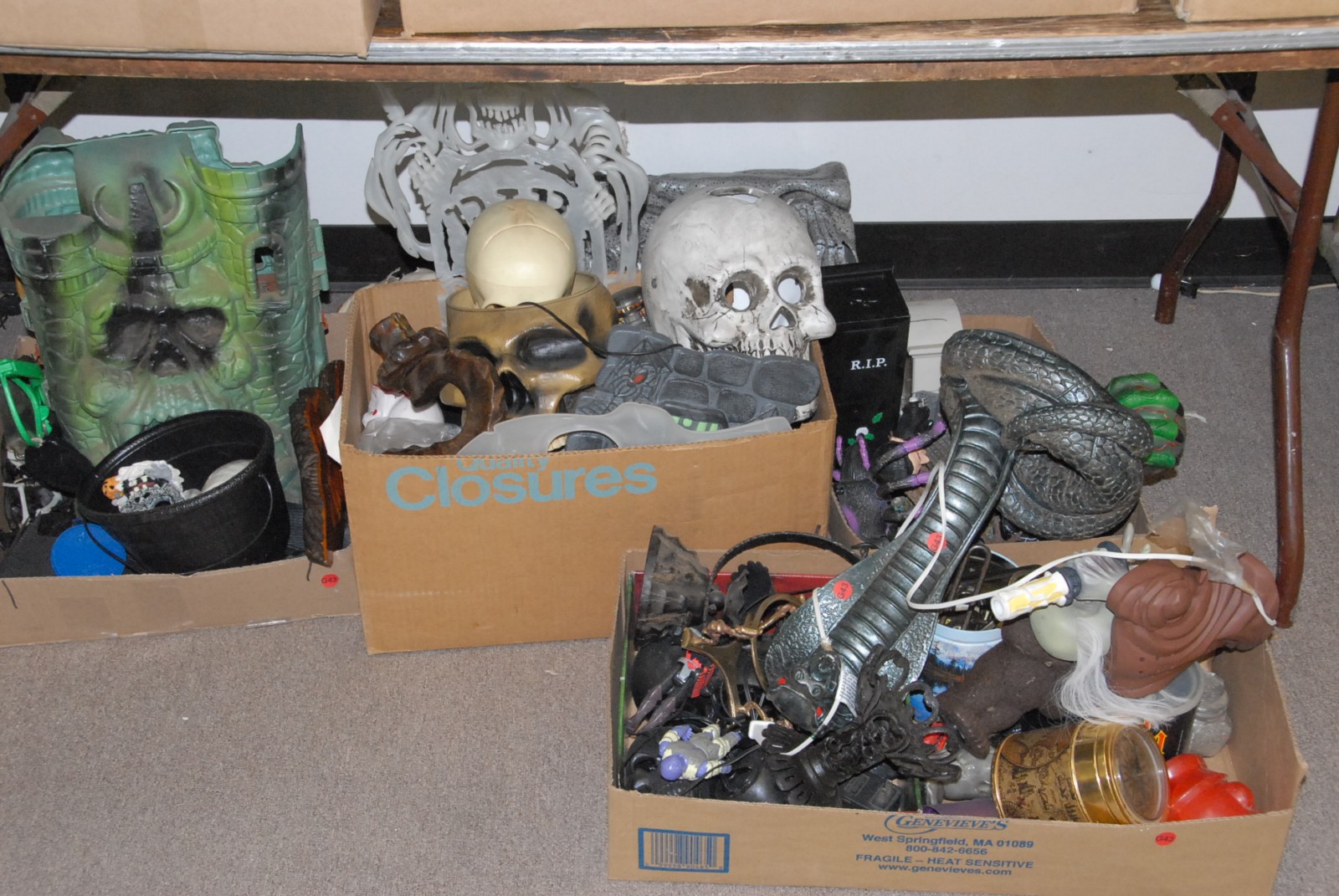 On top of two tables and under two table toys to include toy skulls, halloween type things