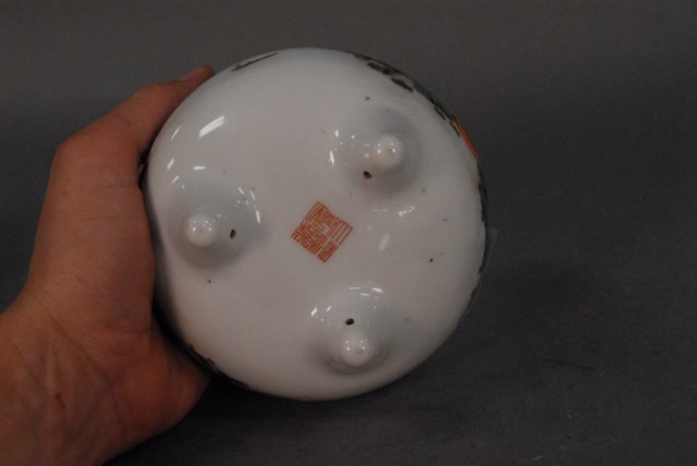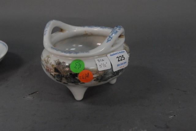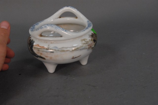 Porcelain incense burner with painted landscape and seal mark on bottom sitting on 3 feet