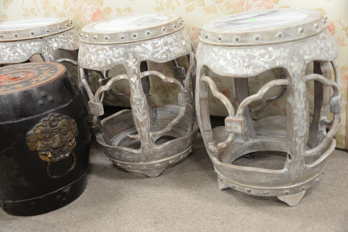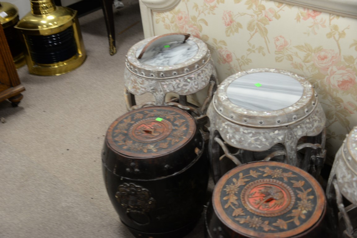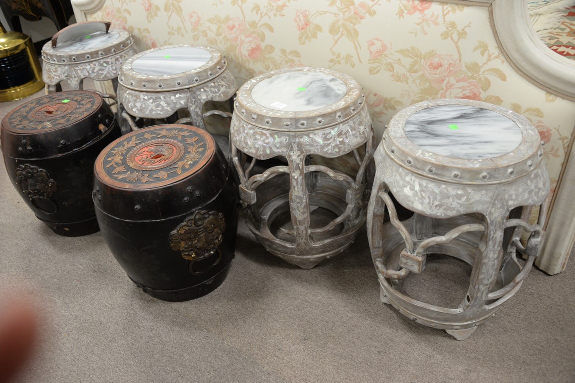 Three pairs of garden seats, two pairs with inset marble. ht. 20in.