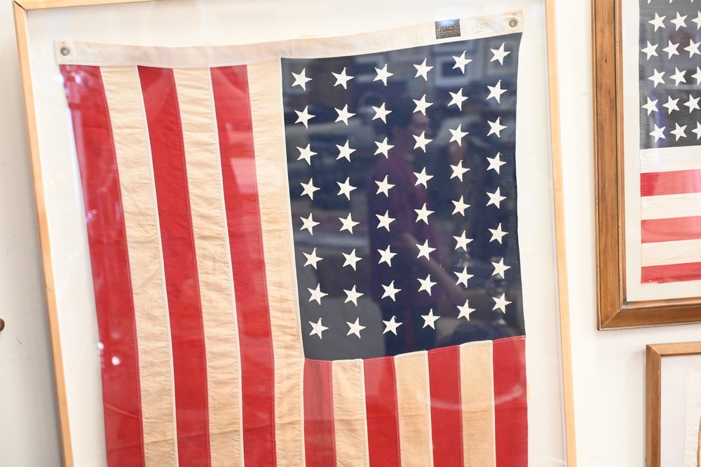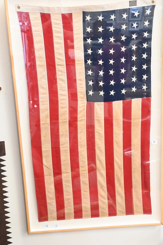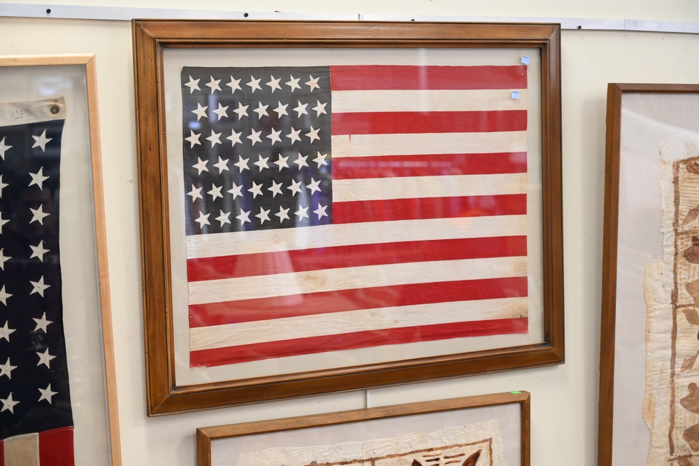 Lot 225: Two Framed American Flags, to include one having 42 stars, circa 1890, 23 1/2″ x 32″; along with a large example having 48 stars, 34″ x 57″, R.A. Humphreys Sons, Philadelphia label.