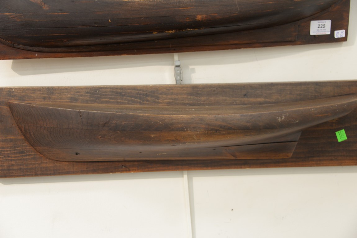 Lot 225: Two reproduction carved pine ship half hulls. 26 x 5 and 28 x 6