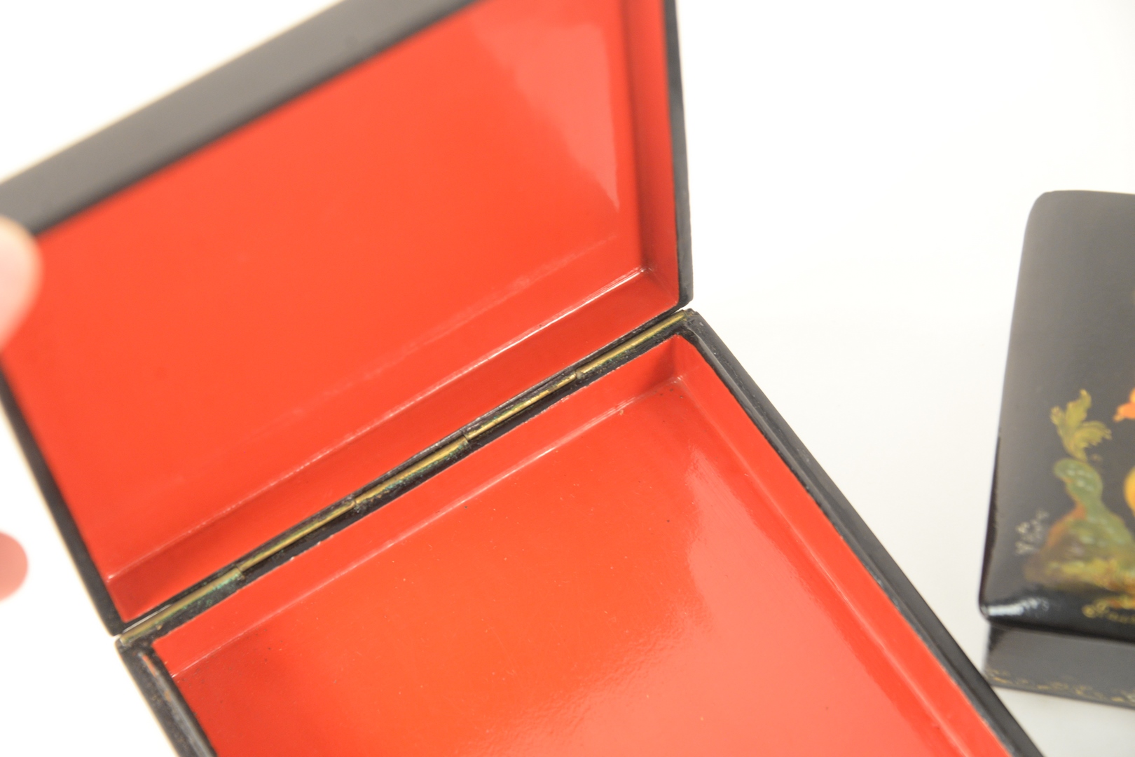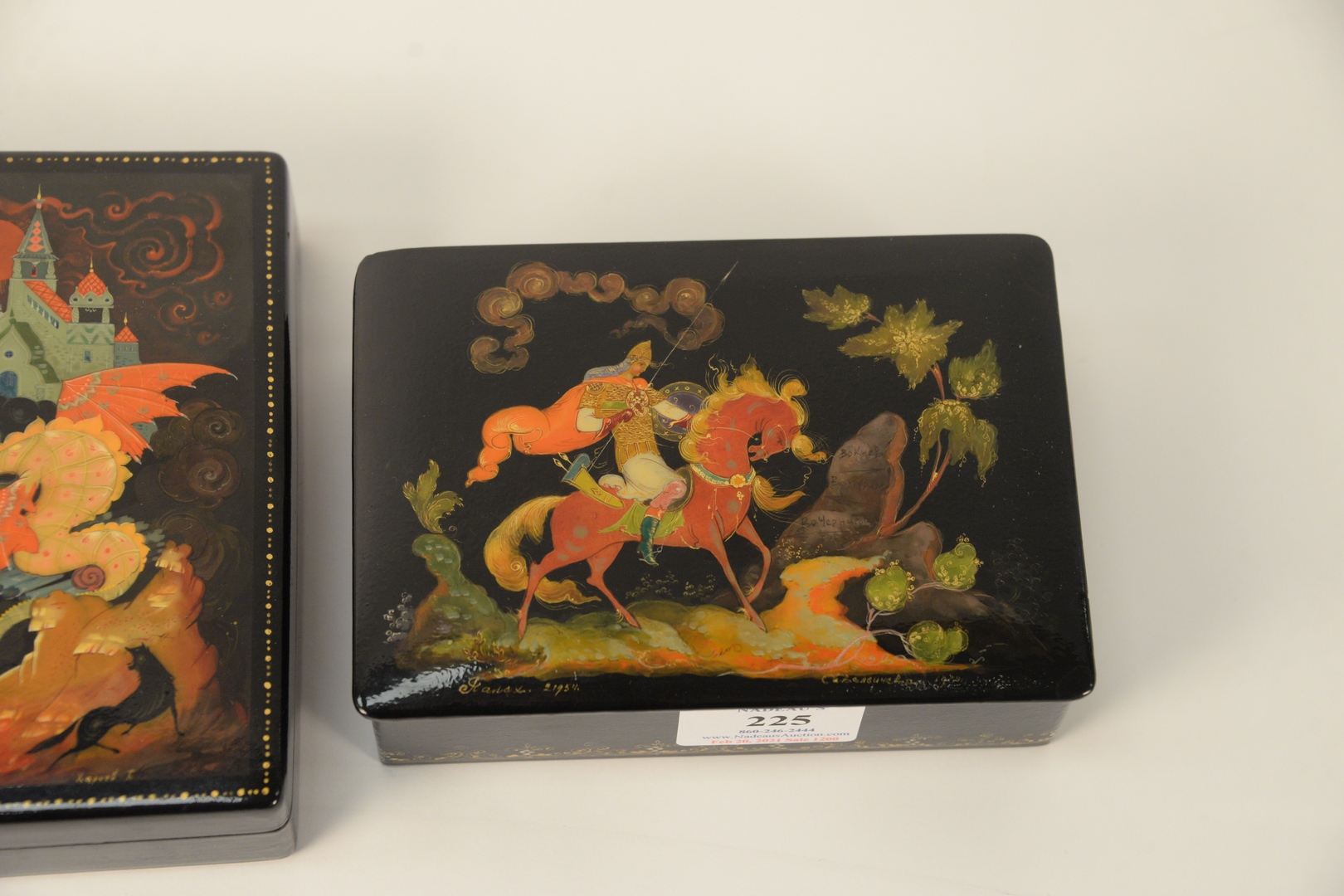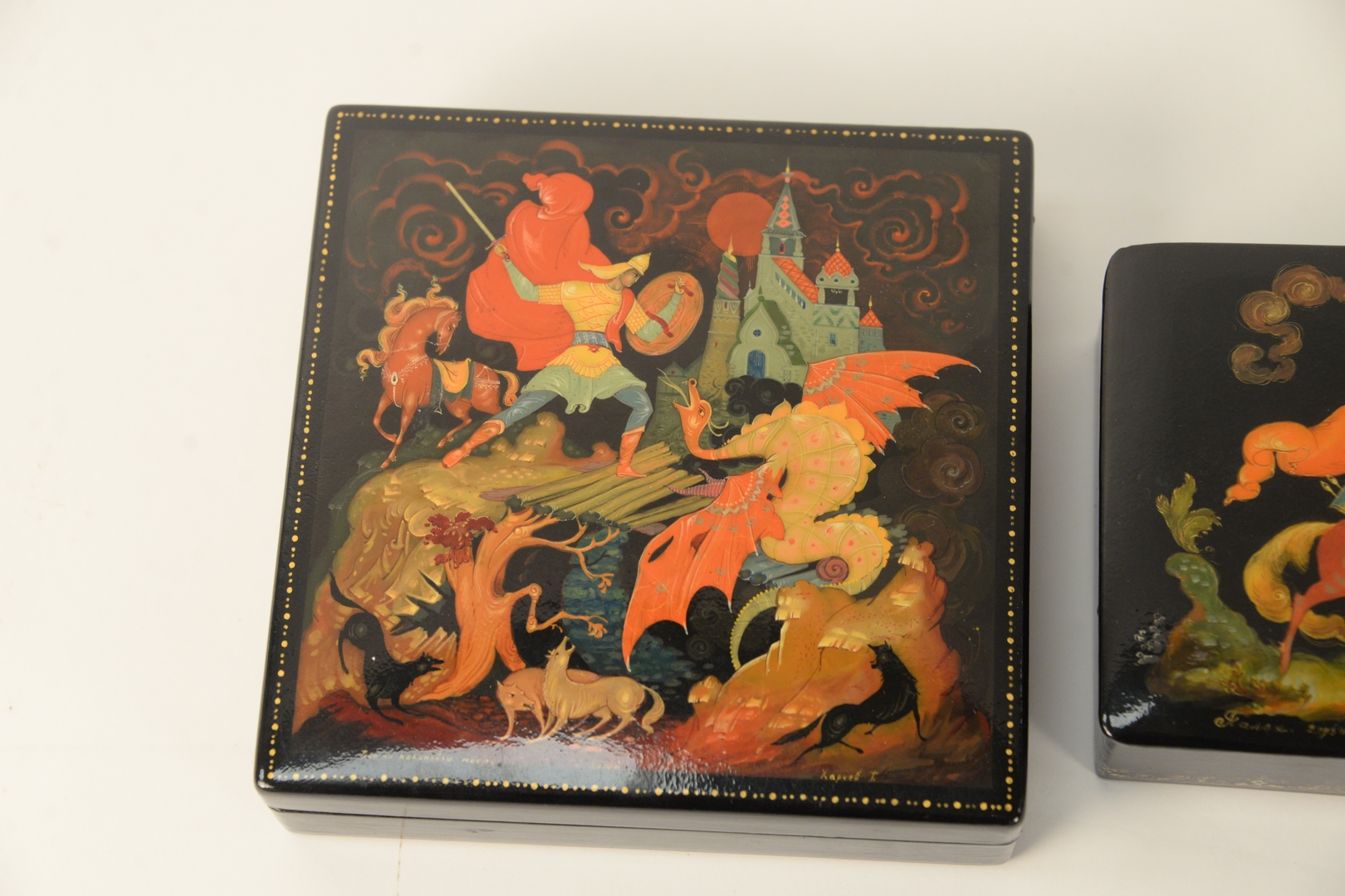 Two Russian Lacquer Boxes, legends and fairy tale motif, in the manner of Palekh School, knight on horse, marked 1924, signed illegibly; one with castle and dragon, signed illegibly Xonyu, tops 6″ x 6″ and 4 1/2″ x 6″. Provenance: The Estate of Alina Roisen, Park Avenue, New York.