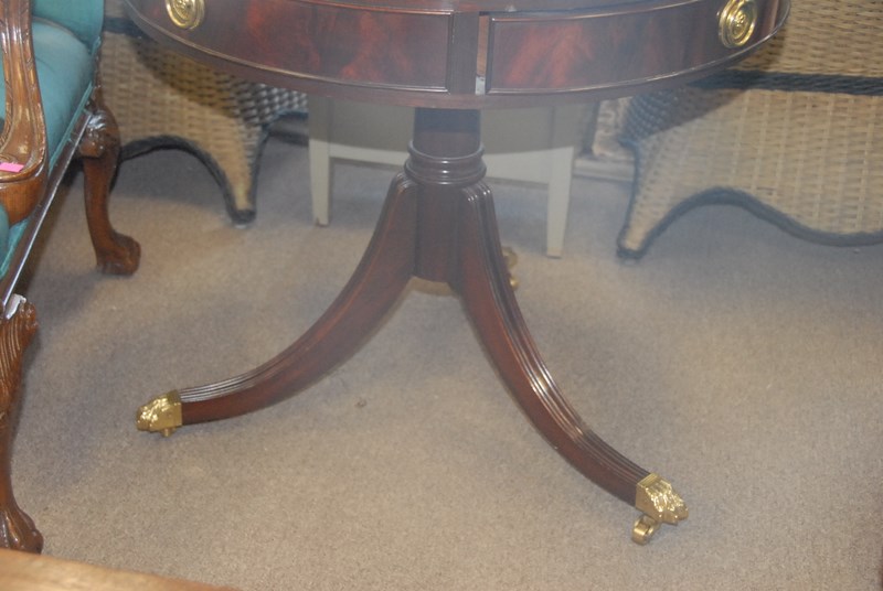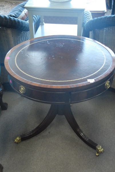 Councill mahogany drum table with leather top.