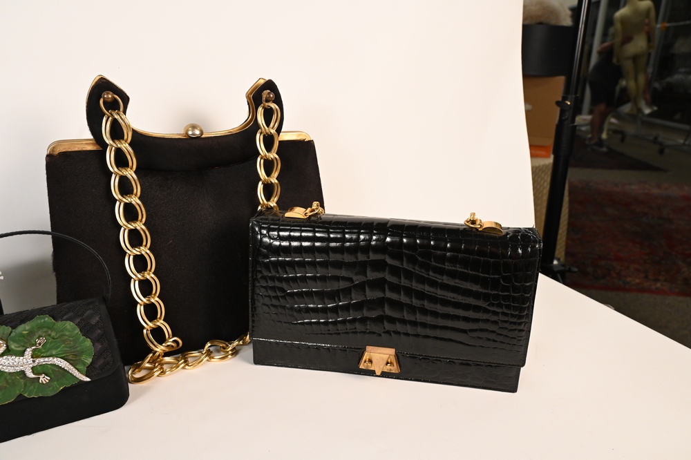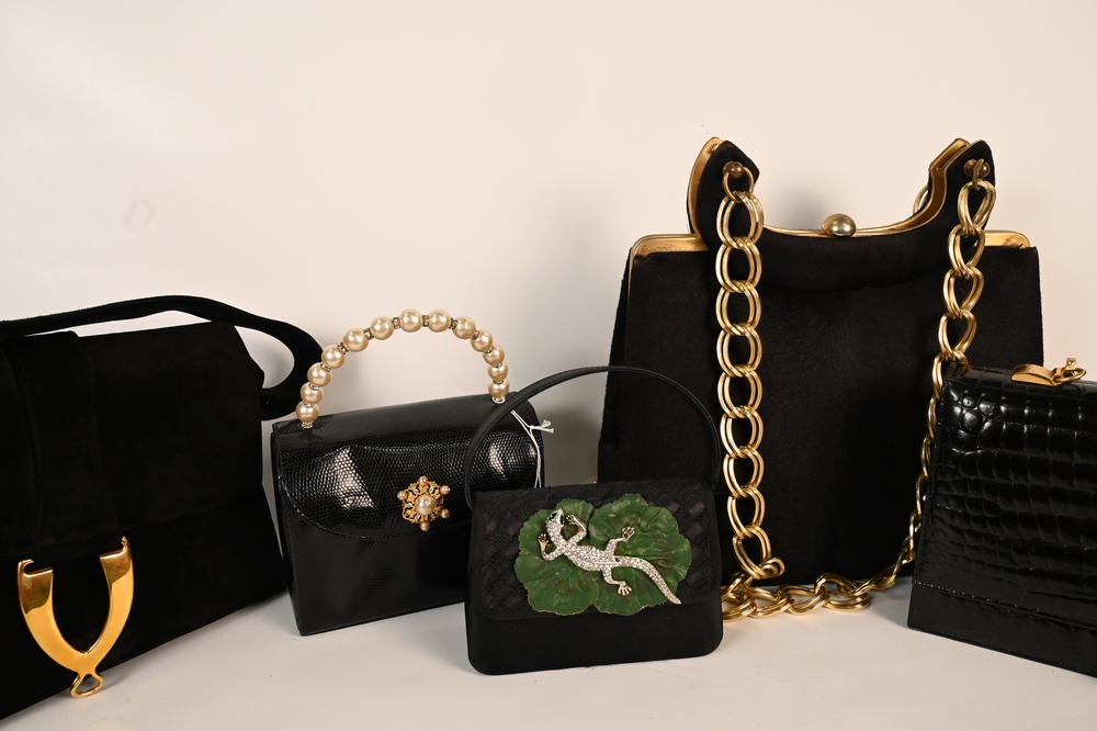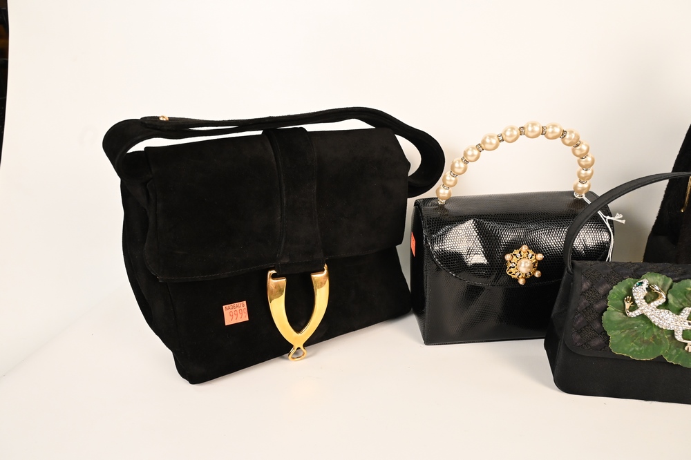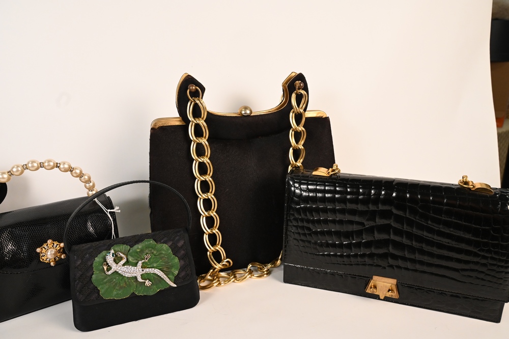Five Vintage Designer Handbags, to include tall black skin with large chain handle by Life, black suede, black embossed crocodile leather by Dofan, black box lizard bag by Lana of London, and small rhinestone lizard purse, lizard missing some stones.