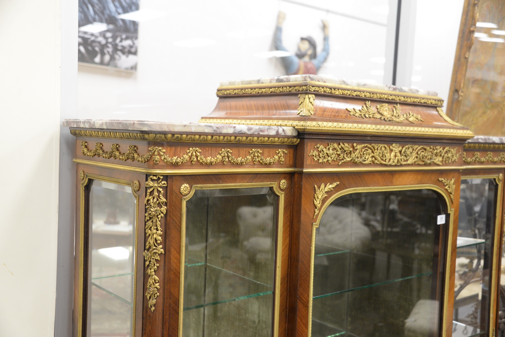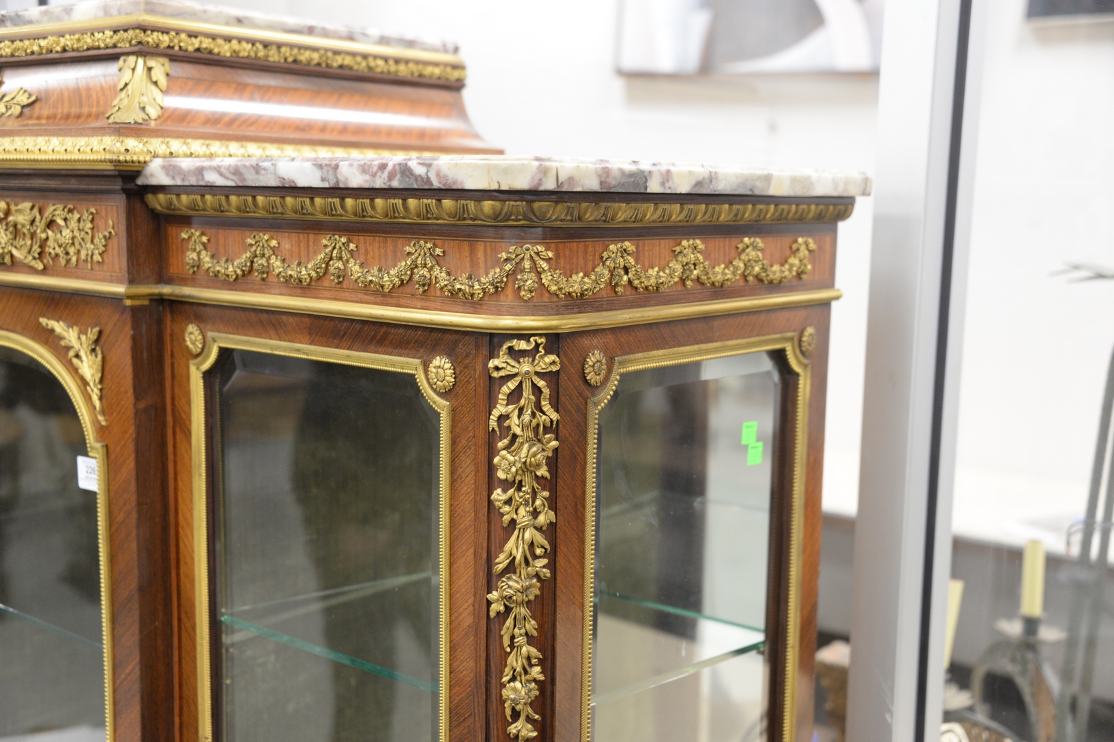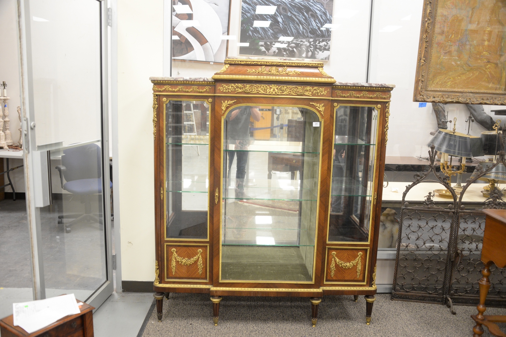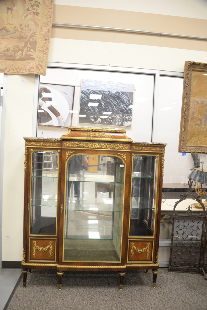 Lot 226: Francois Linke Vitrine Cabinet, having original beveled glass with bronze ormolu mounts, marble top, original keys, electrified seventy years ago, all three locks signed Francois Linke, height 66 1/2 inches, width 56 inches, depth 17 1/4 inches.