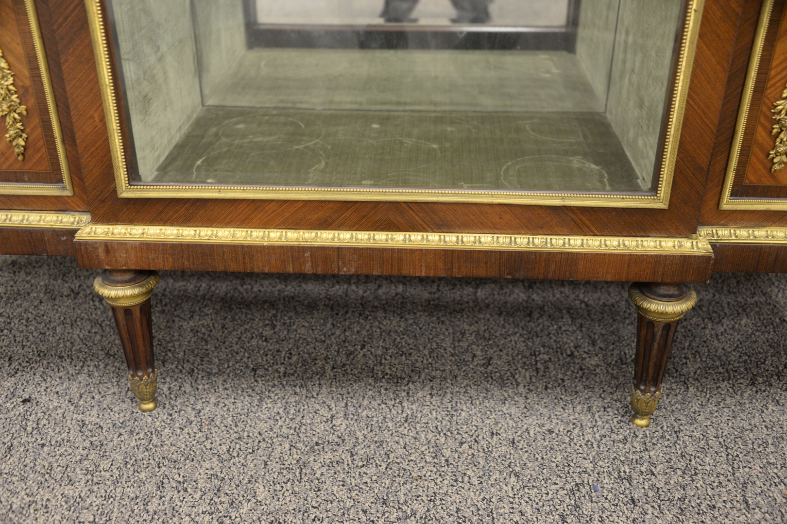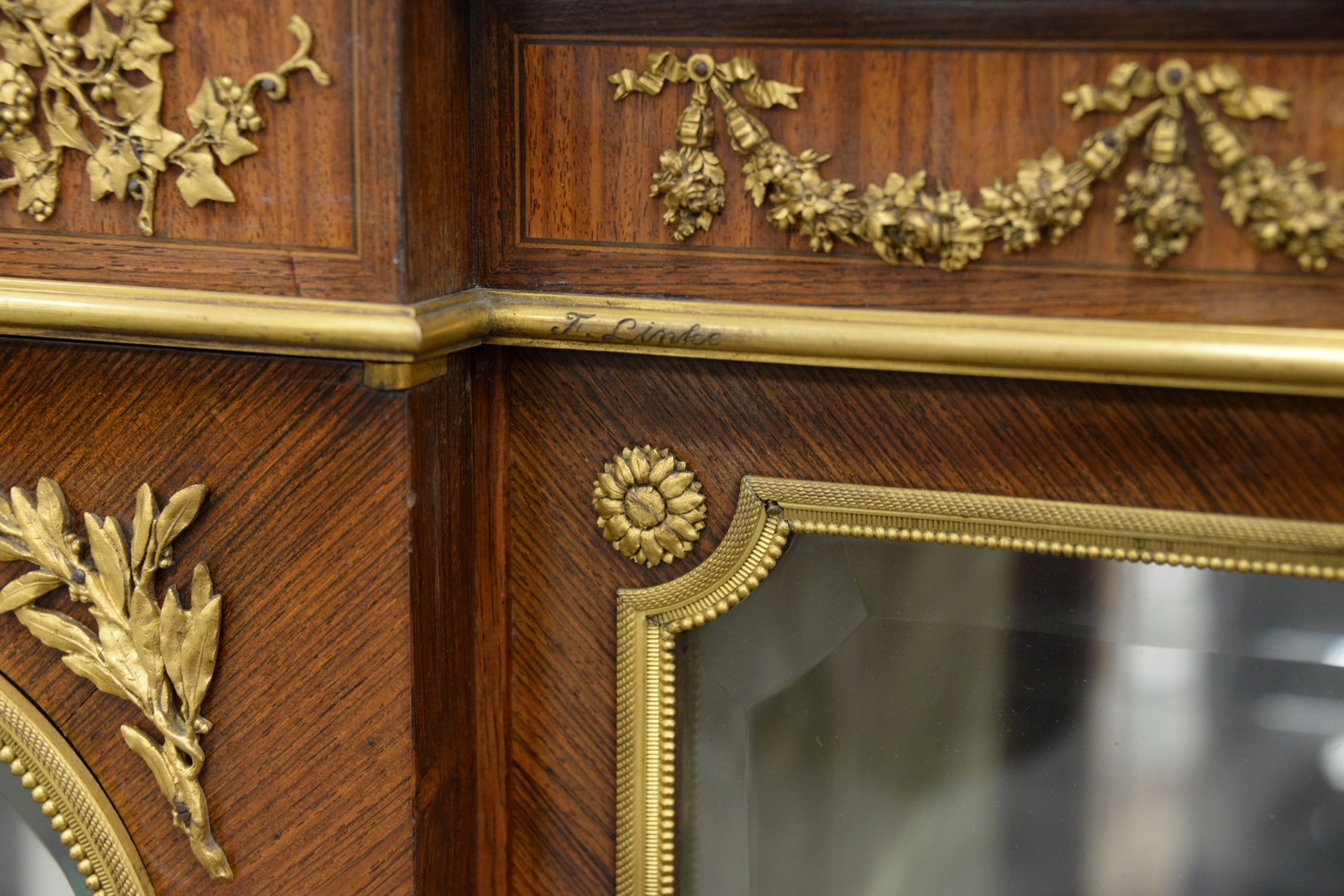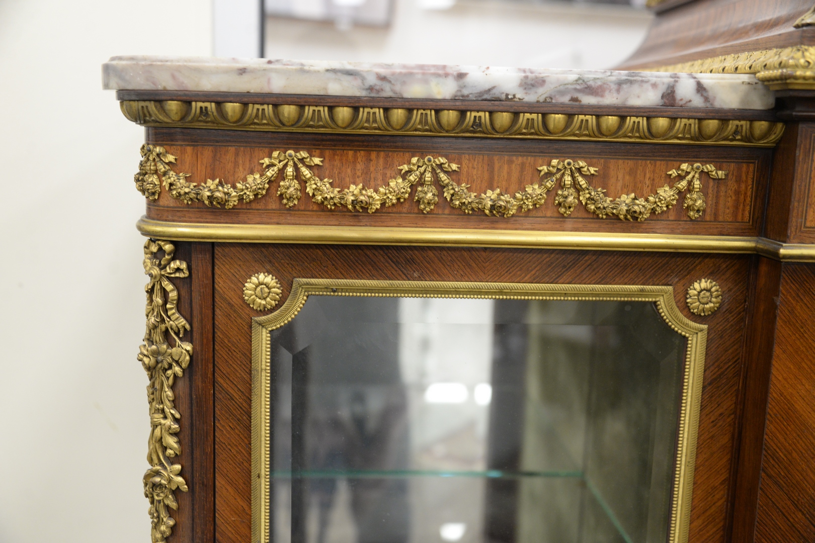 Lot 226: Francois Linke Vitrine Cabinet, having original beveled glass with bronze ormolu mounts, marble top, original keys, electrified seventy years ago, all three locks signed Francois Linke, height 66 1/2 inches, width 56 inches, depth 17 1/4 inches.