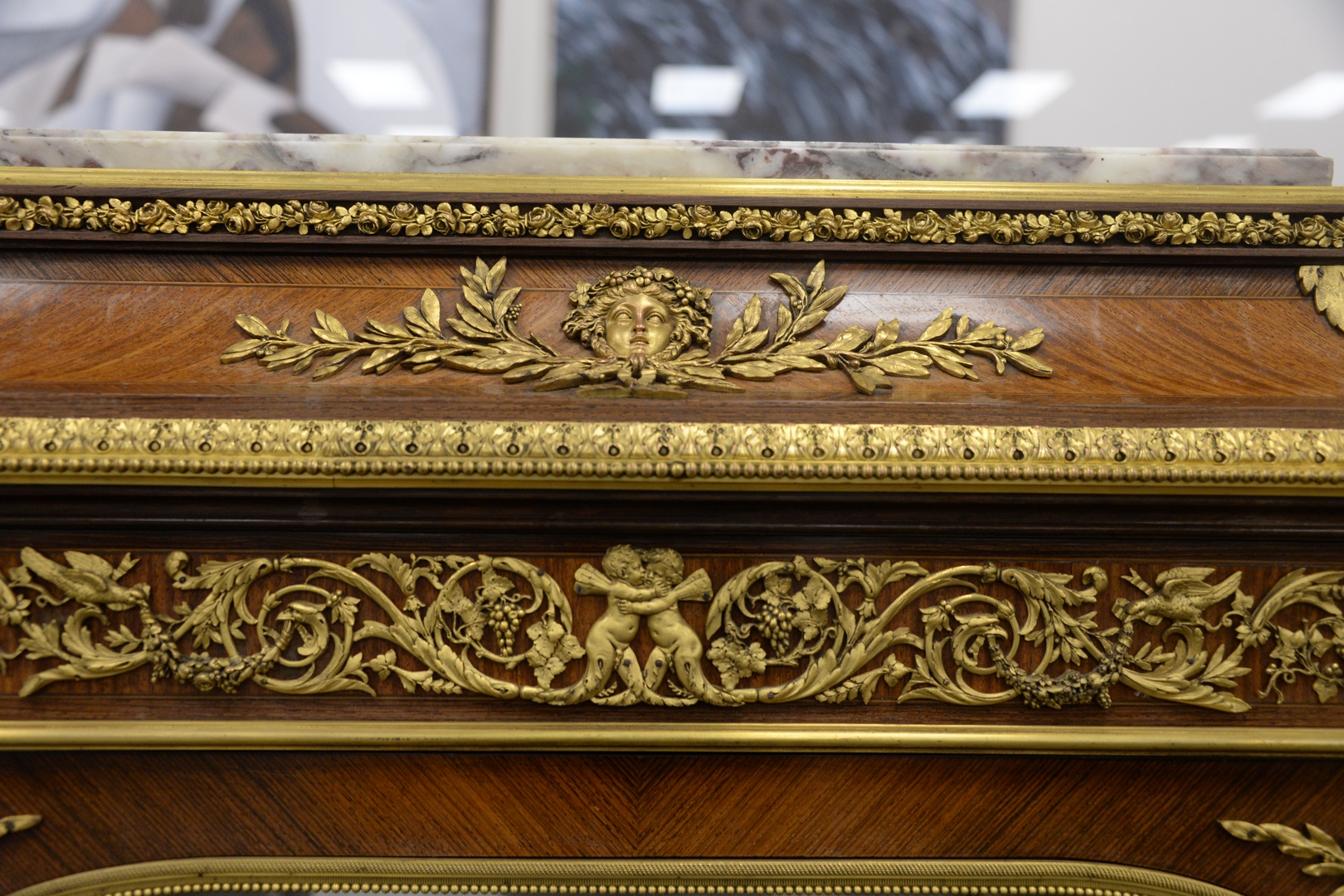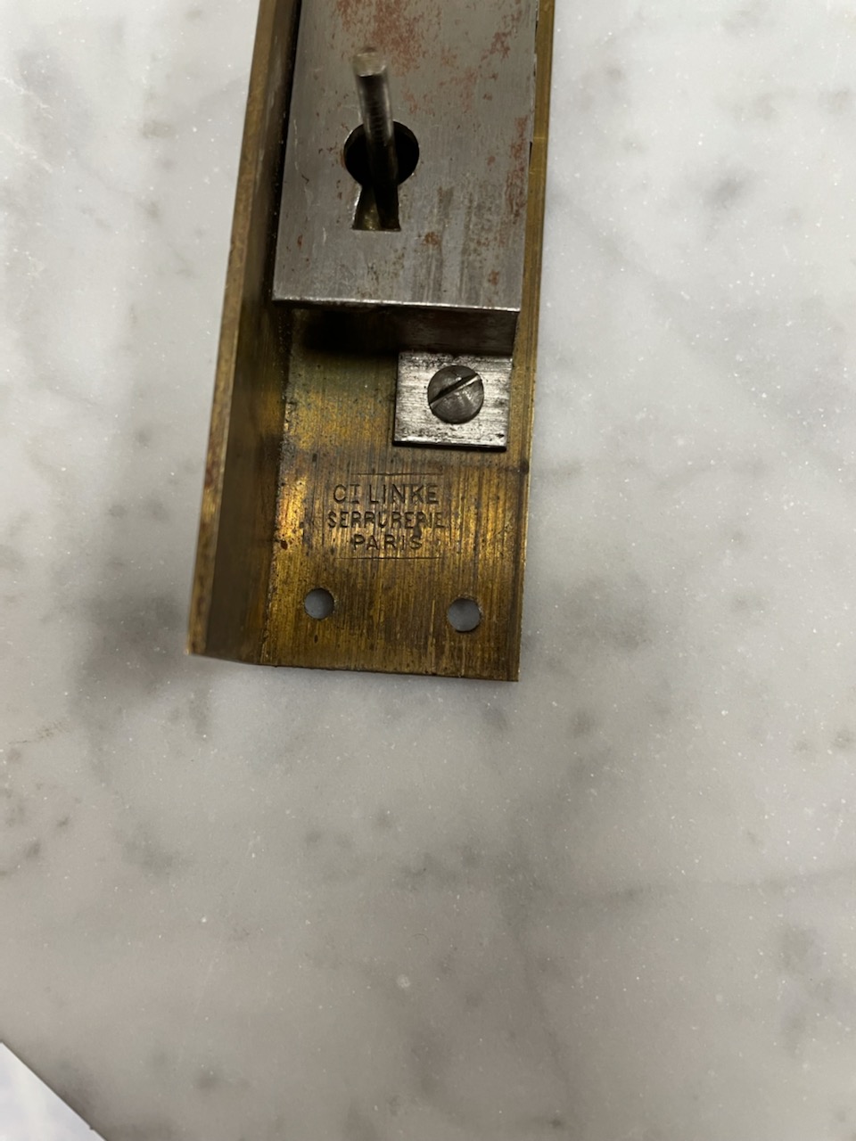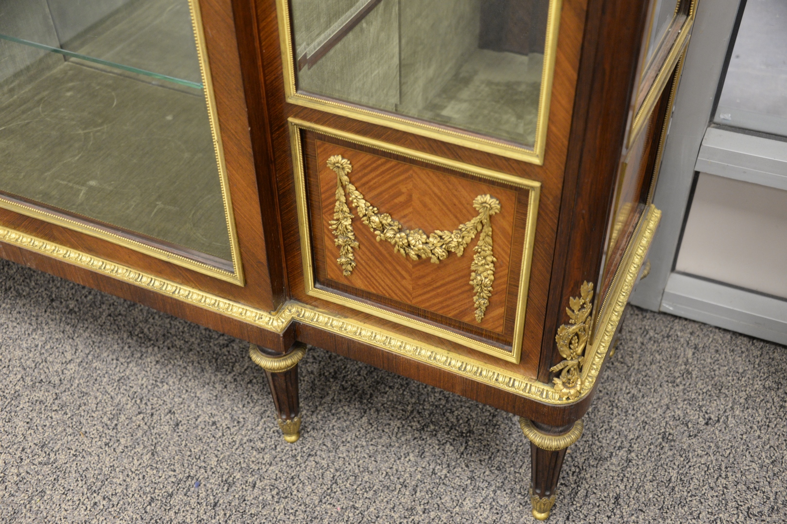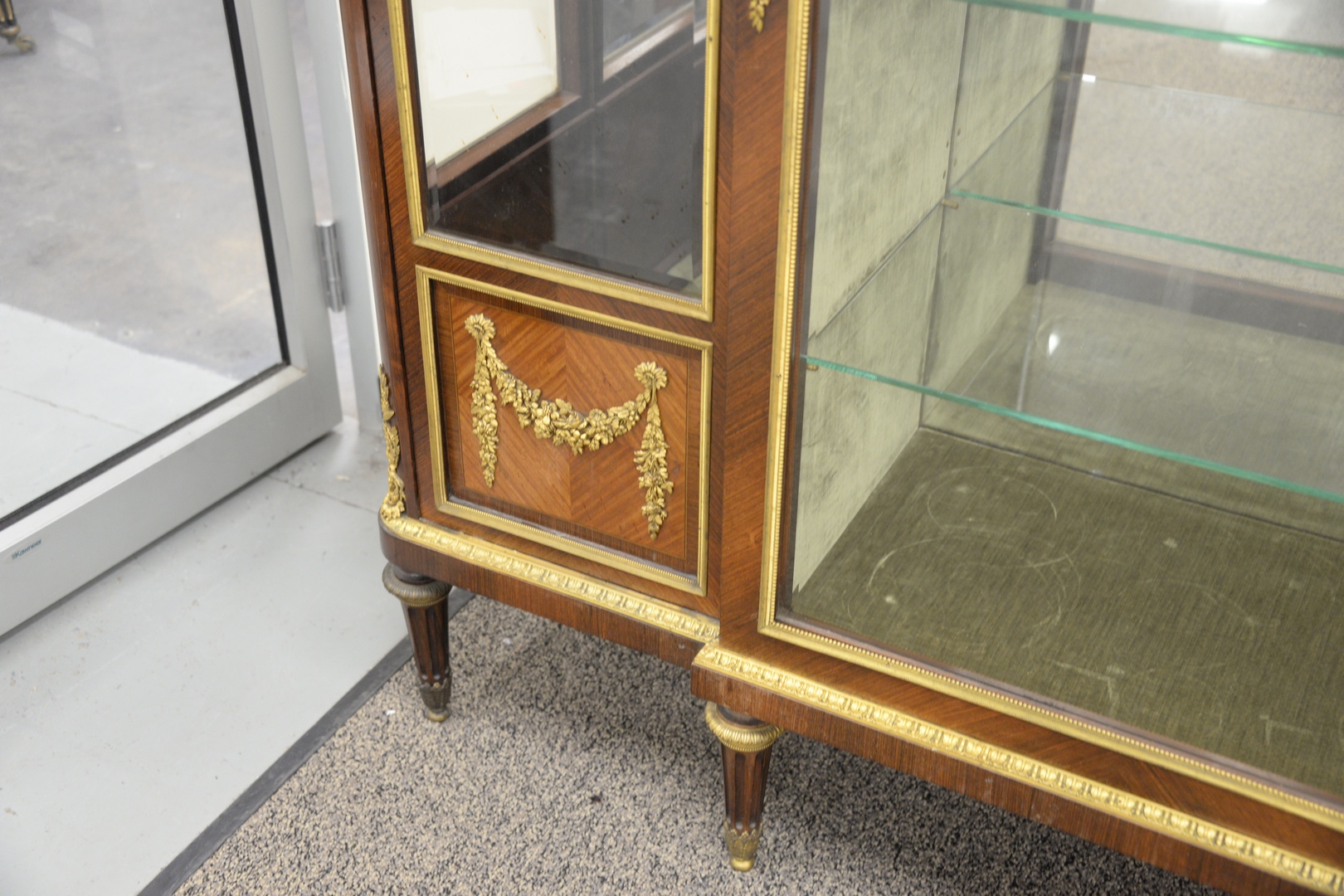 Lot 226: Francois Linke Vitrine Cabinet, having original beveled glass with bronze ormolu mounts, marble top, original keys, electrified seventy years ago, all three locks signed Francois Linke, height 66 1/2 inches, width 56 inches, depth 17 1/4 inches.