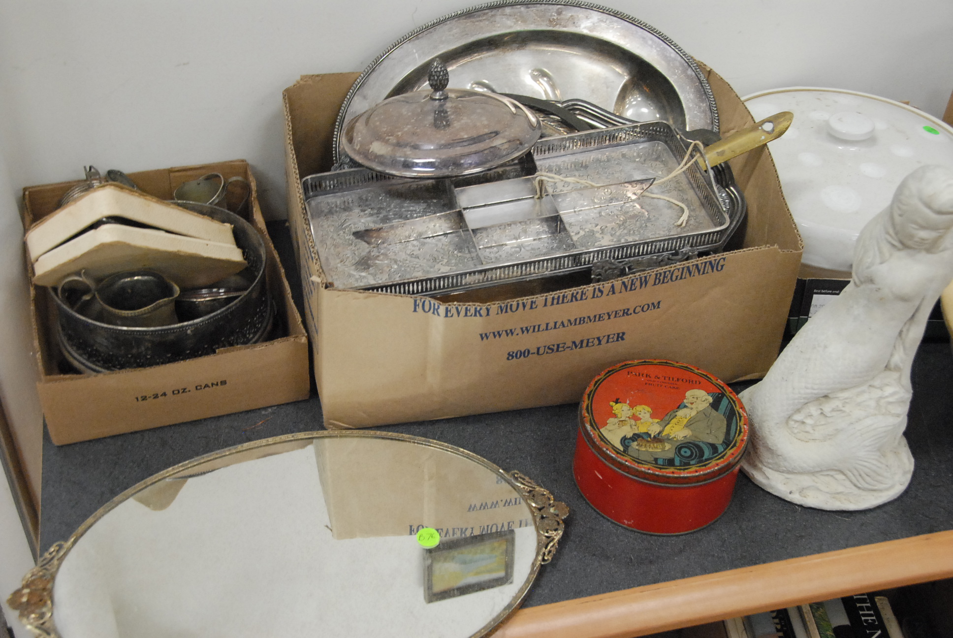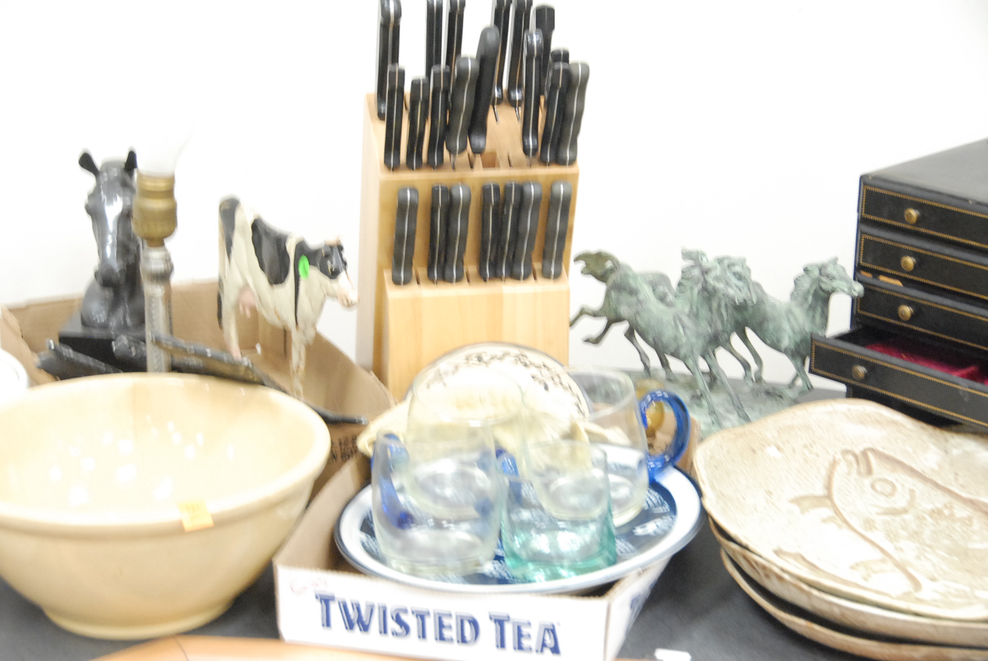 Group lot to include dishes, china, pottery, a block of knives, iron door stop, horse figures, silver plated items, dresser, mirror, buttons, silver plated flatware in boxes, jewelry box, and three wicker trays.