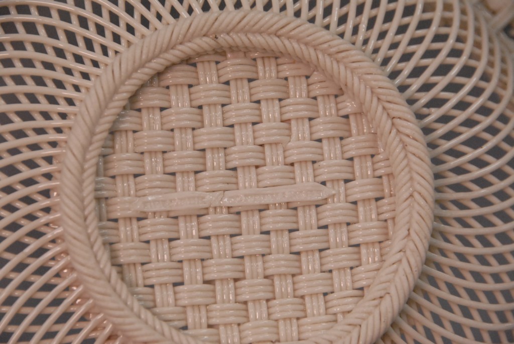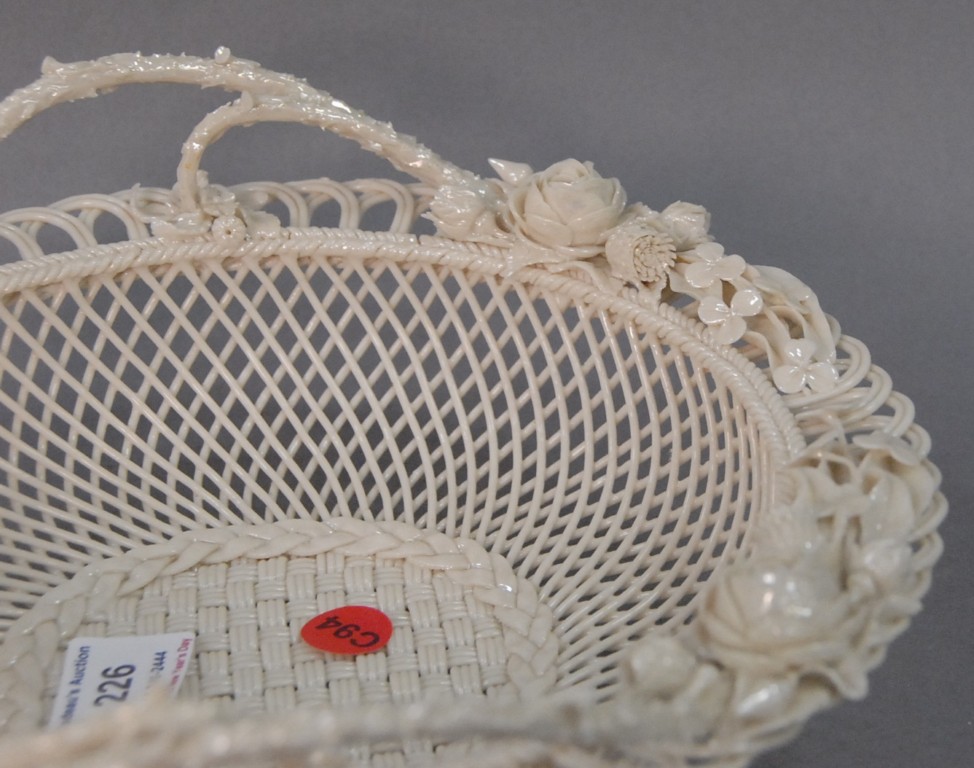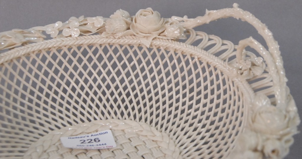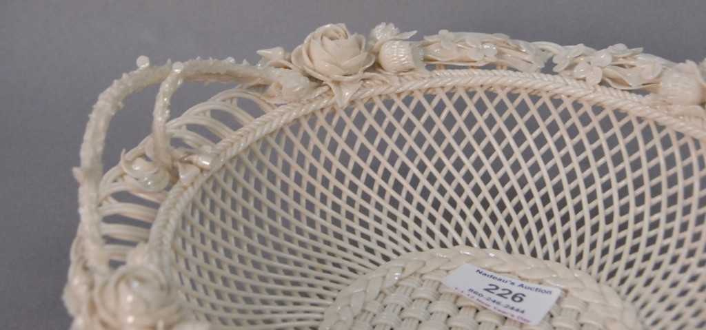 Irish Belleek round basket mounted with flowers and handles. diameter 10 1/2in.