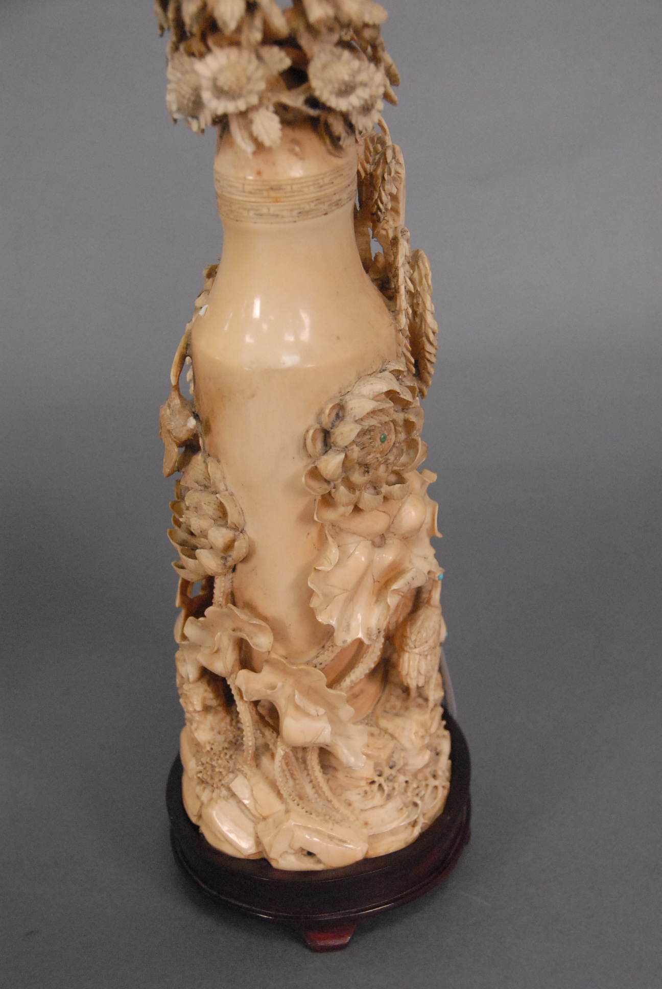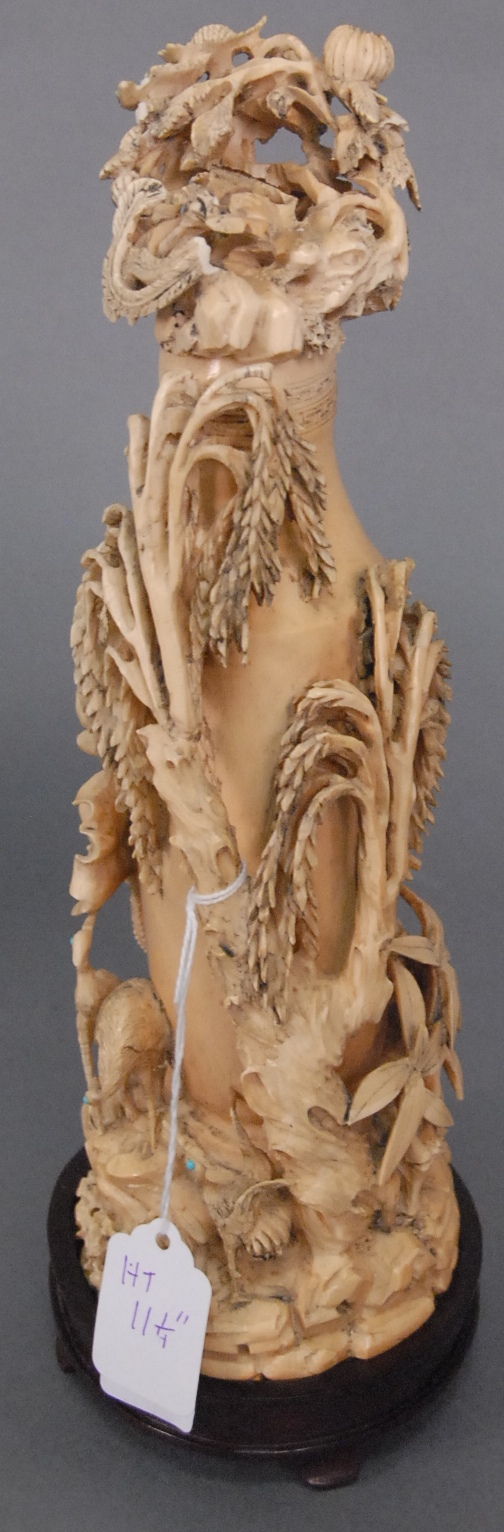 Large carved ivory covered urn having carved wild flowers and lotus on one side with flying birds and crane and a large carved tree going up one side of the urn to the cover which is carved with wild flowers as is, base marked with two character Qianlong mark, ht. 11 1/4in. plus stand.