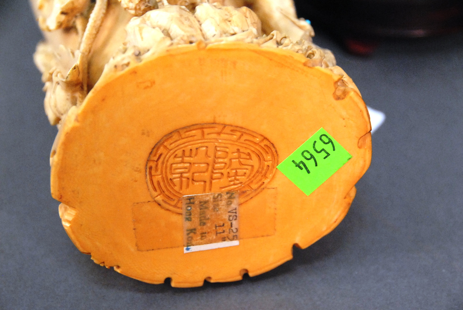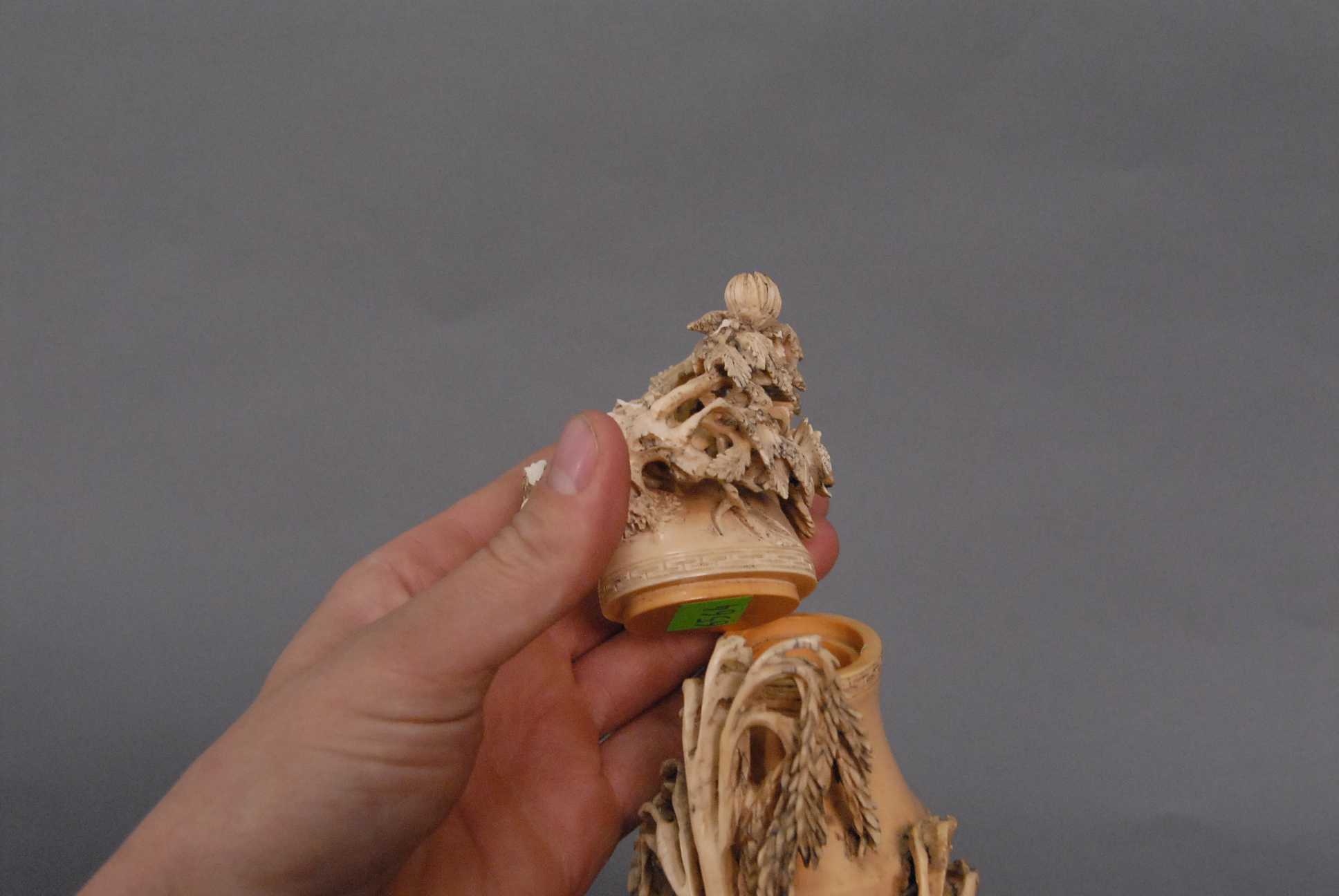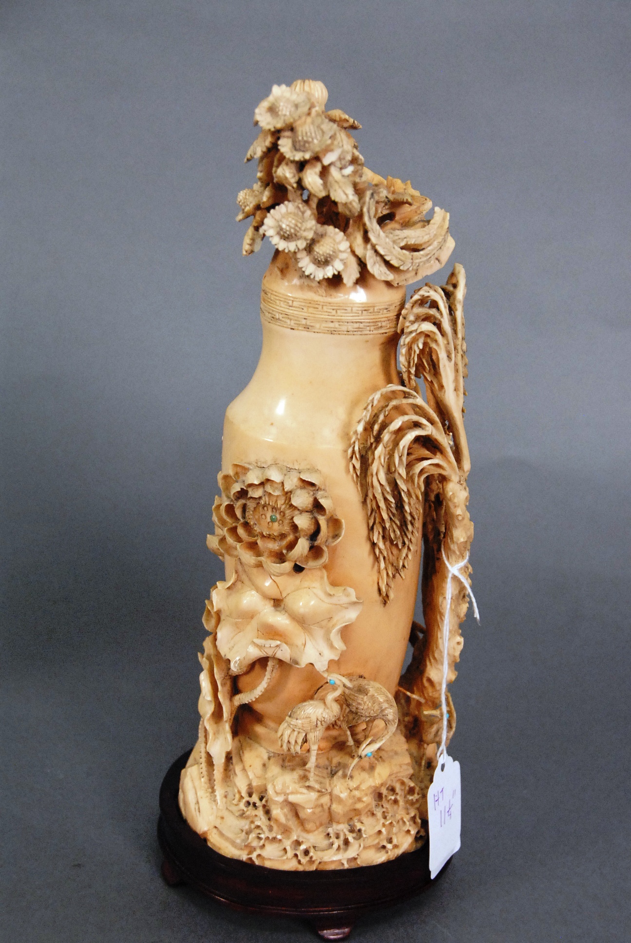 Lot 226: Large carved ivory covered urn having carved wild flowers and lotus on one side with flying birds and crane and a large carved tree …