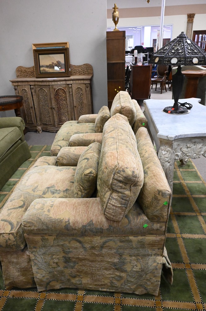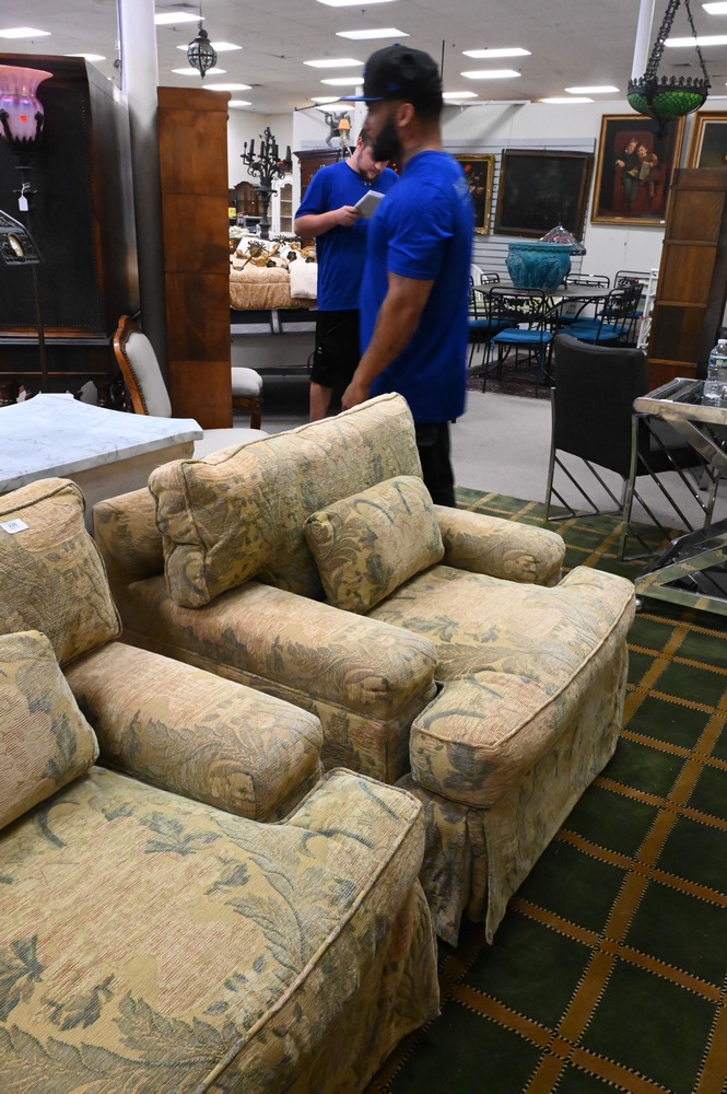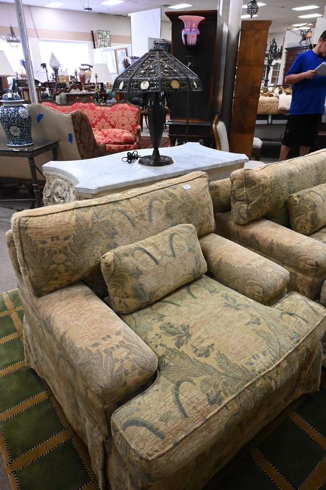 Pair of Upholstered Club Chairs, each on swivel base, height 33 inches, width 37 inches, depth 37 inches.