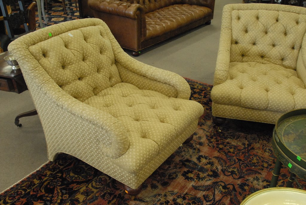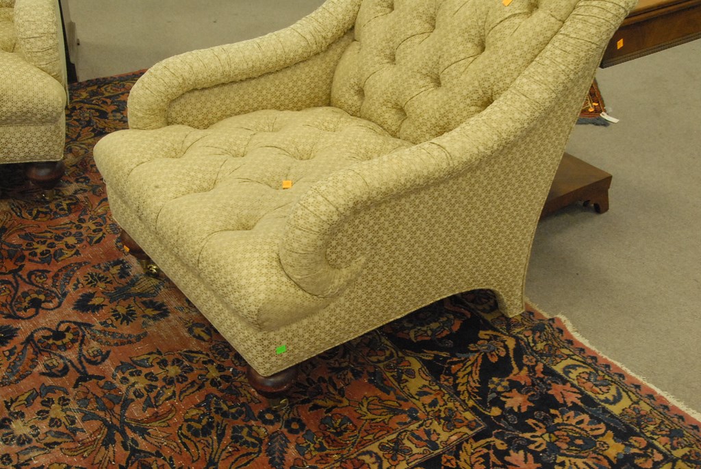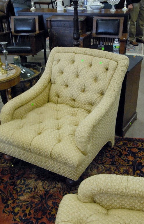 Set of four upholstered easy chairs with tufted backs and seats with brass wheels.