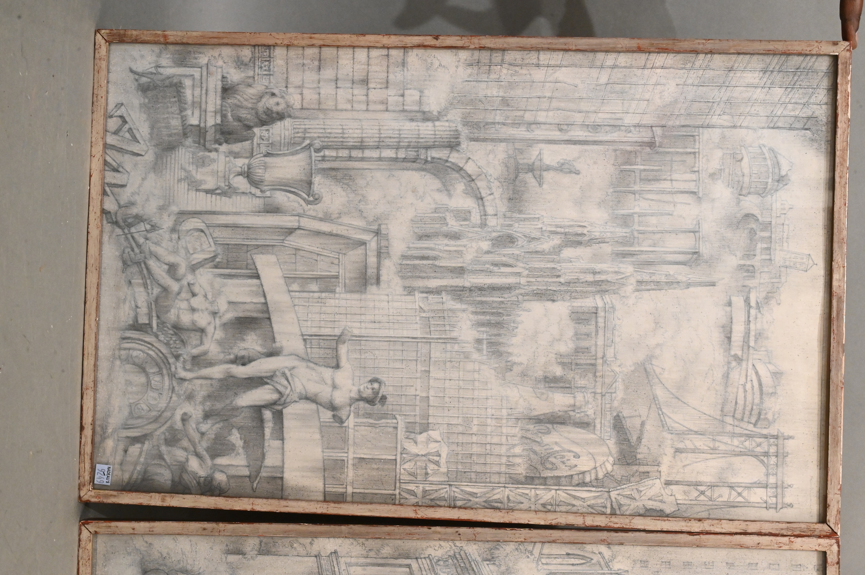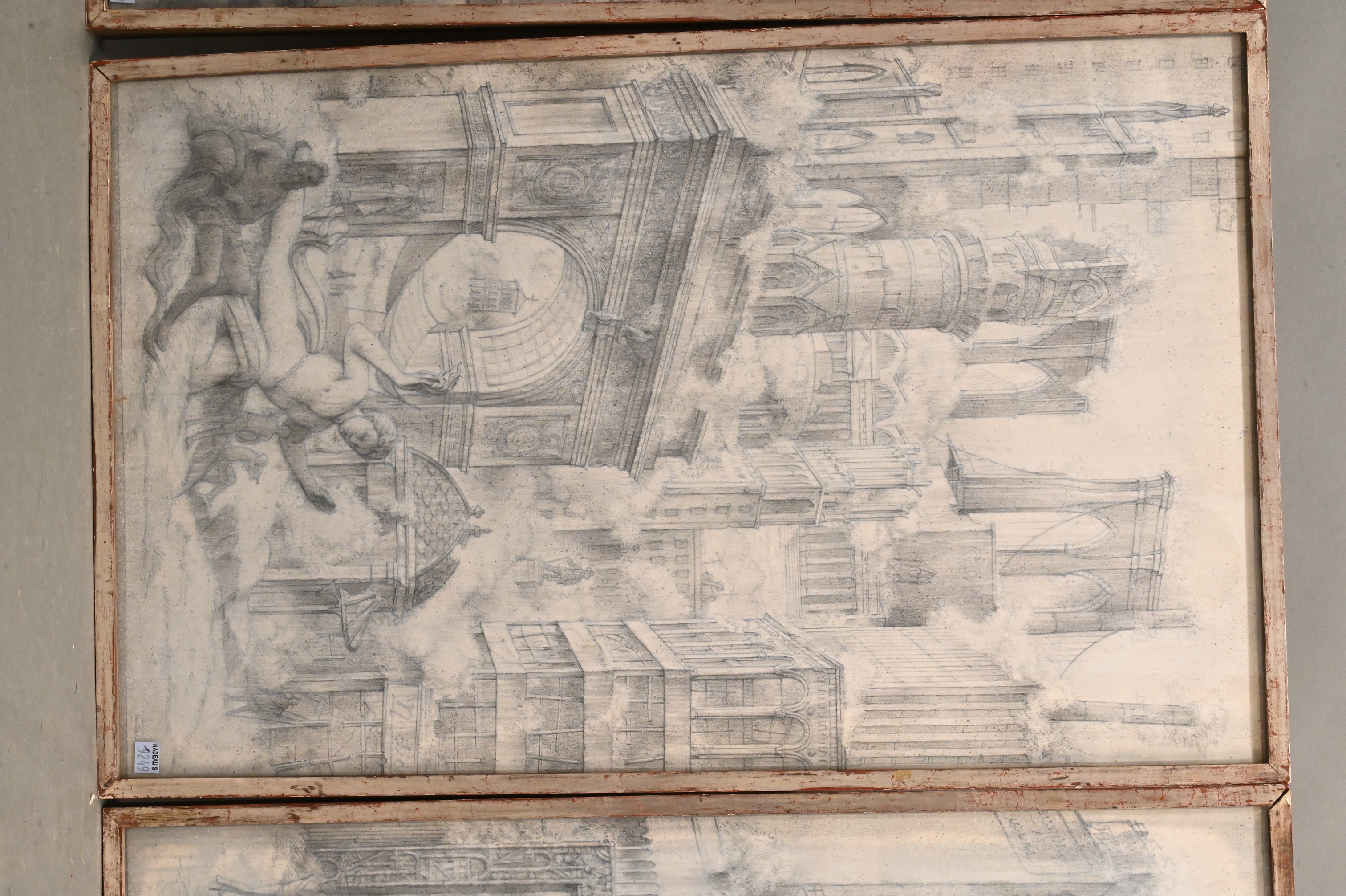 Cityscape rendered in grisaille, depicting monumental classical ruins, arches, bridges, and sculptural figures emerging from clouds