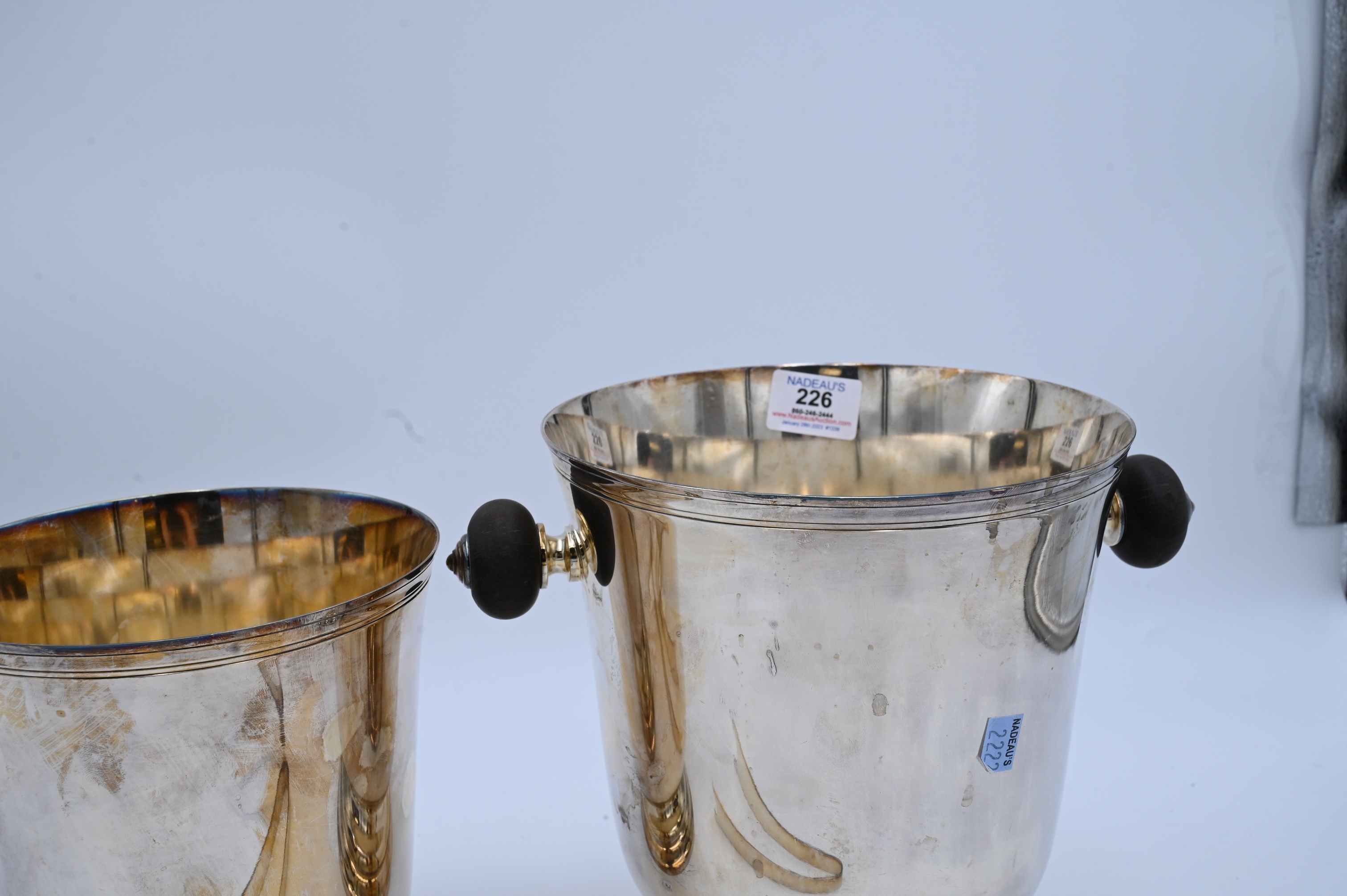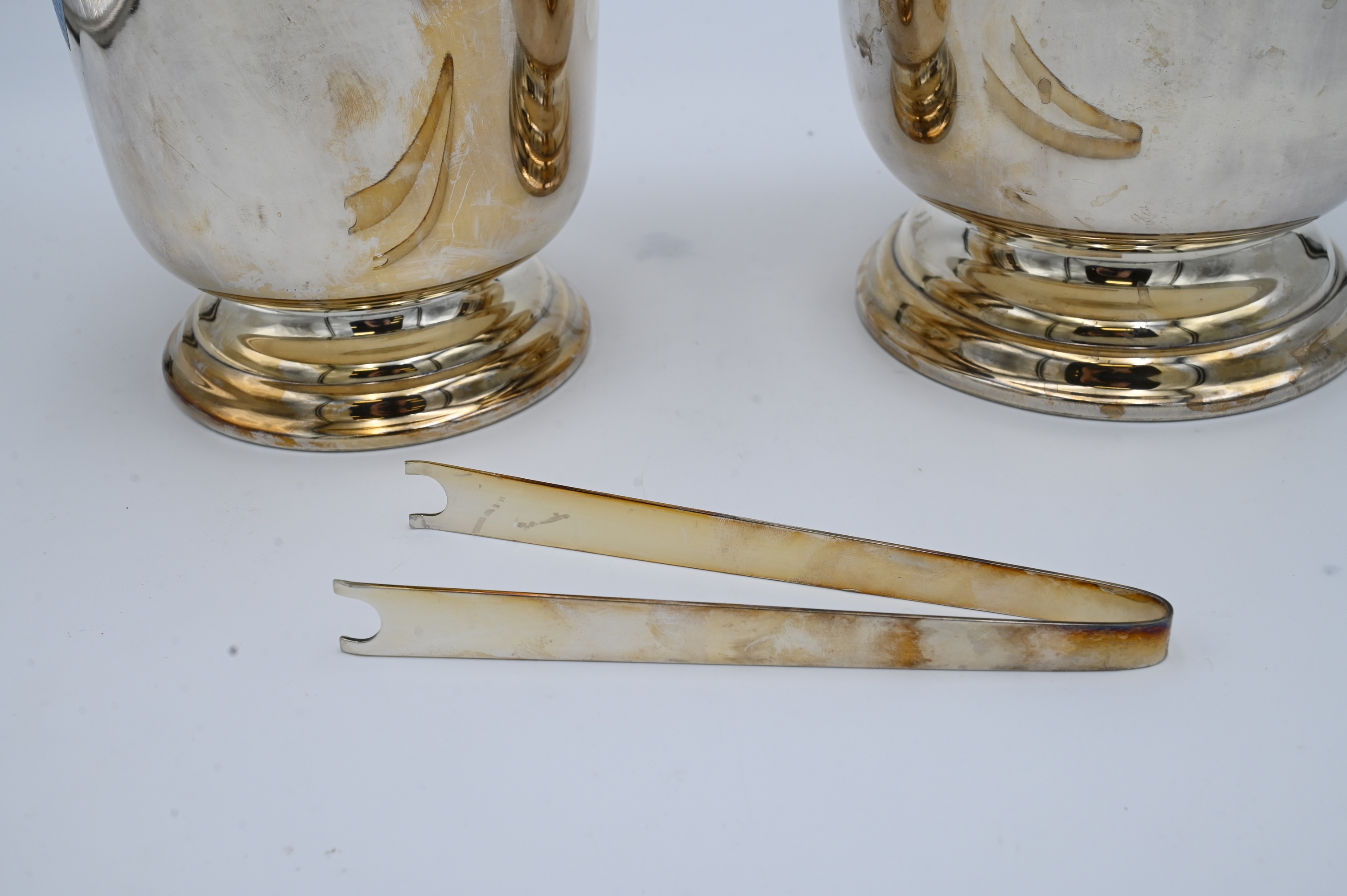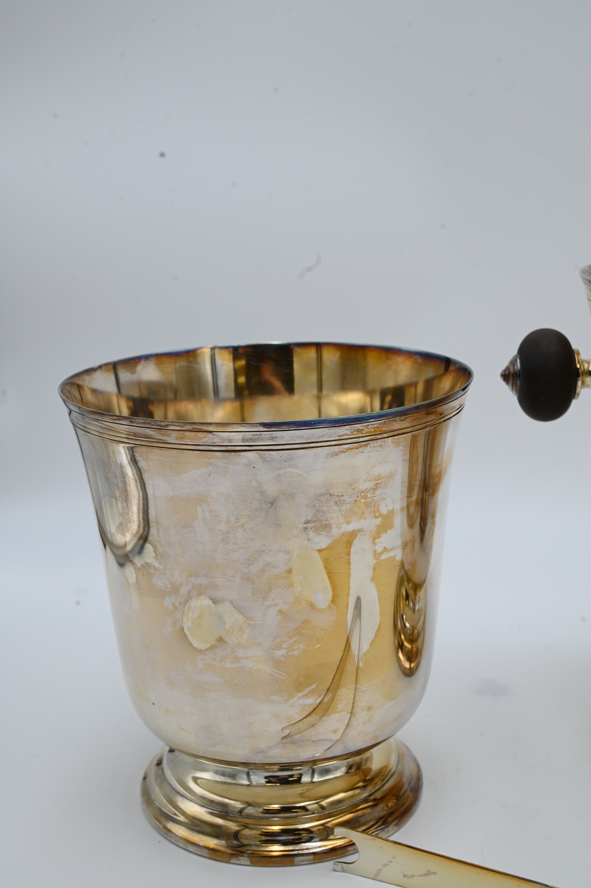 Three Piece Christofle Silver Plated Ice Bucket, along with tongs and wine bucket, height 9 inches. Provenance: Estate of Dr. Vallo Benjamin E 57th St New York