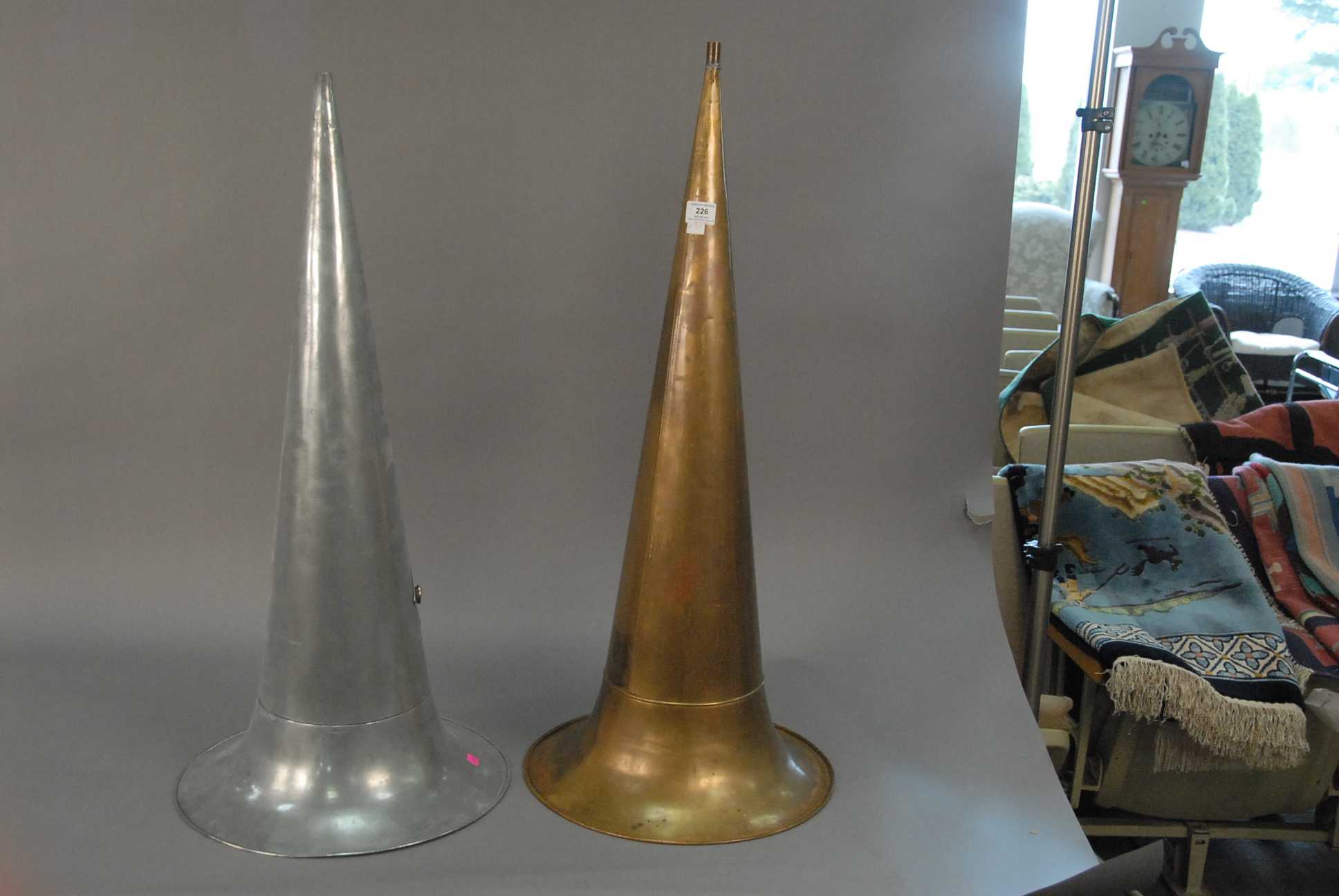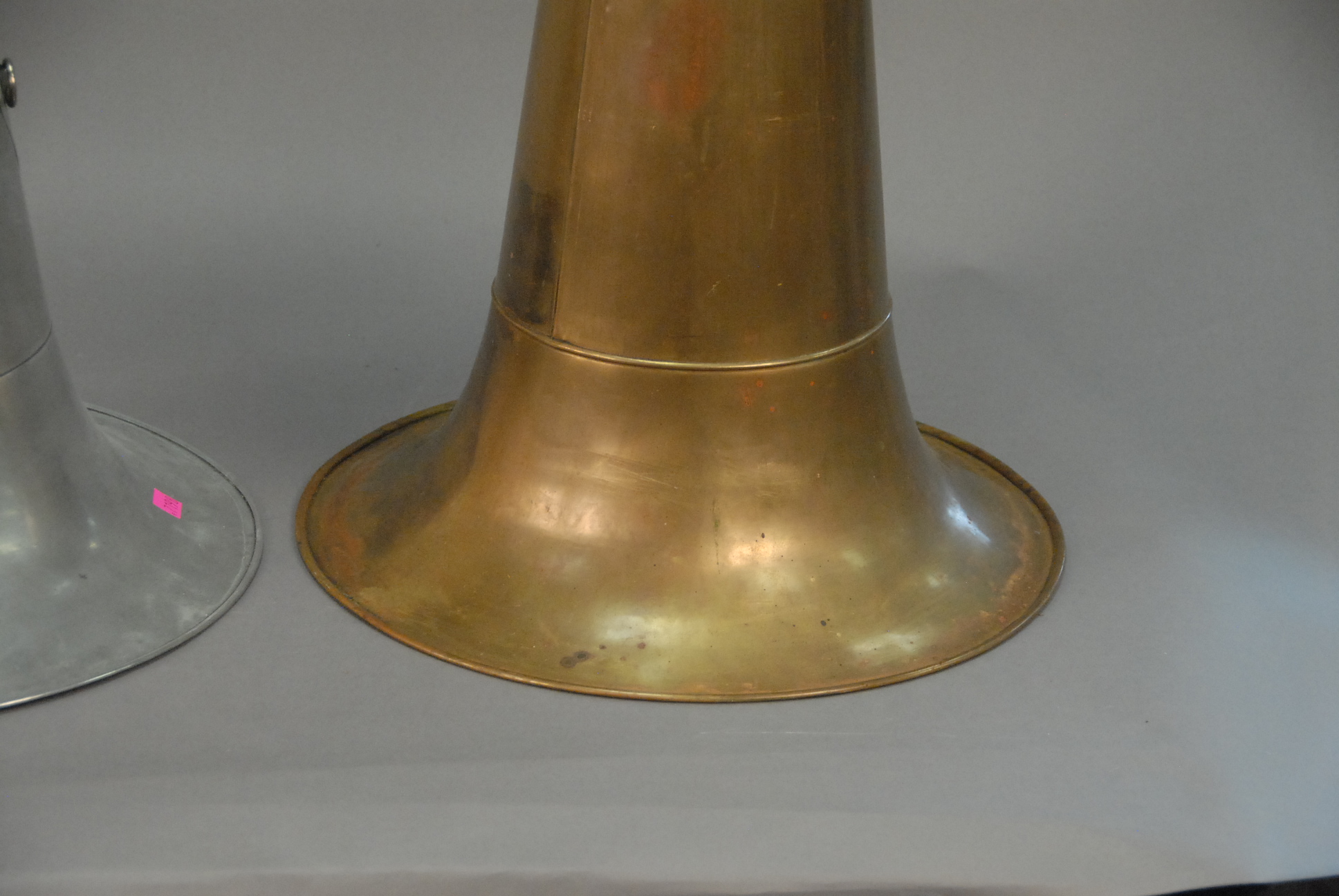 Two talking machine horns, one brass and one metal. lg. 37in.