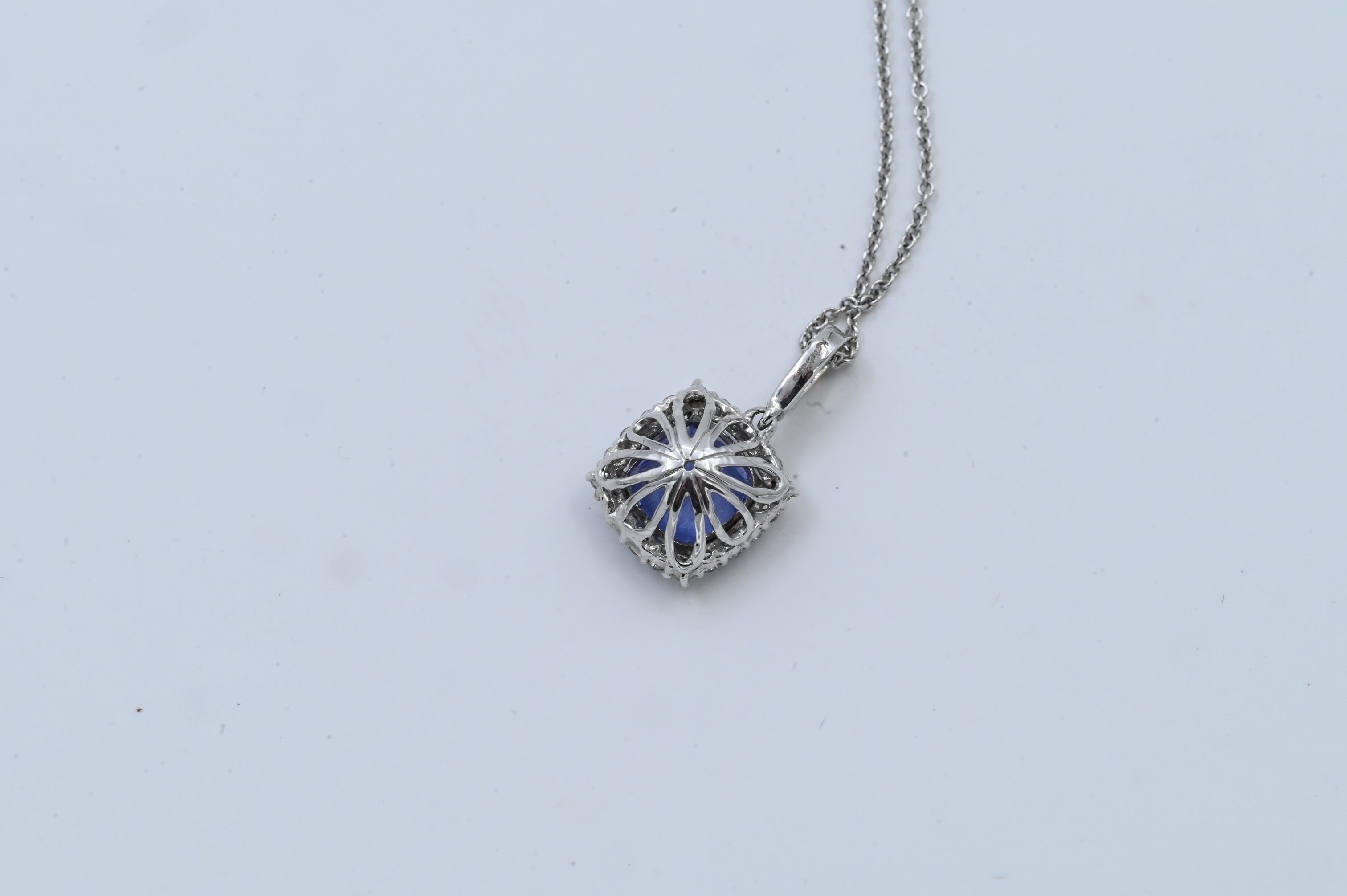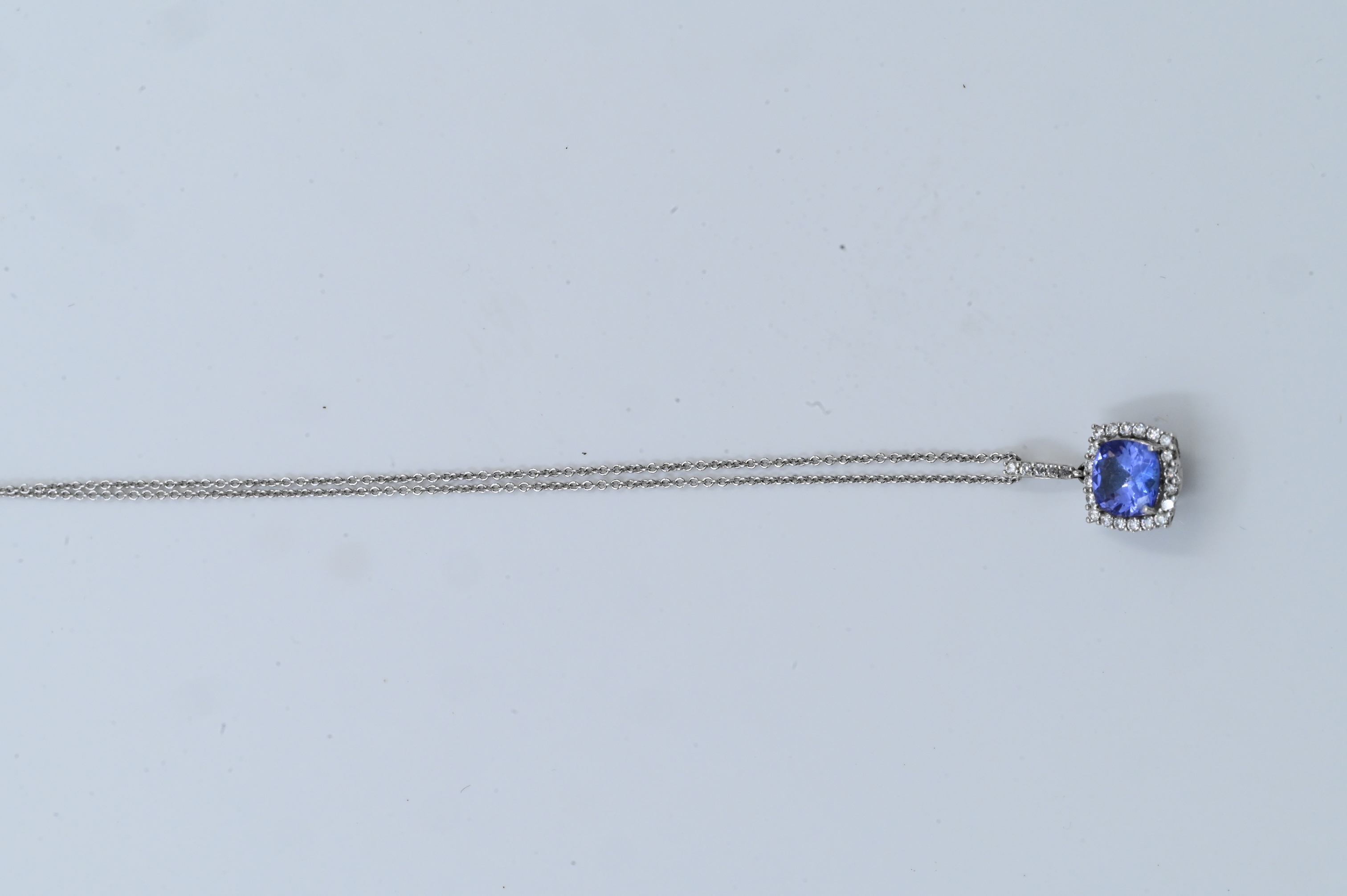 having diamonds surrounding a cushion cut, possibly Tanzanite
