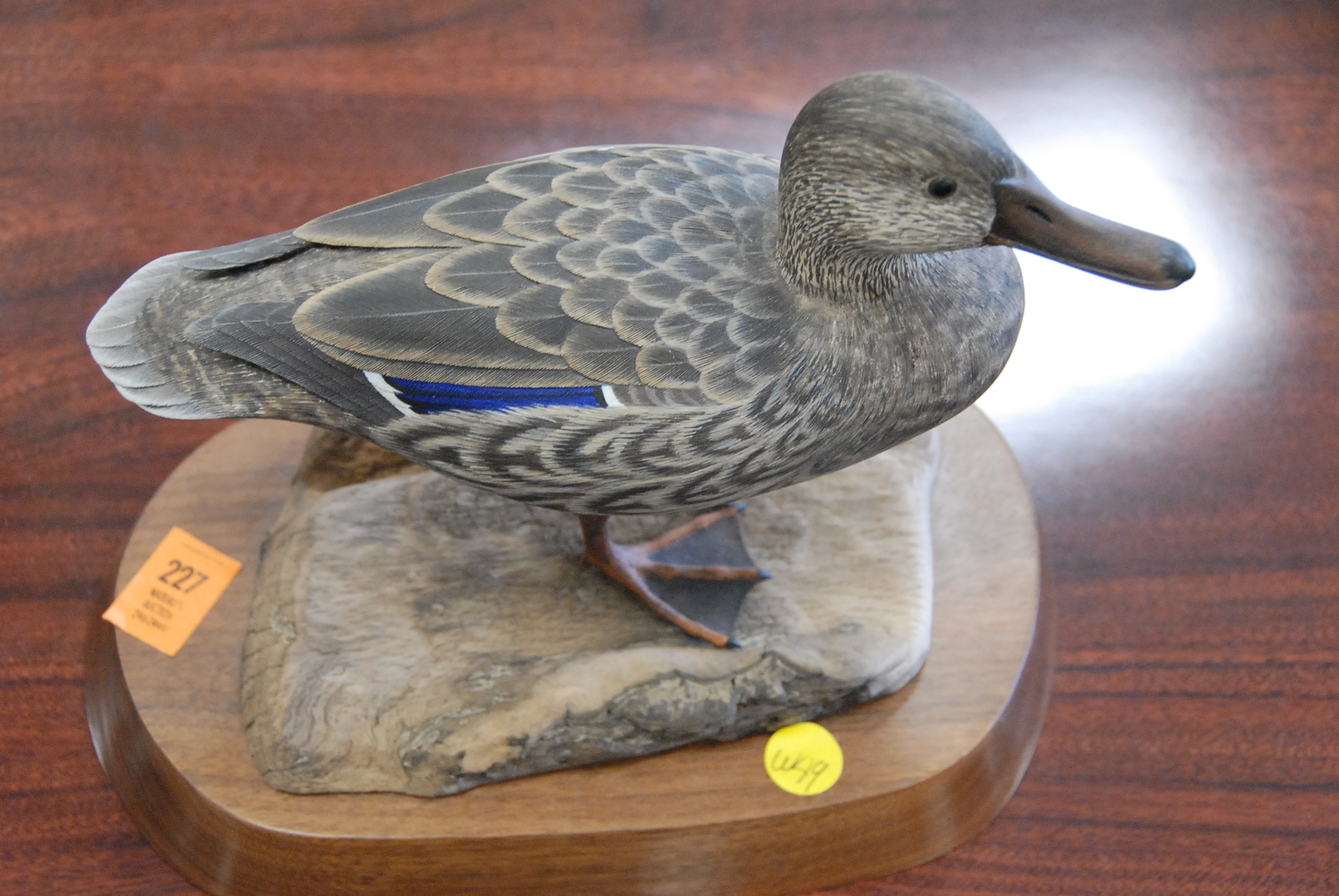 Carved and paint decorated duck figure signed Tom Ahern 1986.