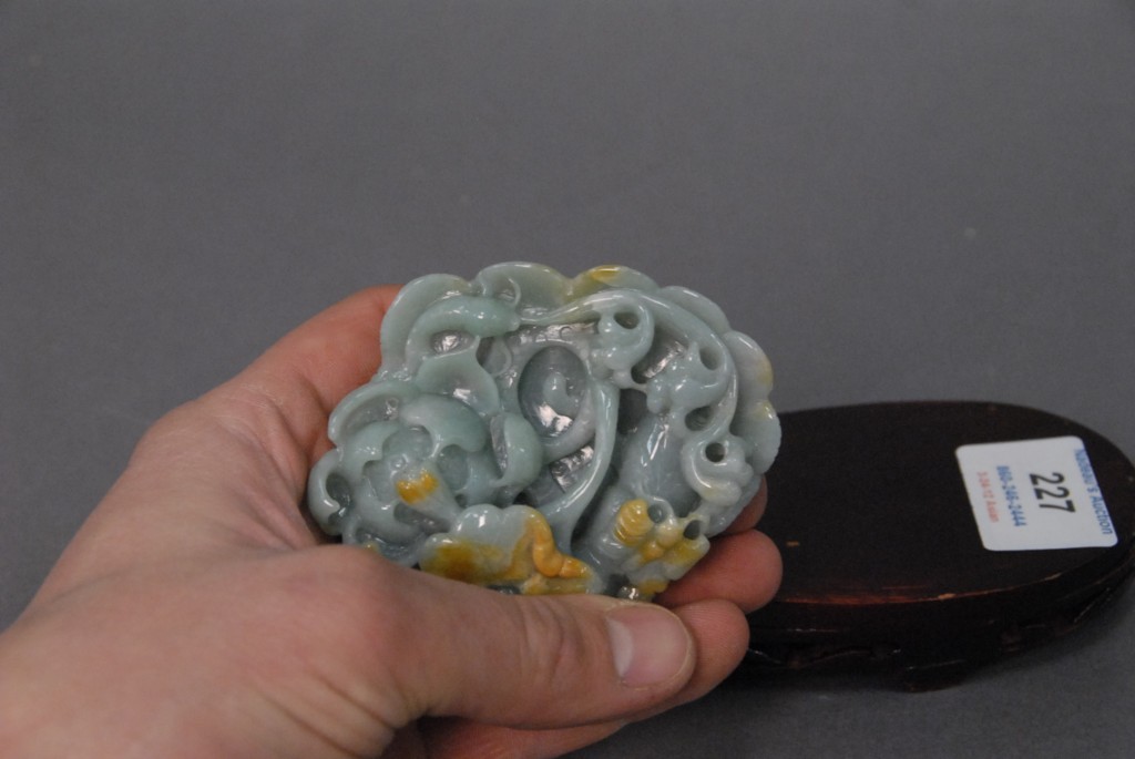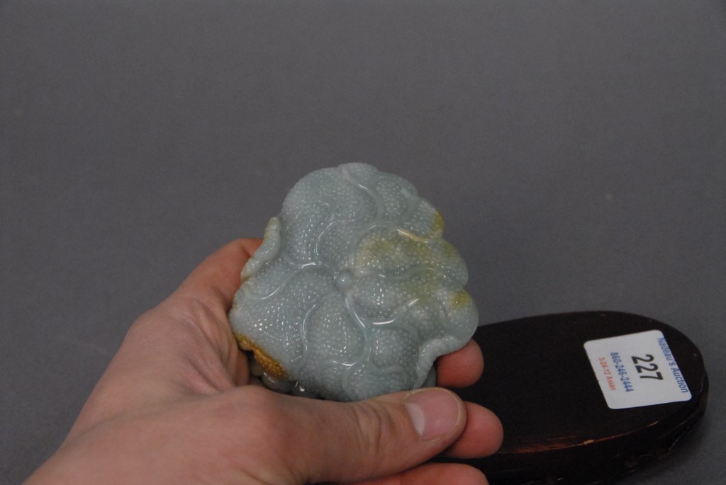 Lot 227: Carved jadeite lotus, larger intricately carved lotus having smaller high relief carved lotus, butterfly, and fish, about 3 dia