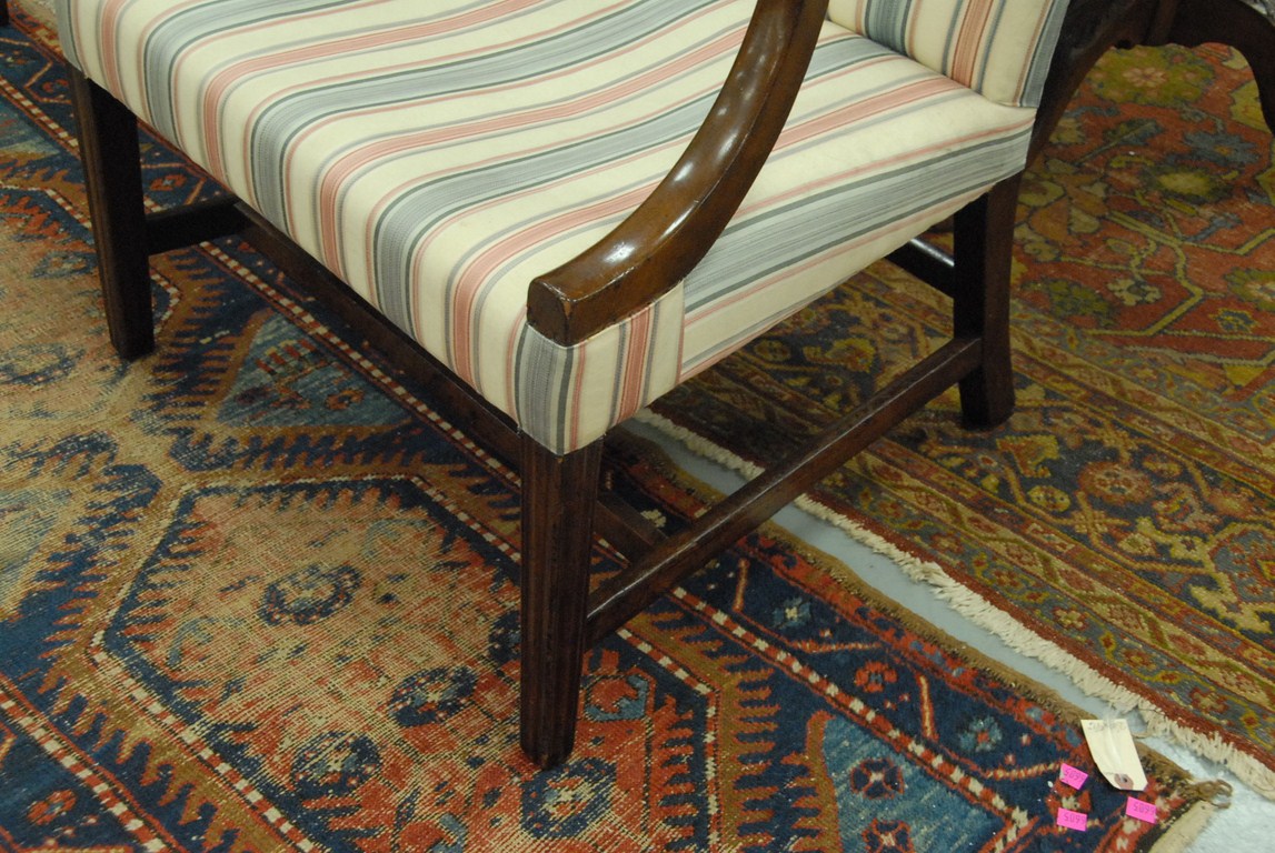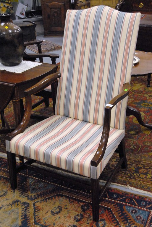 Lot 227: Federal cherry lolling chair with upholstered back and seat with open arms on molded square tapered legs, circa 1790-1810. seat ht…..
