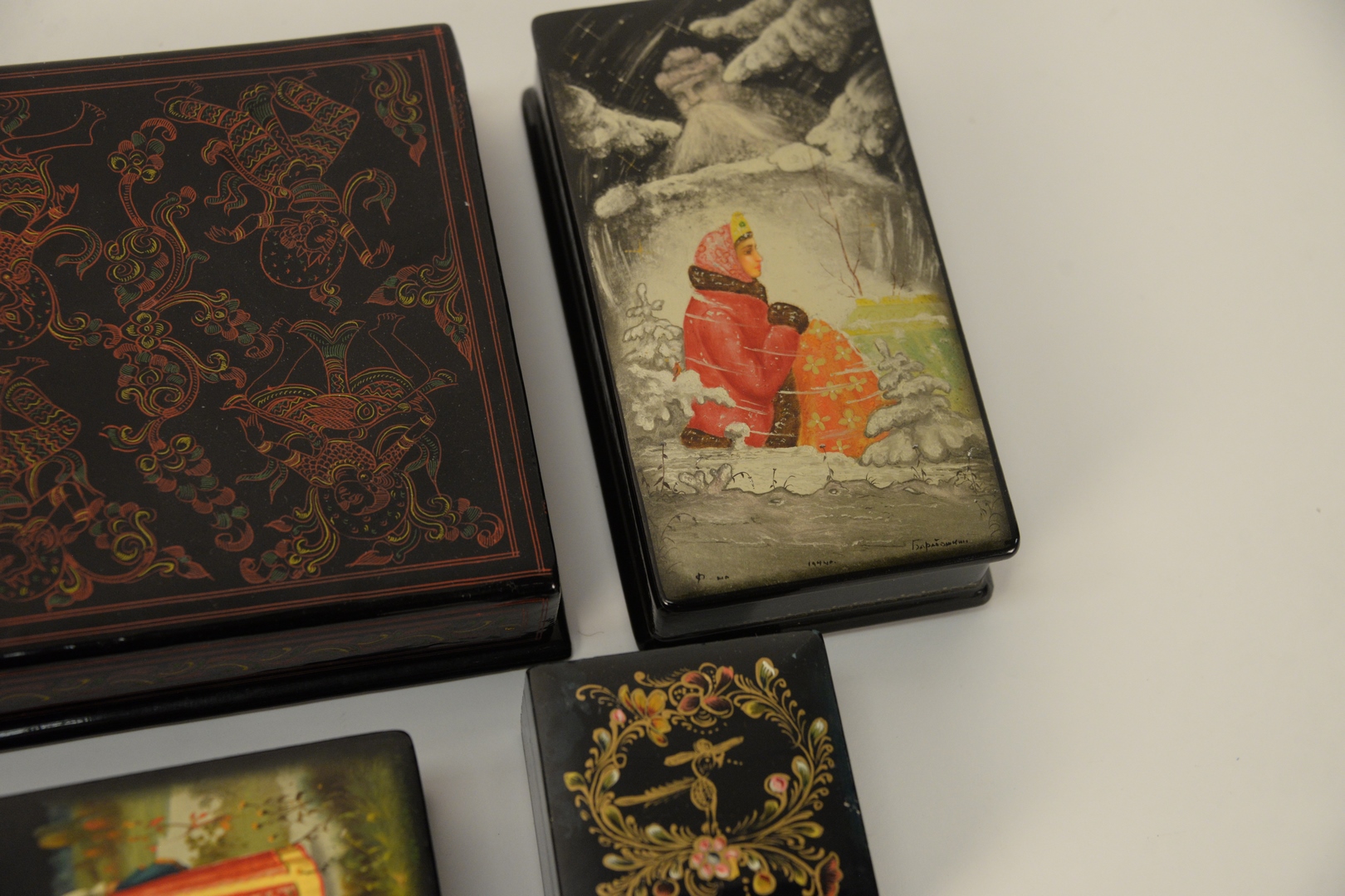 Group of Four Russian Lacquer Boxes, legends and fairy tale motif, manner of Palekh School, one marked 1924, signed illegibly; one having winter storm goddess, marked 1944, two others along with two books; largest 6″ x 9″. Provenance: The Estate of Alina Roisen, Park Avenue, New York.