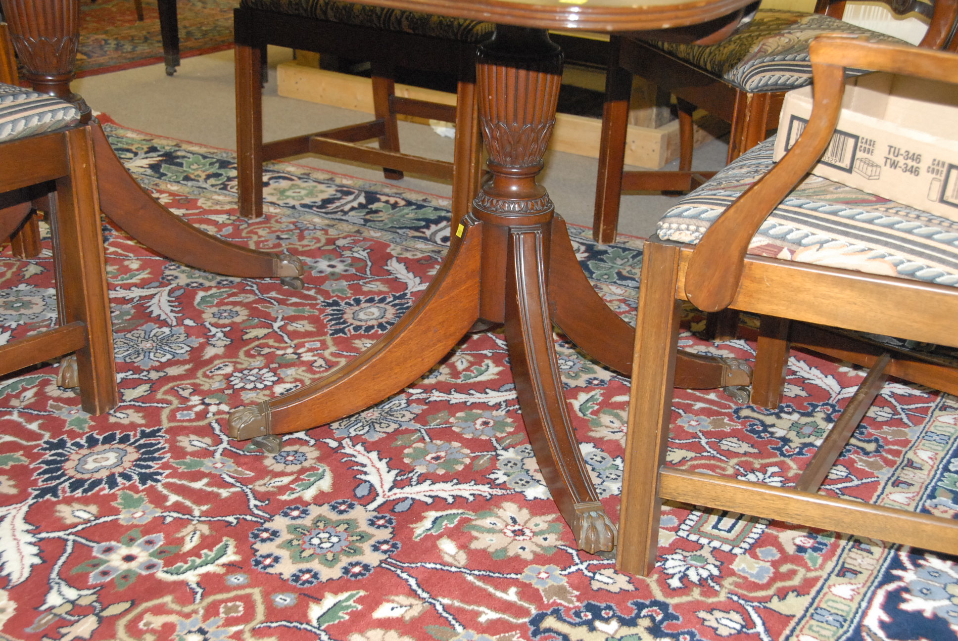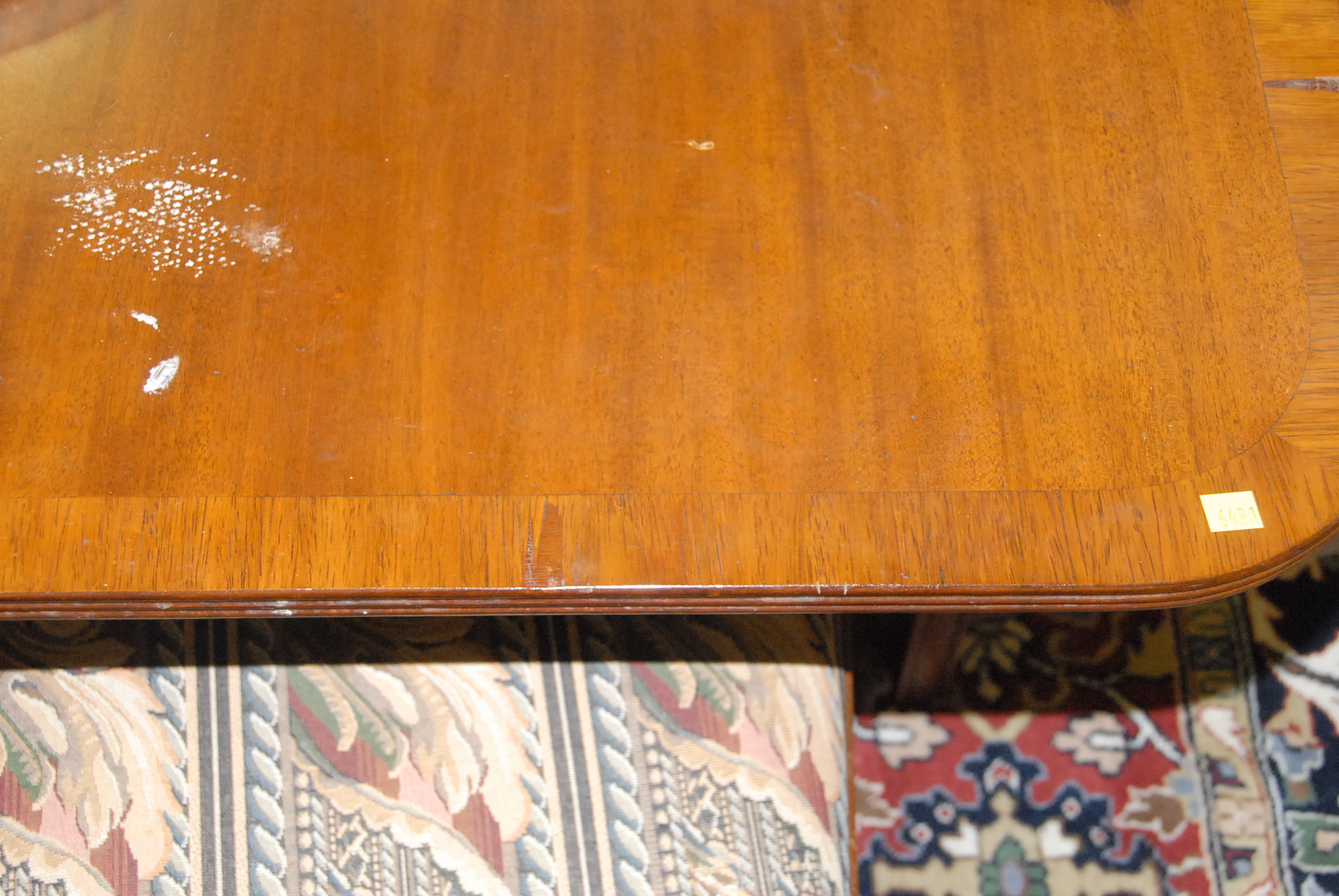 Lot 227: Mahogany double pedestal dining table with banded inlaid top and two extra leaves, top: 47 x 67 plus two 18 leaves. minor damage…
