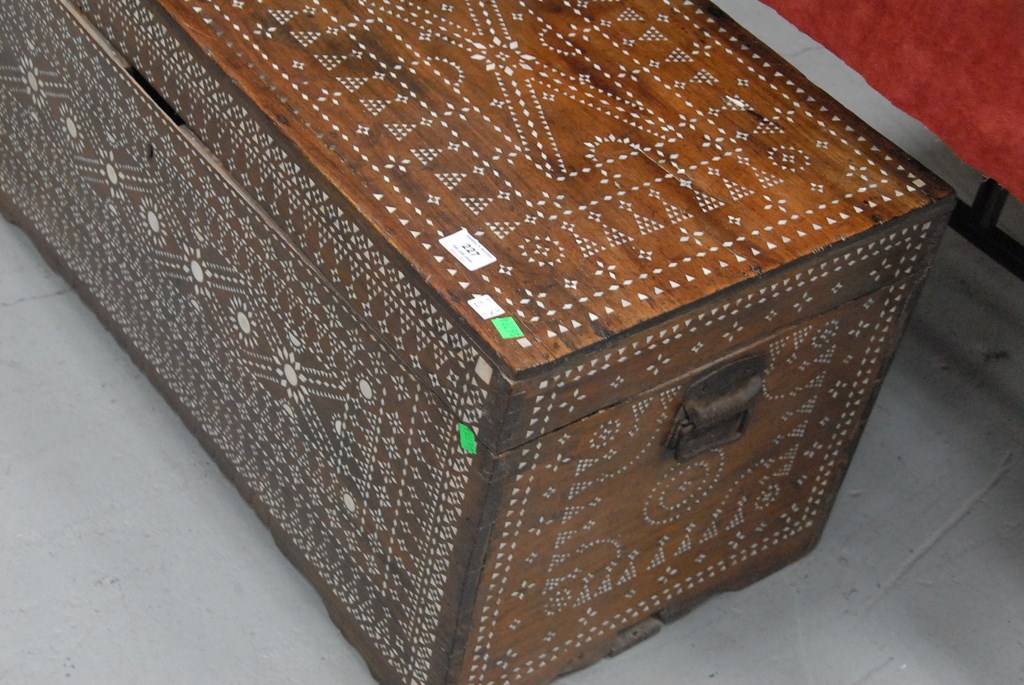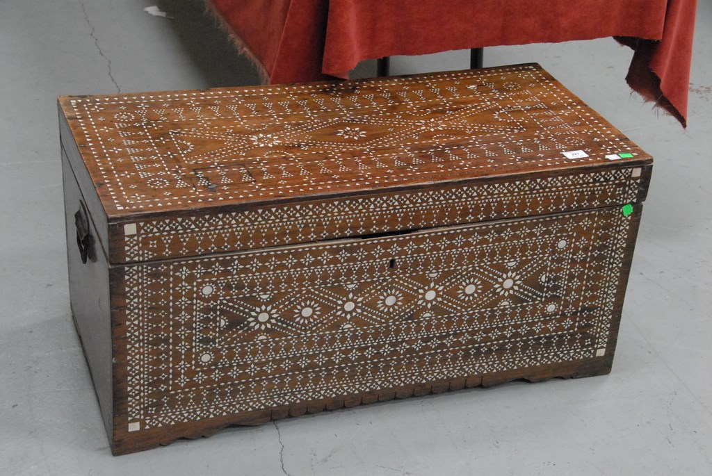 Mid Eastern lift top chest inlaid with mother of pearl. ht. 18in. wd. 36in.