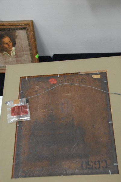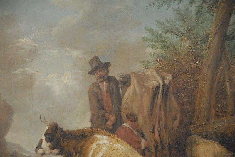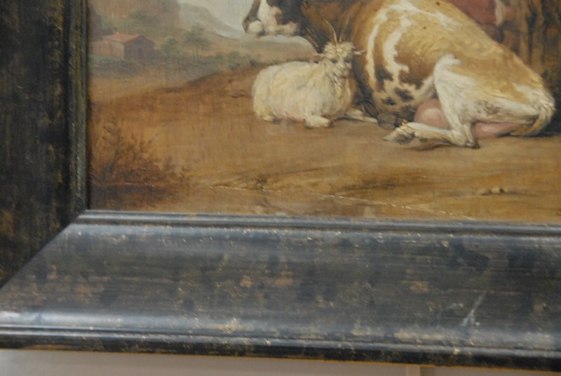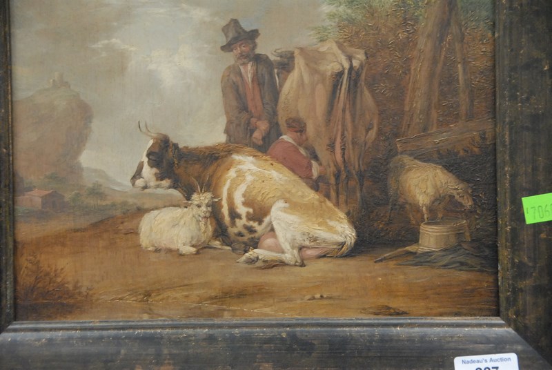 MILKING FARM SCENE oil on board signed lower right indistinctly Dotlers 14 x 12 1/4