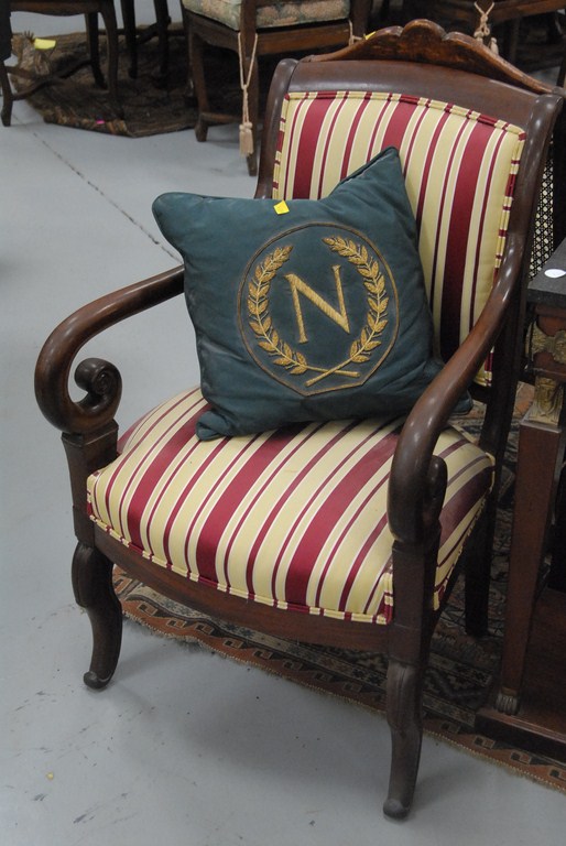 Pair of Charles X mahogany fauteuils with over scrolled back, scrolled arms, and bowed seats raised on cabriole legs headed by lappets and upholstered in yellow and red stripped silk fabric with pillows with the royal Cipher of Napoleon, early 19th century. Provenance: From prominent Woodbridge, Connecticut family collection.