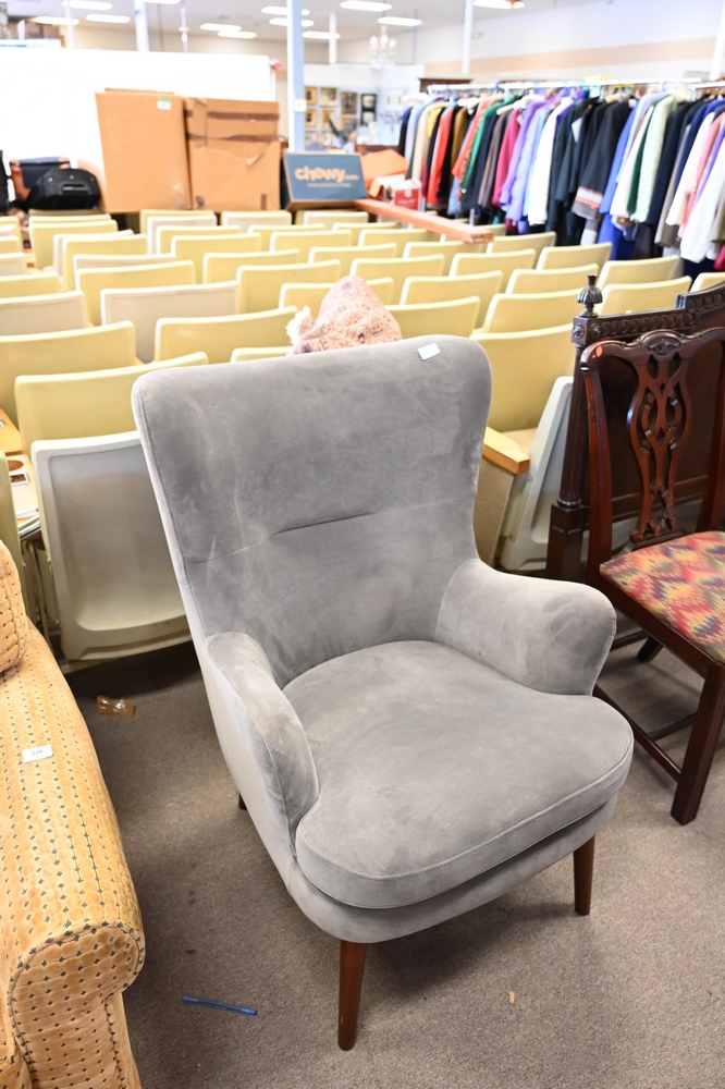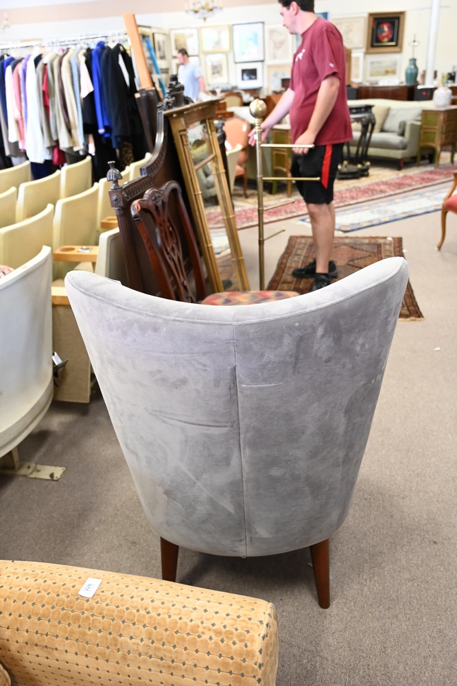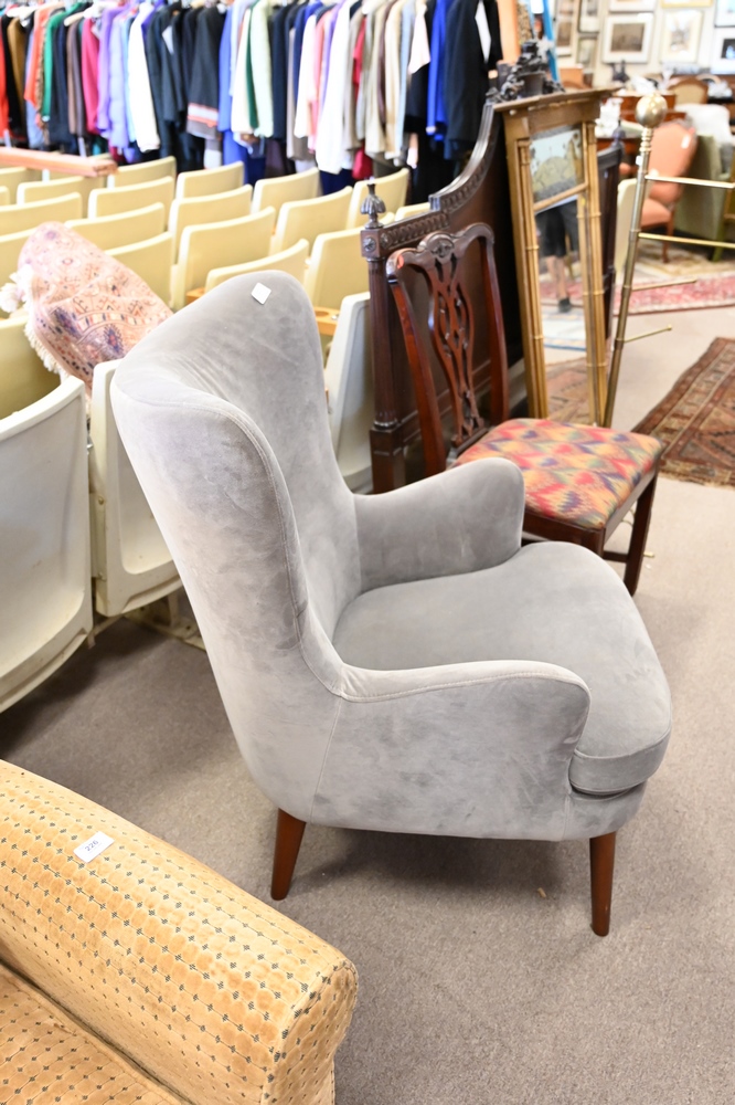 Lot 227: Pair of Contemporary Barrel Back Upholstered Wing Chairs, seat height 18 1/2 inches.