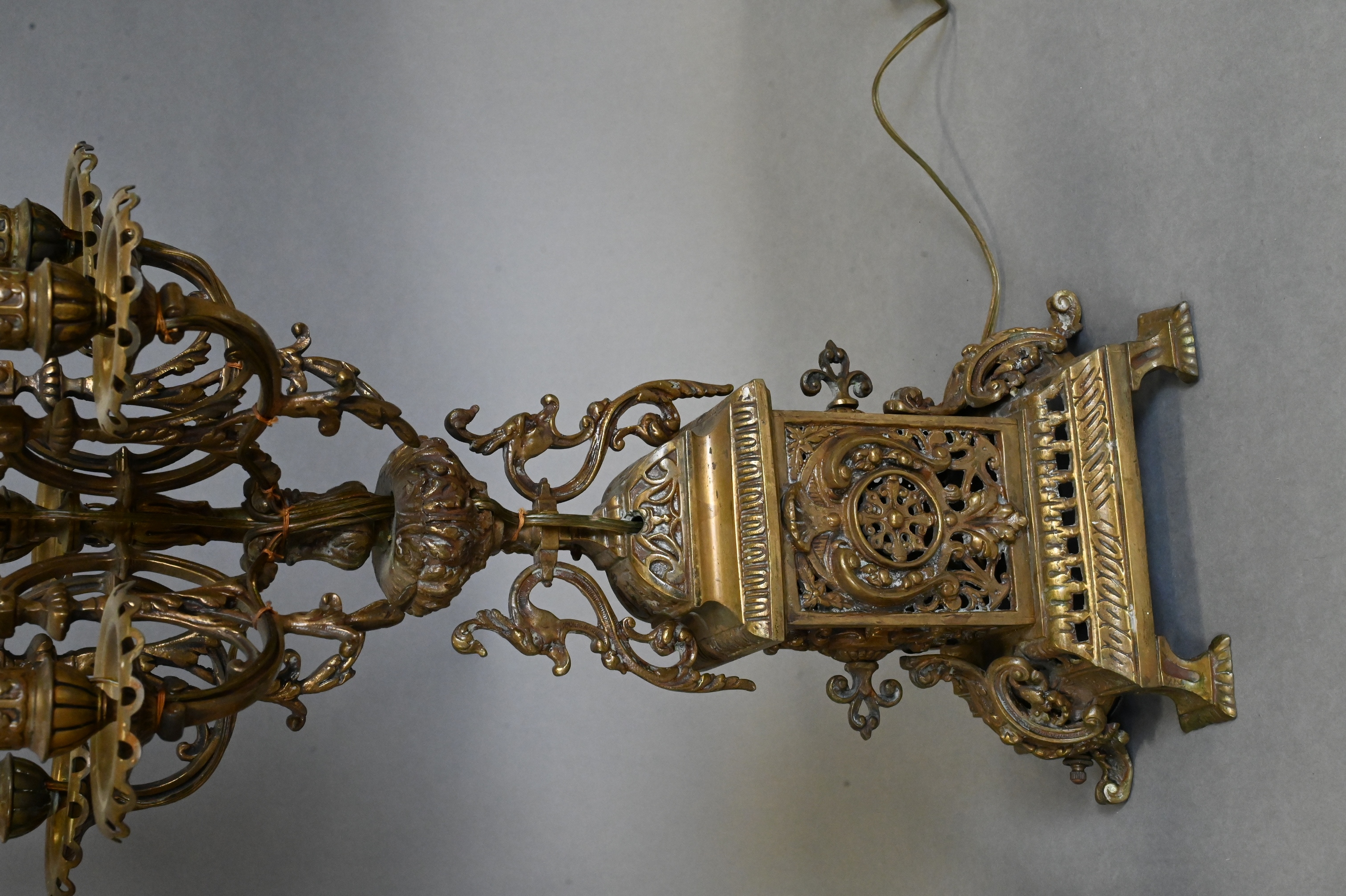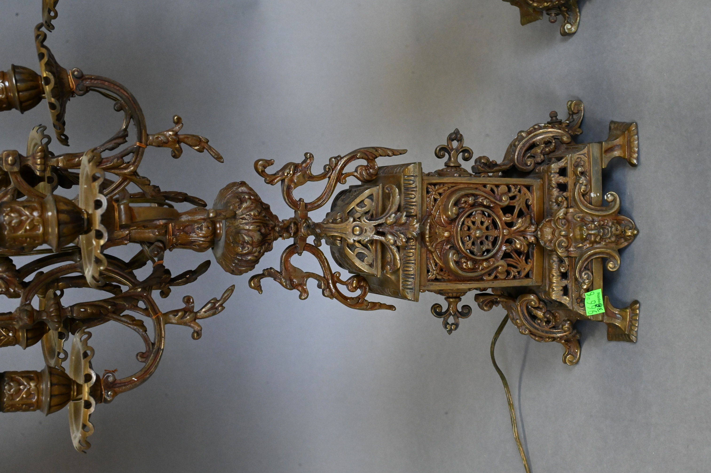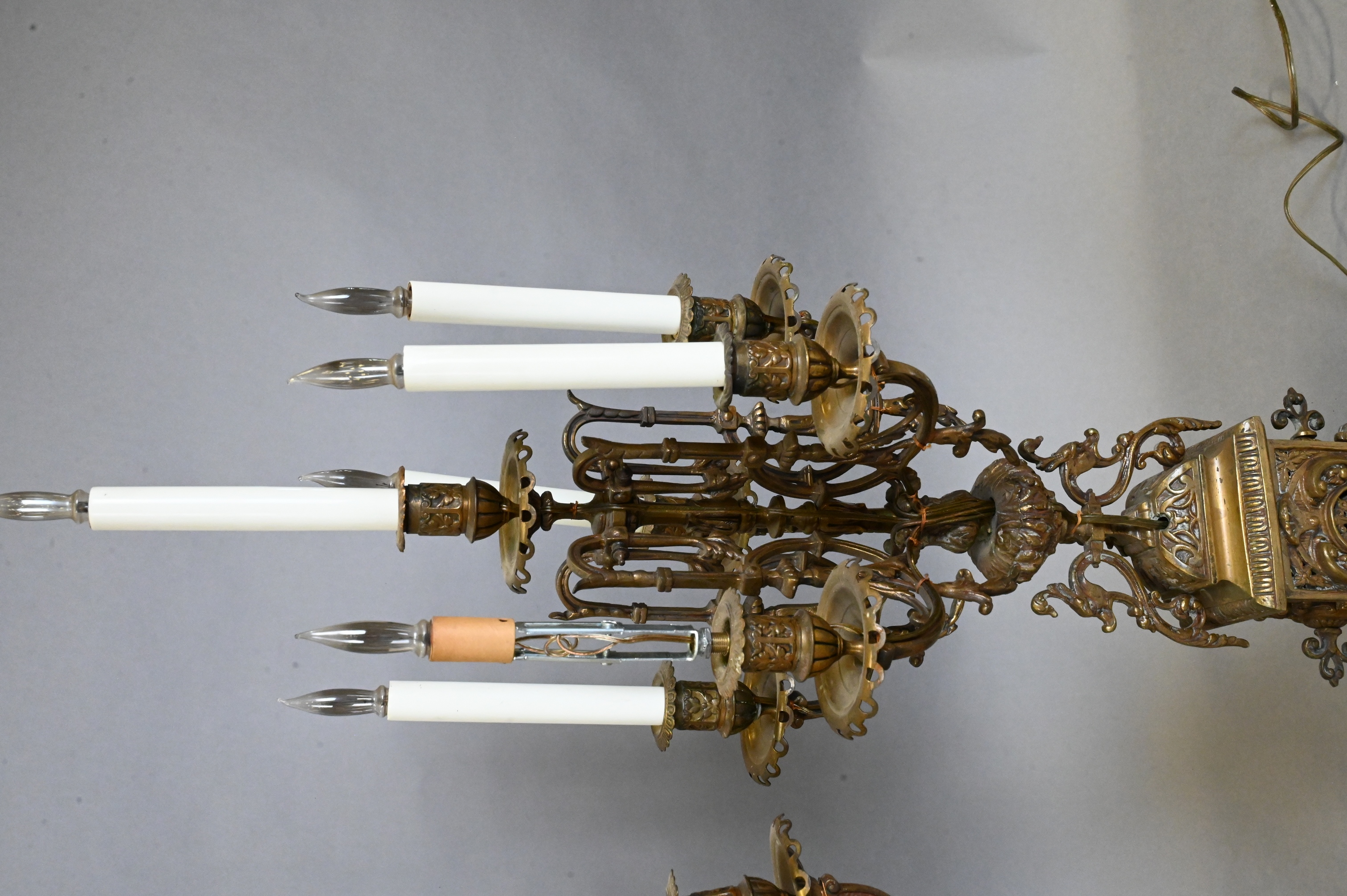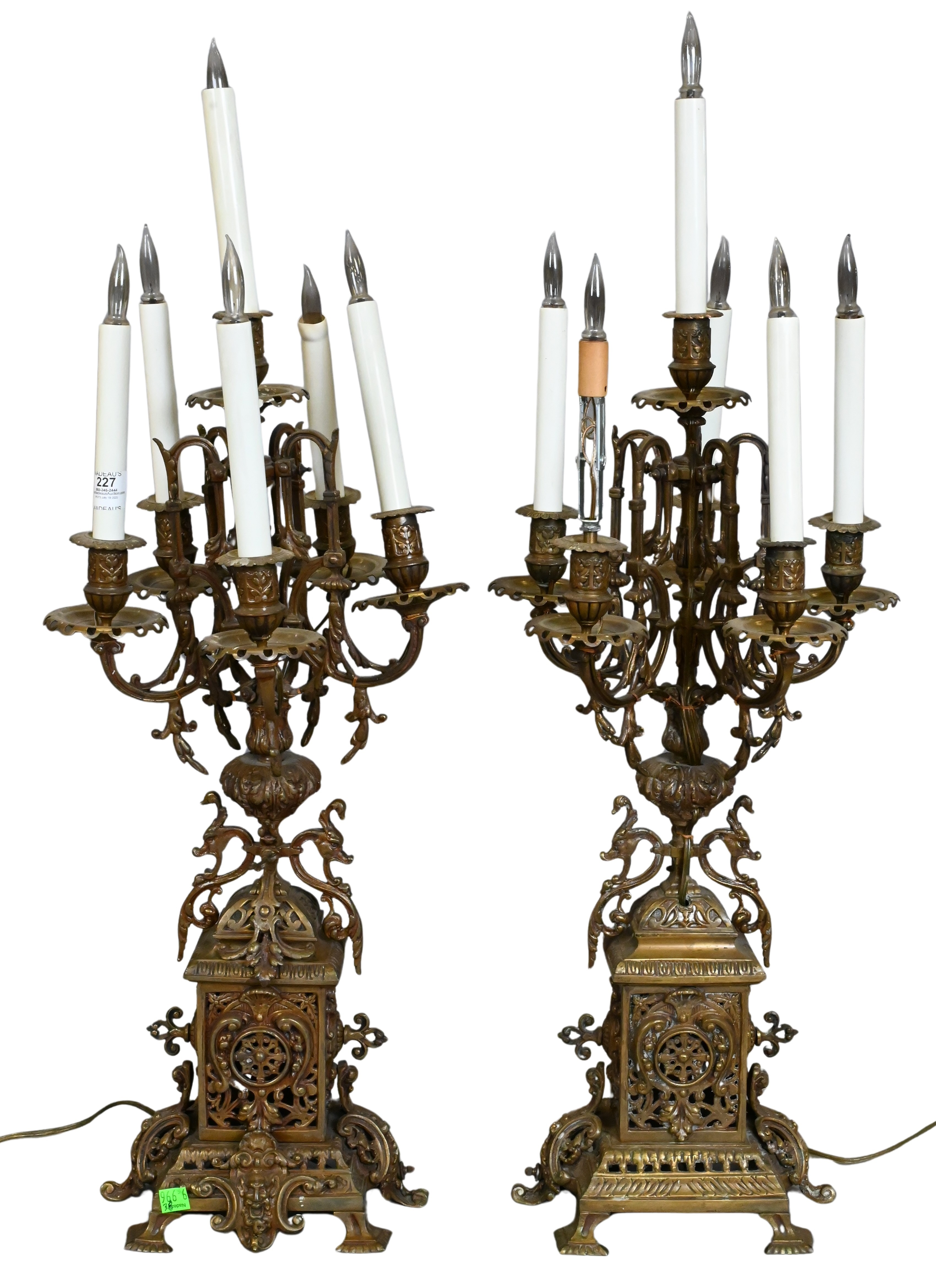 each having six lights over ornate openwork base with scrolling foliate, swans, and portrait bust accents