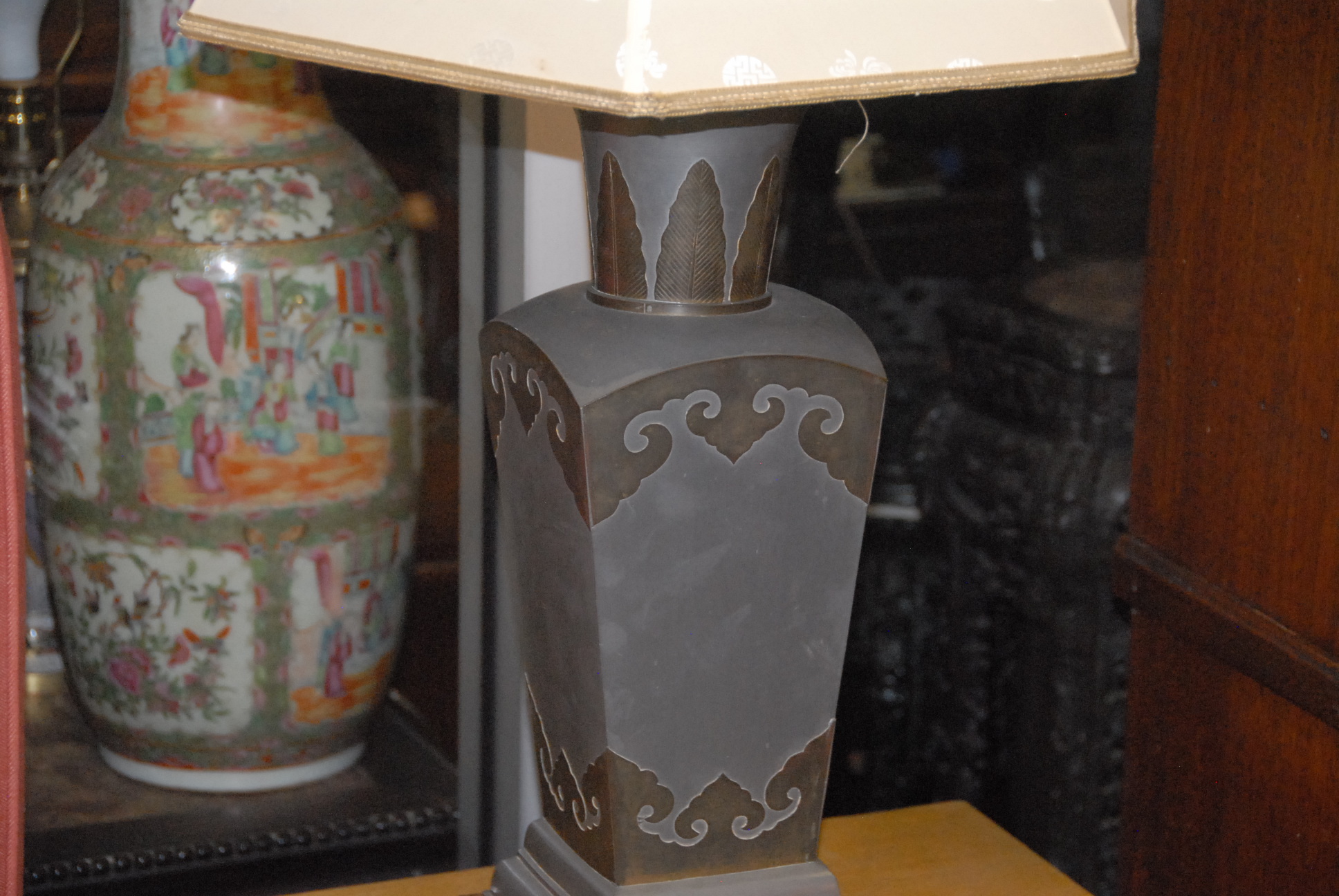 Pair of pewter table lamps with brass trims, ht. 20in.