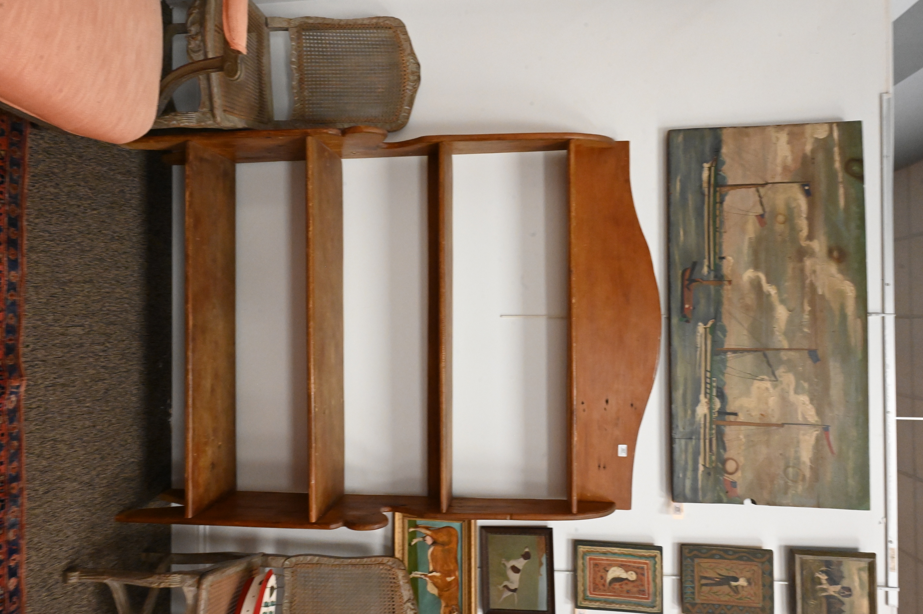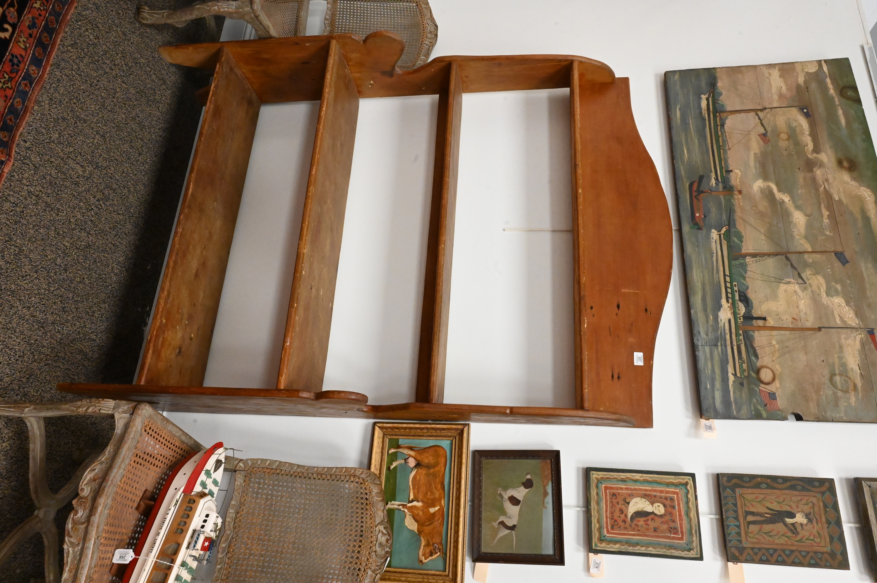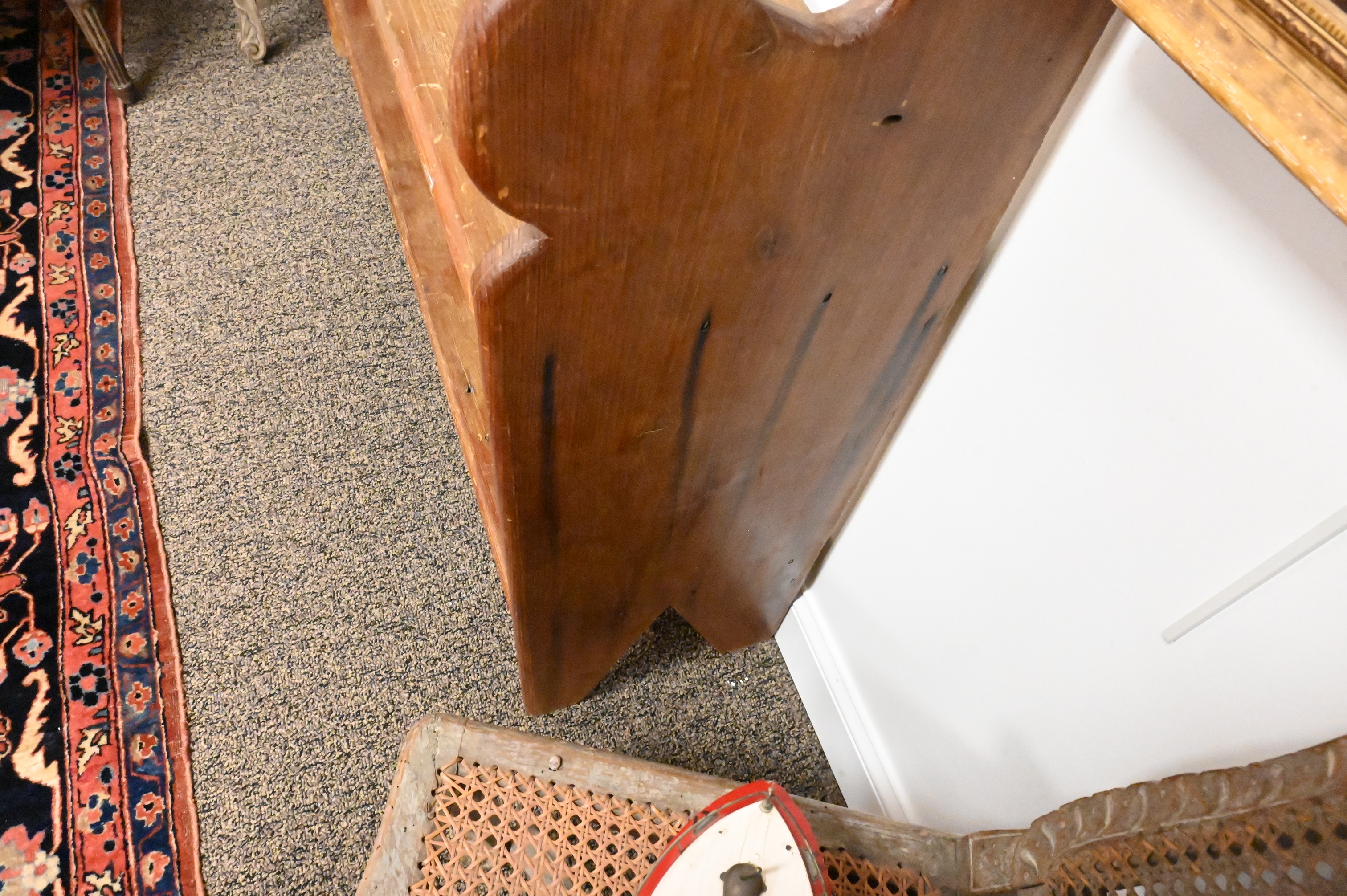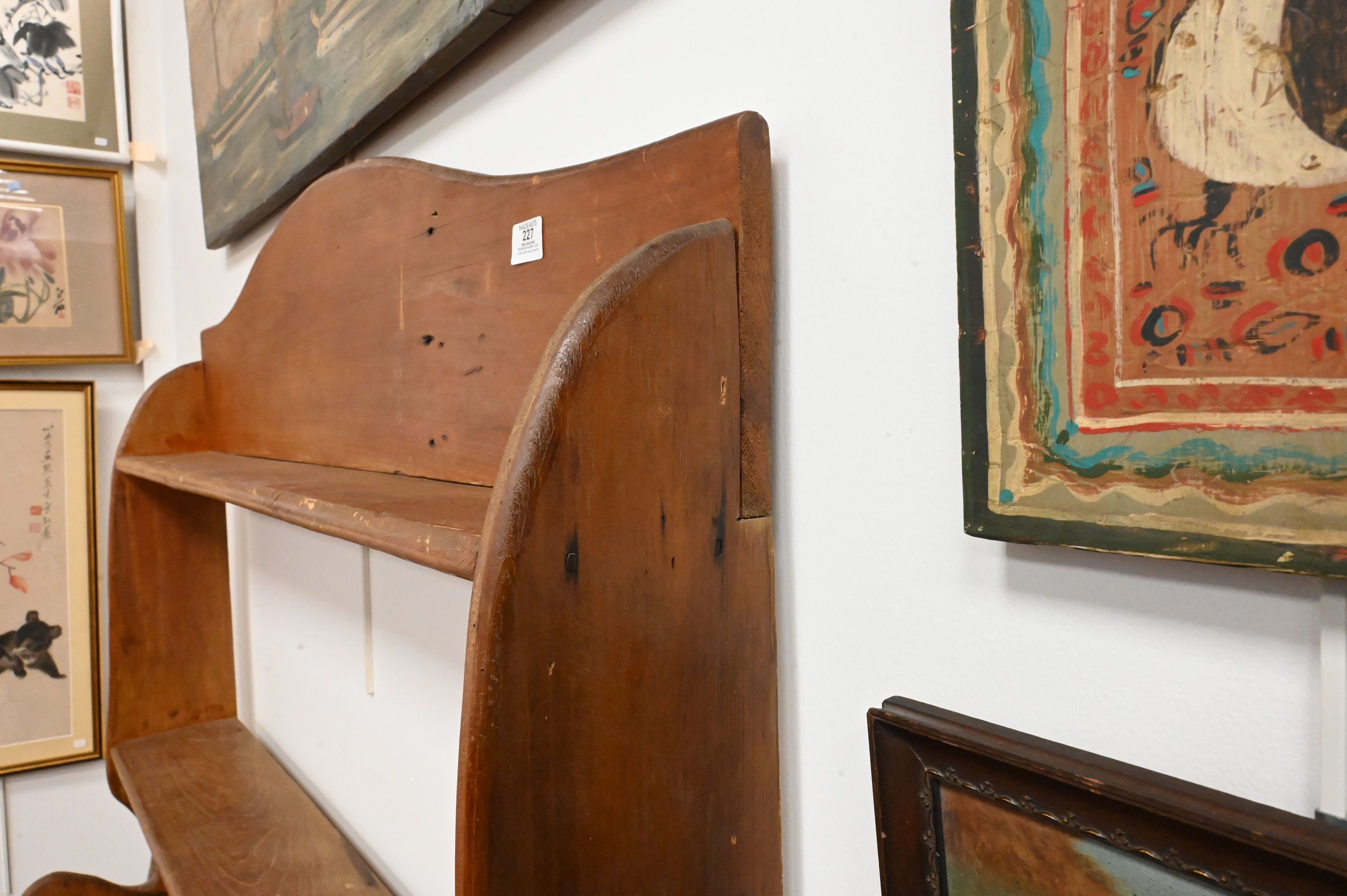 four-tier pine shelf with shaped crest above three graduated shelves and lower shelf, the sides cut with distinctive bootjack-form ends.