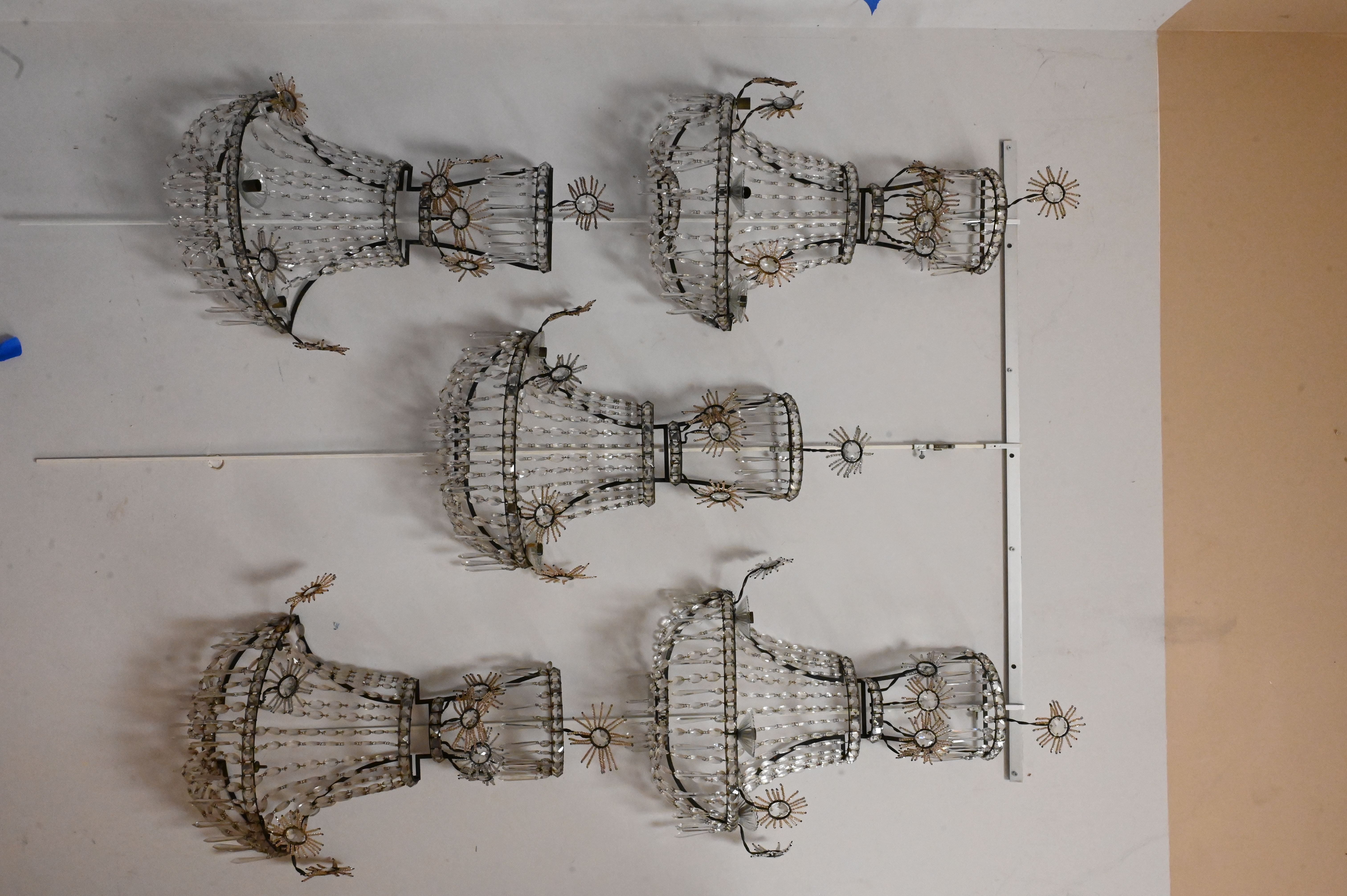set of five basket-form wall lights, each with a metal frame hung with strings of oval and faceted cut-glass prisms, terminating in a circular lower band, upper register fitted with radiating starburst appliqués centered by cut-glass rosettes